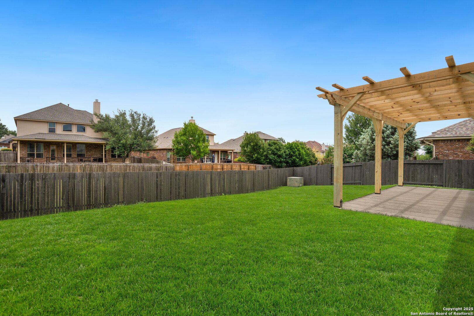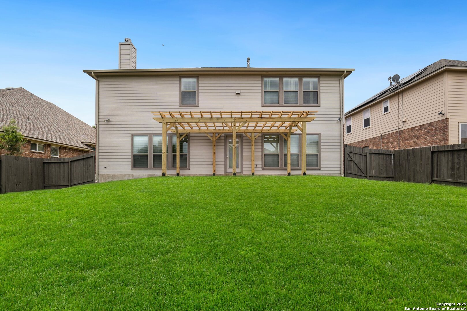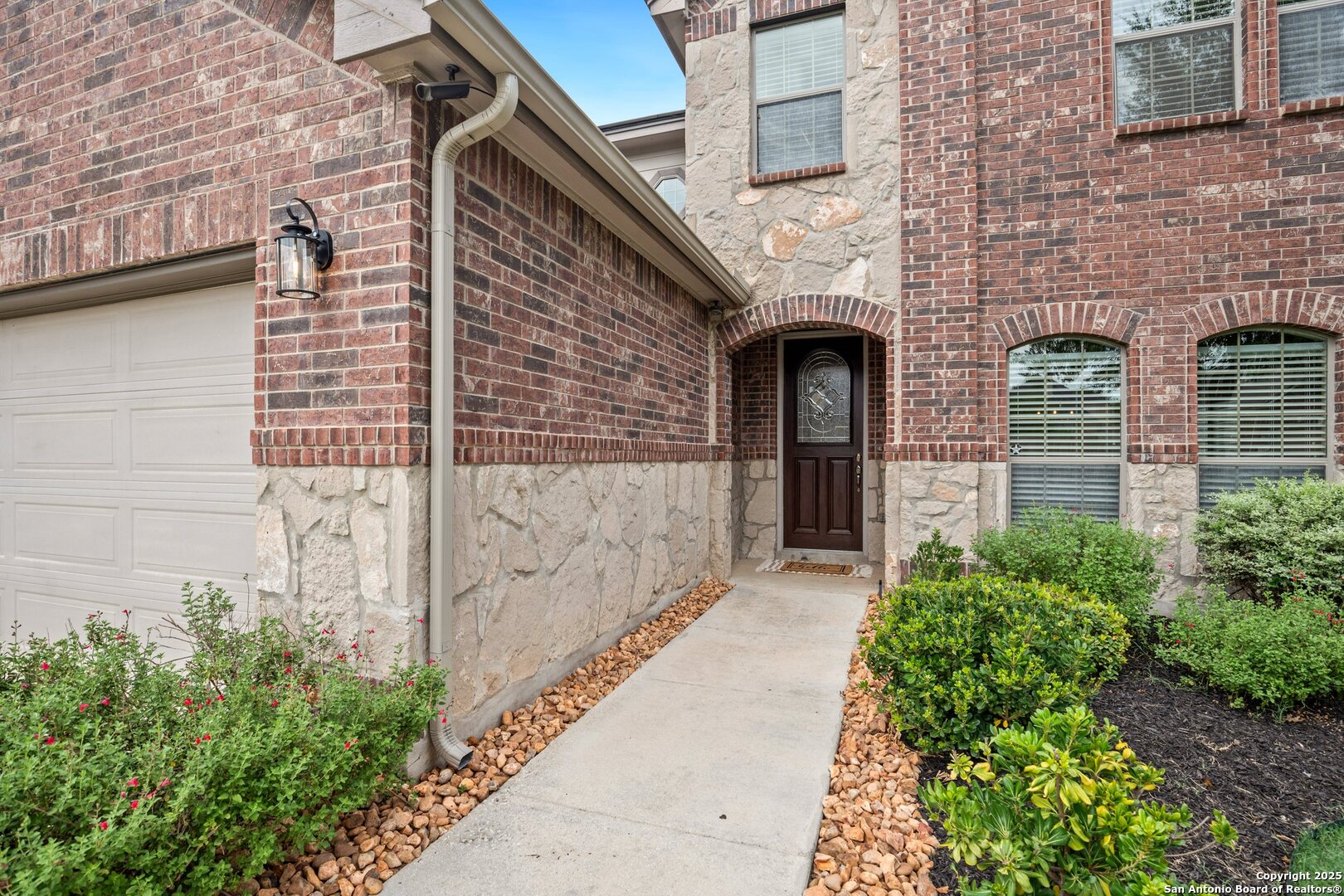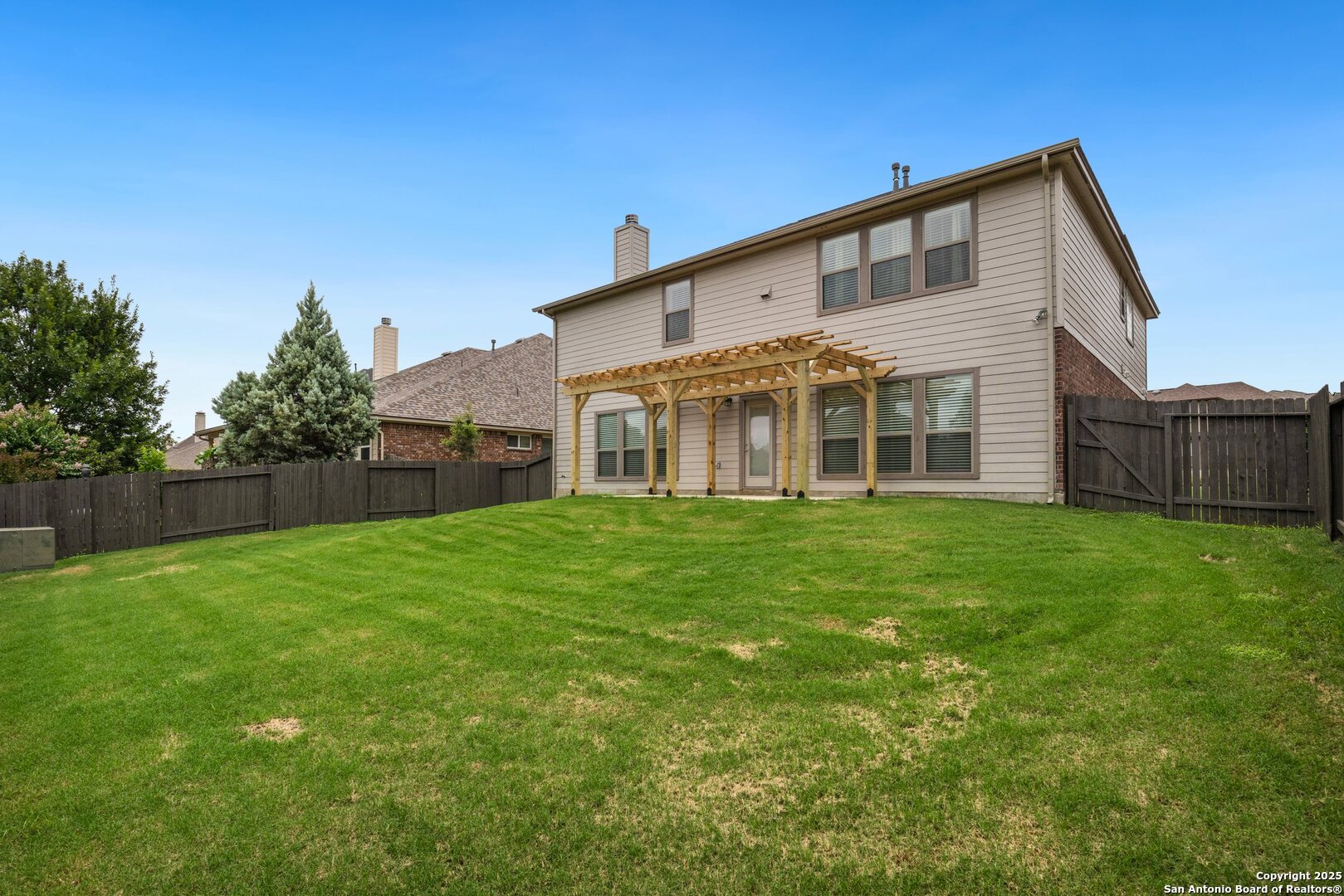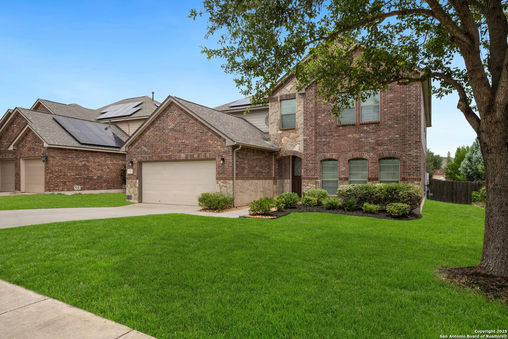 Spacious and move-in ready, this 2-story, 5-bedroom, 3-bath home is located in the popular Alamo Ranch community includes a first floor guest suite with full bath. Thoughtfully updated throughout, the home features brand new luxury vinyl plank flooring, fresh carpet, and a newly added exterior pergola. Major upgrades include a new roof, oven, and AC condenser-all installed in 2023. The property also includes a full sprinkler system and an owned 7.2kW solar panel setup for added energy efficiency. All bathrooms have brand new toilets. The light-filled, open-concept layout offers plenty of space for everyday living and entertaining. The first floor features a formal living and dining combo, as well as a second large living area with a fireplace and built-in shelving that flows into the kitchen and breakfast nook. The kitchen includes stainless steel appliances, gas cooking, and generous cabinetry for storage. A secondary bedroom on the first floor adds flexibility for guests or an office. Upstairs, the expansive primary suite includes a private bath with a soaking tub, walk-in shower, and generous closet space. Three additional secondary bedrooms, each with walk-in closets, surround a central loft-style living area that can be used as a game room or playroom. This Energy Star Qualified home has natural gas furnaces that perform well even during colder months. Ample storage throughout the home adds convenience. There is something for everyone in Alamo Ranch. Top-notch community amenities include a swimming pool, playground, tennis and basketball courts. Located just minutes from HEB, restaurants, this property is ready for its next chapter. Schedule your personal tour today!