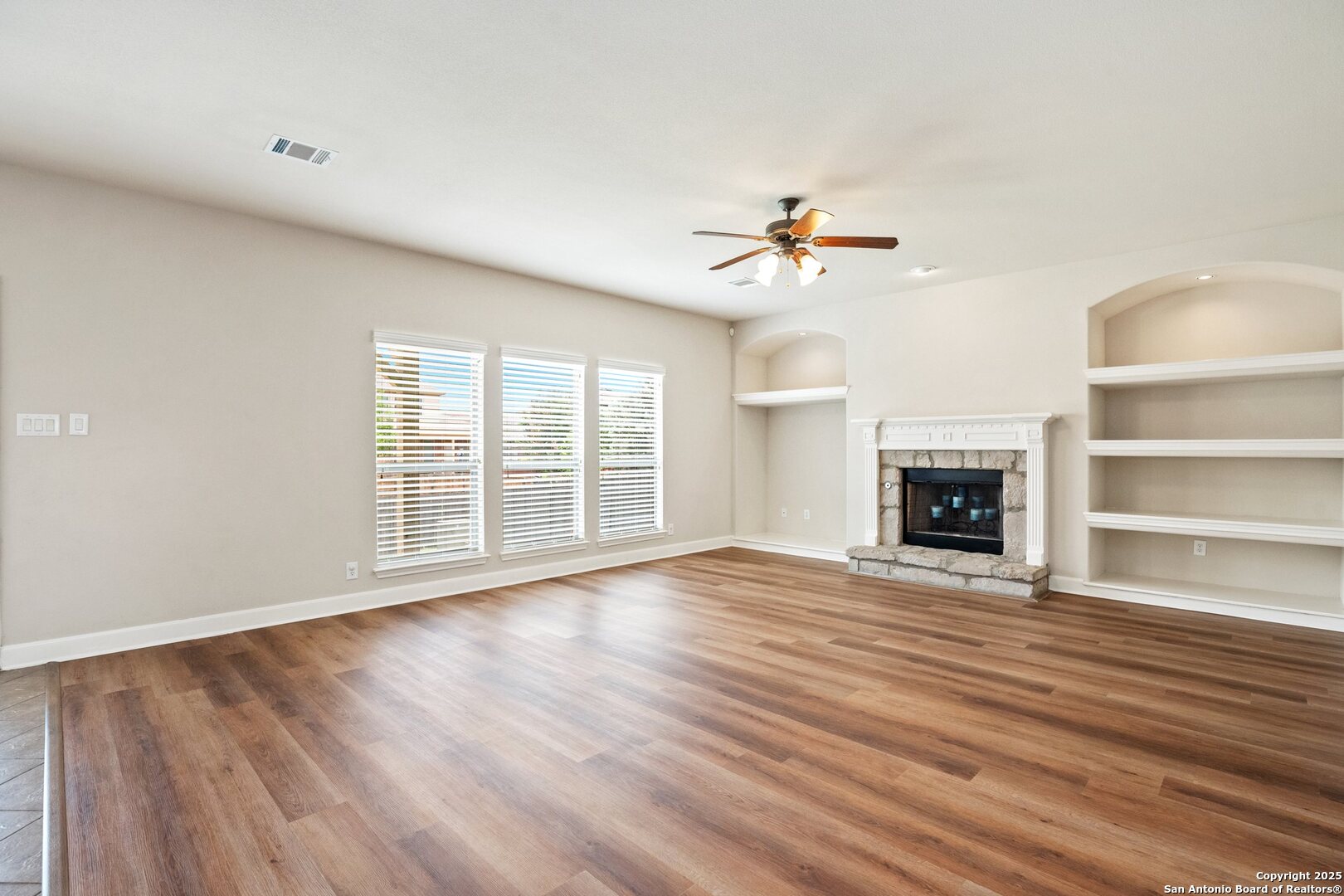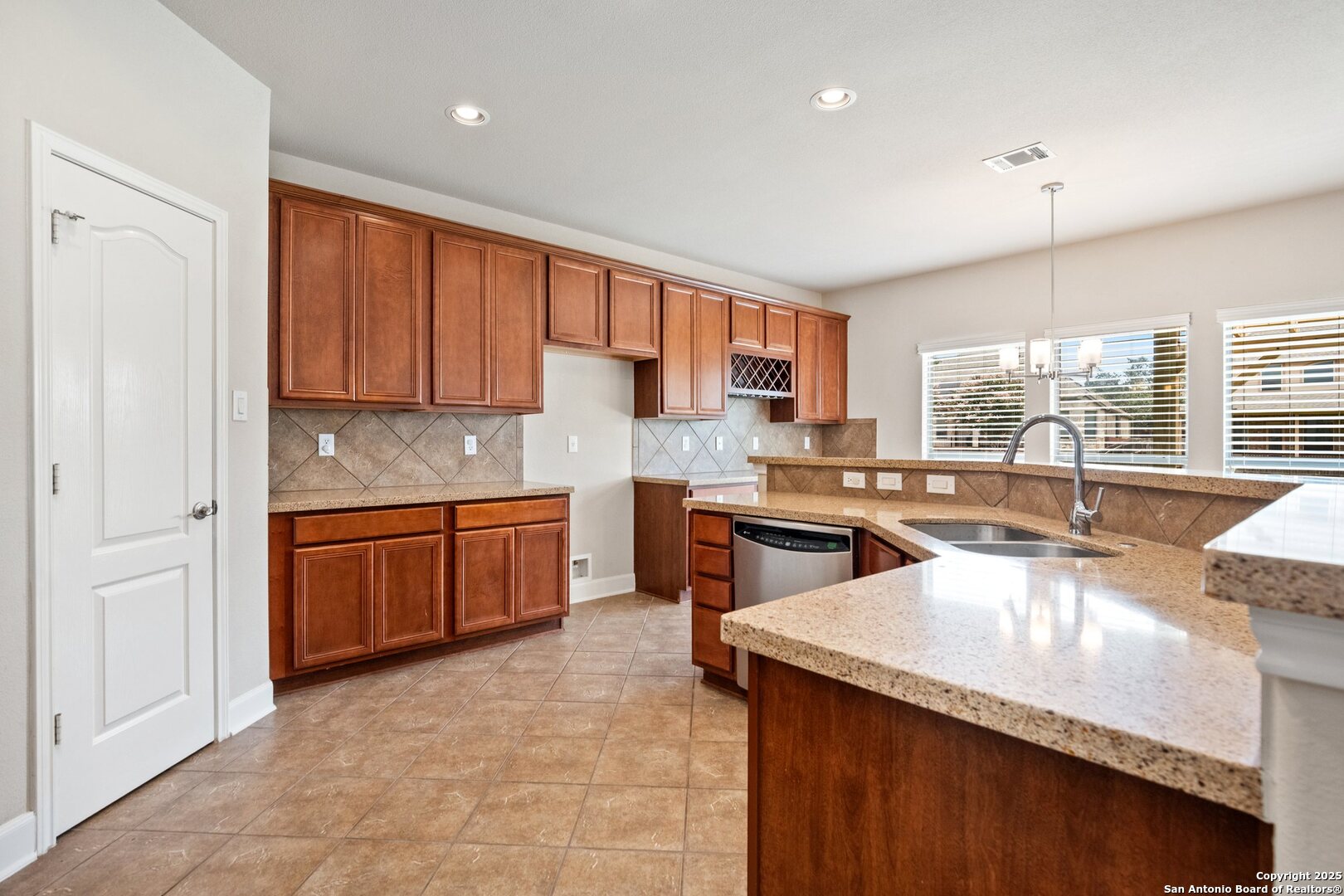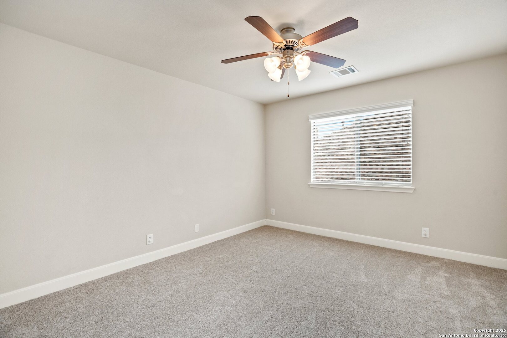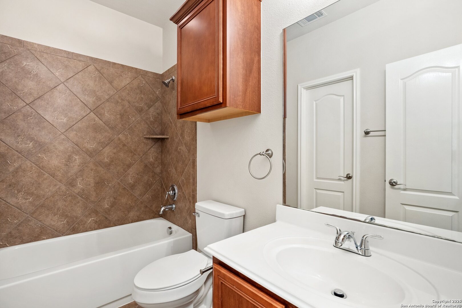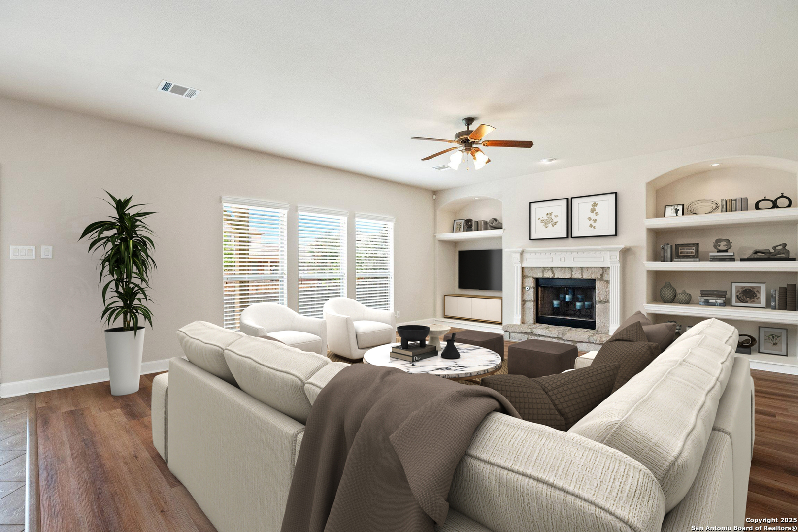 Spacious and move-in ready, this 2-story, 5-bedroom, 3-bath home is located in the popular Alamo Ranch community includes a first floor guest suite with full bath. Thoughtfully updated throughout, the home features brand new luxury vinyl plank flooring, fresh carpet, and a newly added exterior pergola. Major upgrades include a new roof, oven, and AC condenser-all installed in 2023. The property also includes a full sprinkler system and an owned 7.2kW solar panel setup for added energy efficiency. All bathrooms have brand new toilets. The light-filled, open-concept layout offers plenty of space for everyday living and entertaining. The first floor features a formal living and dining combo, as well as a second large living area with a fireplace and built-in shelving that flows into the kitchen and breakfast nook. The kitchen includes stainless steel appliances, gas cooking, and generous cabinetry for storage. A secondary bedroom on the first floor adds flexibility for guests or an office. Upstairs, the expansive primary suite includes a private bath with a soaking tub, walk-in shower, and generous closet space. Three additional secondary bedrooms, each with walk-in closets, surround a central loft-style living area that can be used as a game room or playroom. This Energy Star Qualified home has natural gas furnaces that perform well even during colder months. Ample storage throughout the home adds convenience. There is something for everyone in Alamo Ranch. Top-notch community amenities include a swimming pool, playground, tennis and basketball courts. Located just minutes from HEB, restaurants, this property is ready for its next chapter. Schedule your personal tour today!