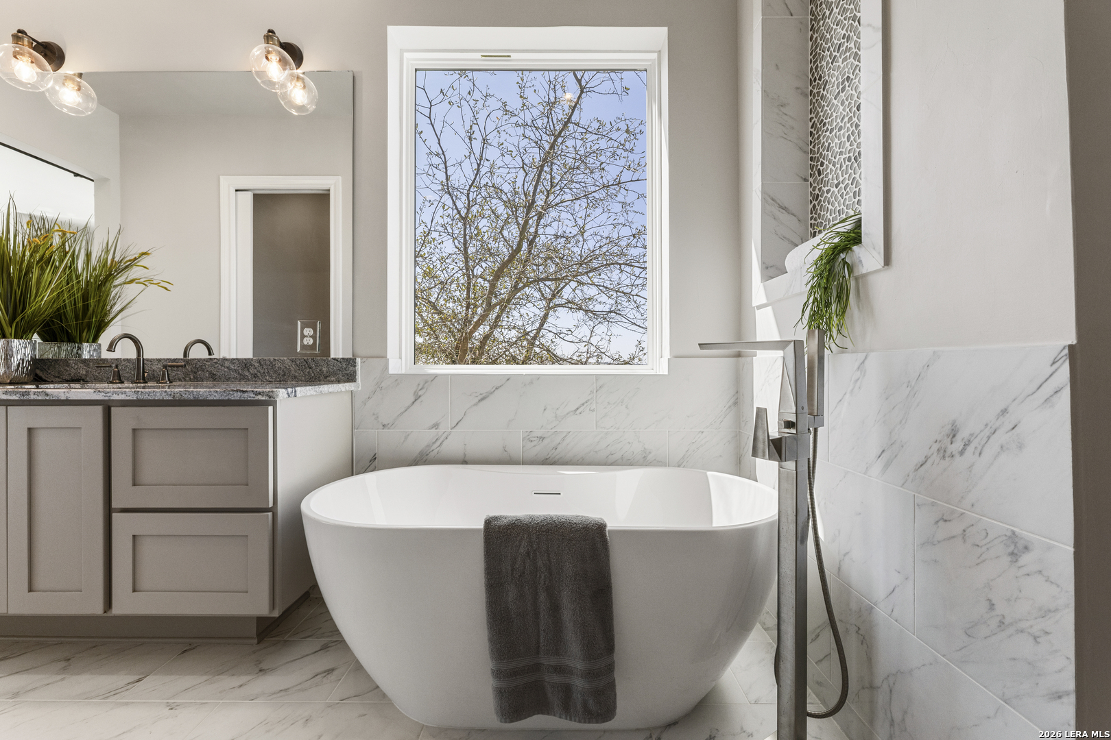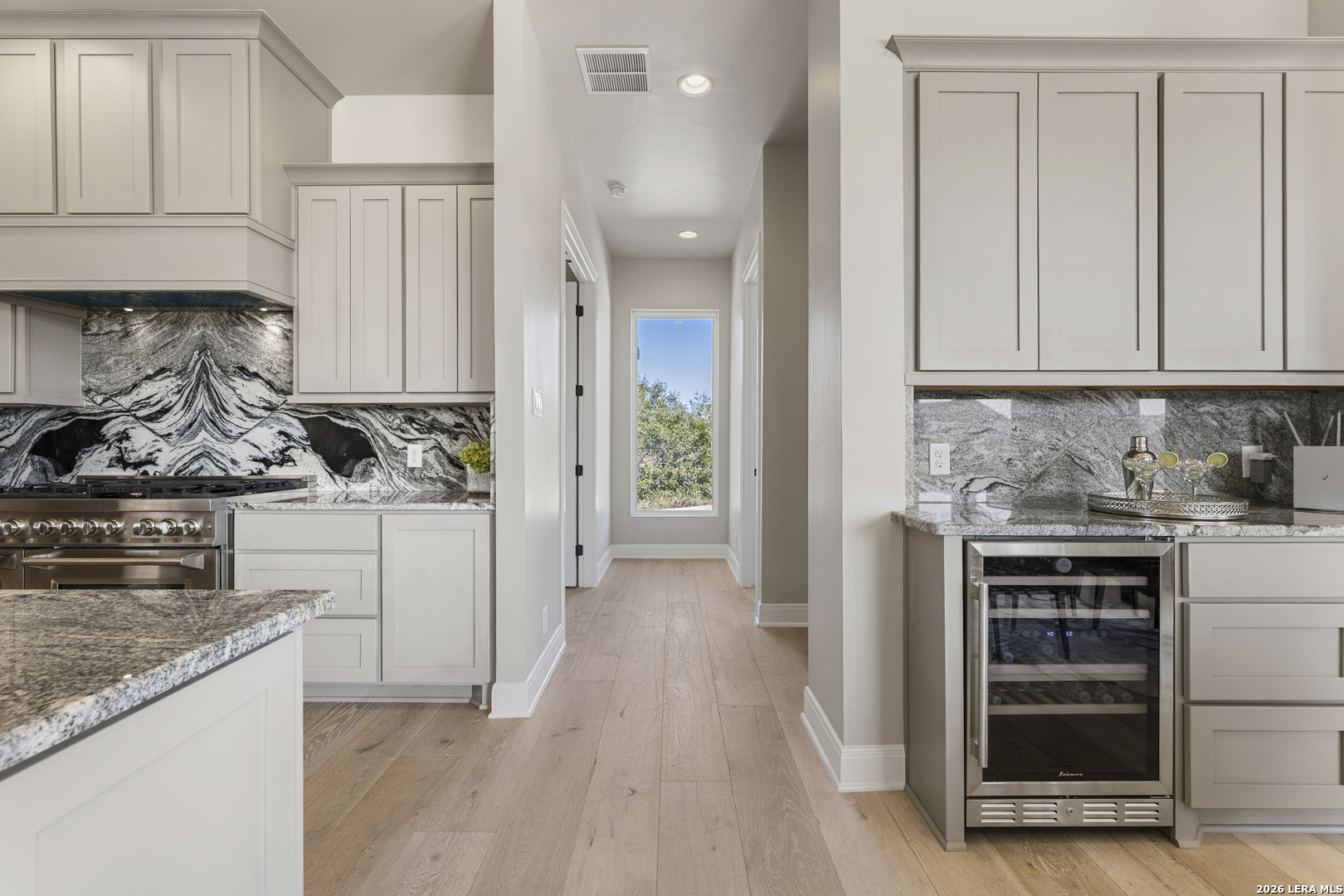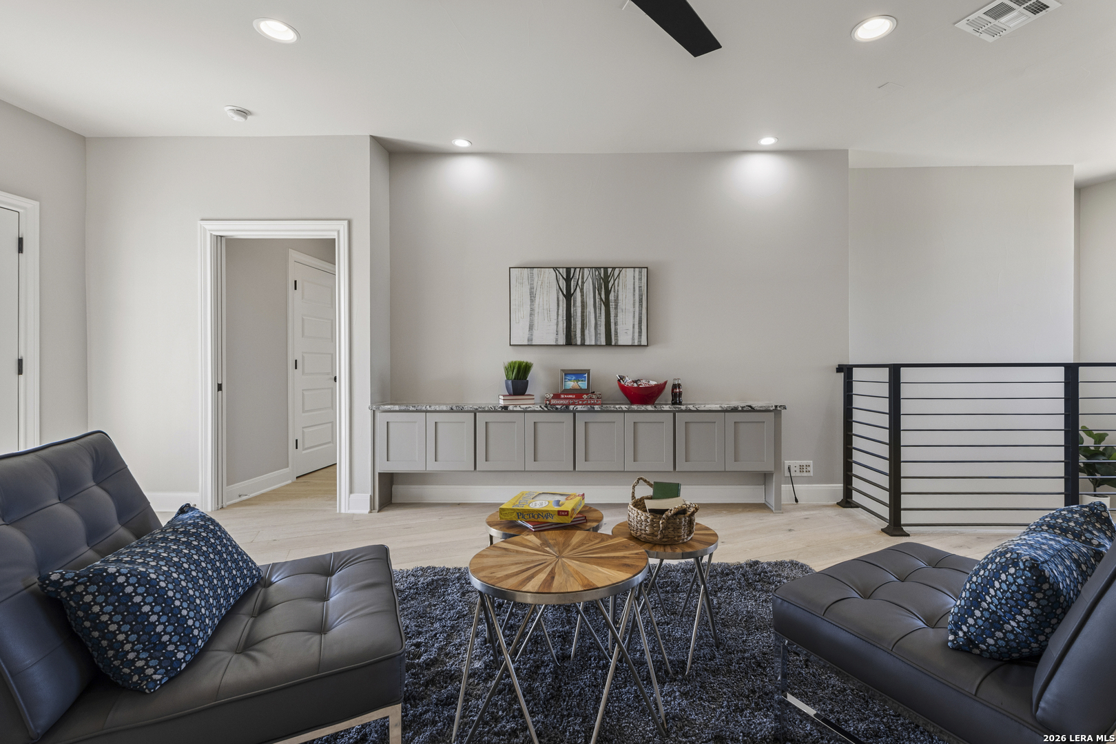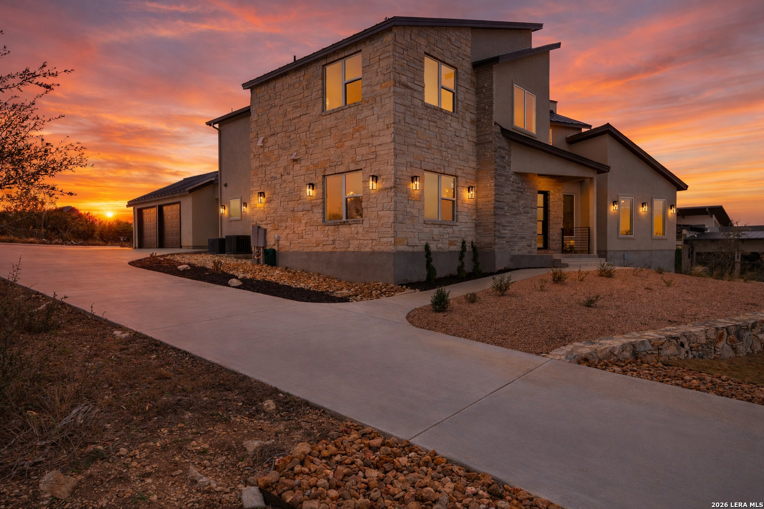 Welcome to Luxury Living in Copper Ridge. Perched along an elevated road with sweeping Texas Hill Country views, this exceptional estate offers the perfect blend of contemporary design and timeless elegance. Featuring 5 bedrooms, 4 full baths, 2 half baths, and a 3-car garage, this thoughtfully designed home is bathed in natural light and built for both everyday comfort and elevated entertaining. The open-concept floor plan centers around a spacious living room highlighted by a dramatic limestone fireplace and expansive windows that frame the surrounding landscape. Just steps away, a stylish dry bar with wine refrigerator, abundant cabinetry, and generous counter space makes hosting effortless. At the heart of the home, the chef's kitchen is a true showpiece-equipped with professional-grade ZLINE appliances, dual dishwashers, custom cabinetry, a large center island with breakfast bar seating, and bold granite countertops complemented by a striking full-height backsplash. Designed for gatherings both large and small, this space is as functional as it is stunning. The primary suite, located on the main level for ultimate privacy, offers a serene retreat with expansive windows, private patio access, and a spa-inspired bath featuring a double granite vanity, soaking tub, and oversized double-headed walk-in shower. A custom walk-in closet provides exceptional storage and organization. Also on the main level is the fifth bedroom, currently utilized as a private office, offering flexibility as a guest suite, executive workspace, or additional bedroom to suit your needs. Upstairs, a versatile loft offers endless possibilities as a secondary living area, media room, or play space, and opens to a private balcony-perfect for morning coffee or evening wine while enjoying Hill Country sunsets. Secondary bedrooms are generously sized, filled with natural light, and capture beautiful views. Outdoor living shines with a covered patio designed for true Texas living. The fully equipped outdoor kitchen features granite countertops, a sink, and built-in grill-ideal for entertaining and weekend BBQs. A convenient half bath off the patio allows guests to enjoy the outdoor space without going indoors, creating a seamless year-round gathering experience. Additional highlights include Cat 6 wiring and a whole-home surround sound system, ensuring modern connectivity and entertainment throughout. This is a rare opportunity to own an extraordinary Copper Ridge residence-where luxury, comfort, and the unmatched beauty of the Texas Hill Country come together.
