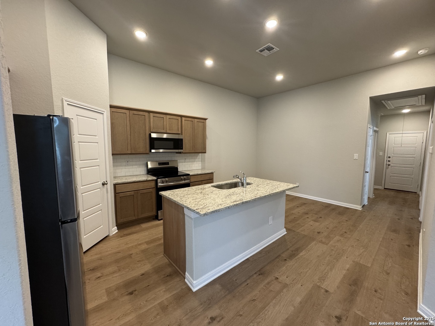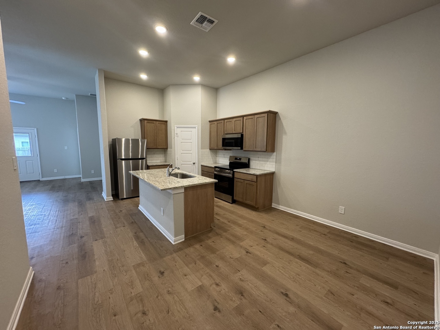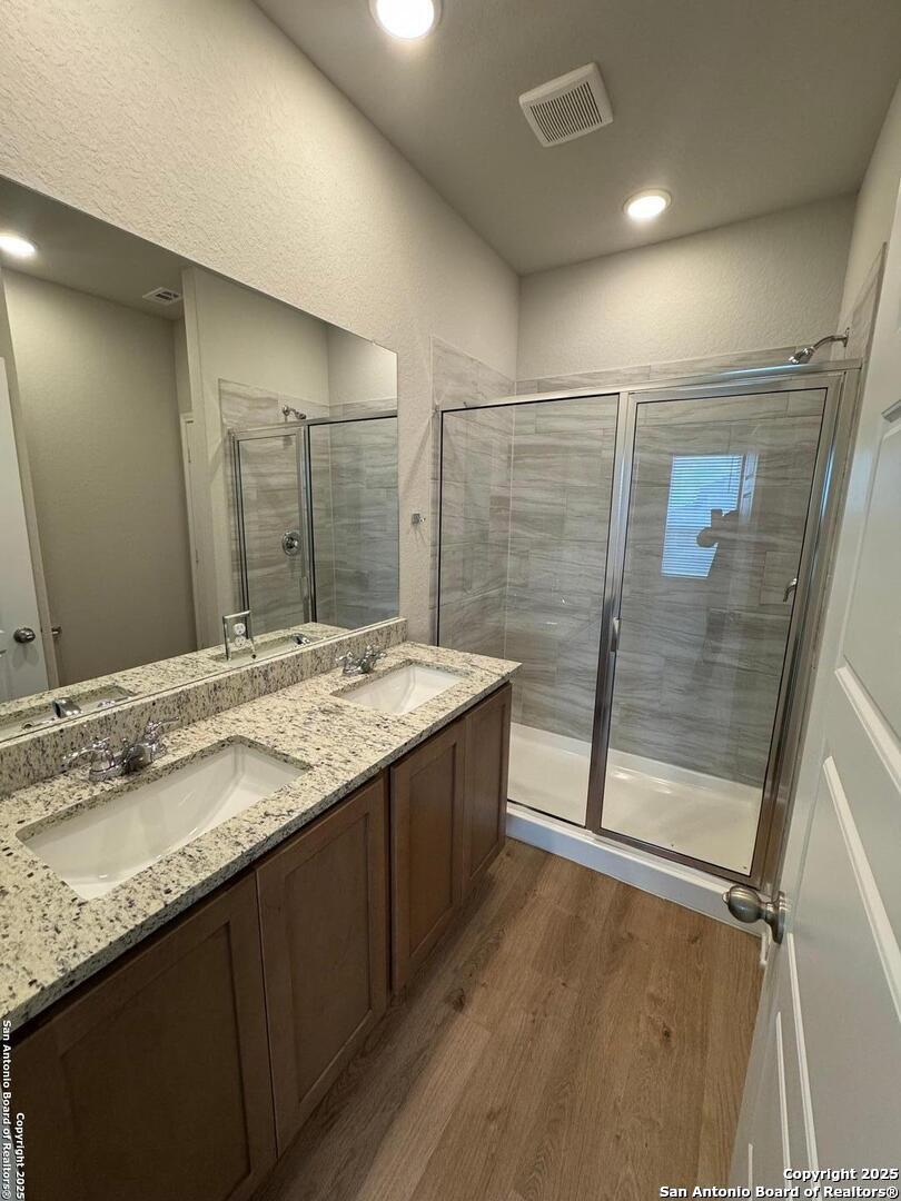 This elegantly designed duplex features an open floor plan accentuated by high ceilings and tastefully painted tan walls, creating a fresh and expansive ambiance. Abundant natural light permeates throughout, enhancing the living spaces. The sophisticated kitchen, with its practical layout, seamlessly integrates into the living area, complemented by stylish light gray and creamy vinyl flooring that extends throughout the property. The primary suite is a blend of functionality and luxury, equipped with a walk-in shower, dual sinks, and a spacious walk-in closet. Additional amenities include a large laundry room and a covered patio, perfect for outdoor entertainment. Conveniently located near major highways, this home is just minutes away from Randolph Air Force Base and the Forum shopping center, placing modern conveniences and leisure at your doorstep.
