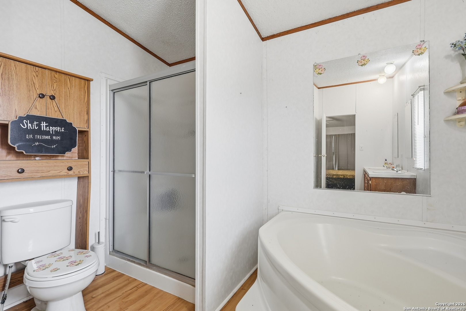Located along the Medina River shoreline, this 3 bedroom 2 bath home sits on 0.17 acre lot with exceptional Hill Country views. The home features a functional split floor plan designed for both comfort and privacy. Kitchen highlights: ample countertop space, plenty of cabinet storage, breakfast bar on the peninsula, and matching appliances. Washer, Dryer, Refrigerator convey. Spacious primary bedroom features: walk in closet, walk in shower, separate tub, and dual vanities. Enjoy added privacy with a gated driveway, the convenience of a two-car carport, and relaxing mornings and/or evenings on the covered front patio while taking in the natural surroundings. Whether you are seeking a peaceful full-time residence or a weekend retreat, this lovely home captures the essence of Hill Country living near Medina Lake. Priced to sell. Some TLC needed.