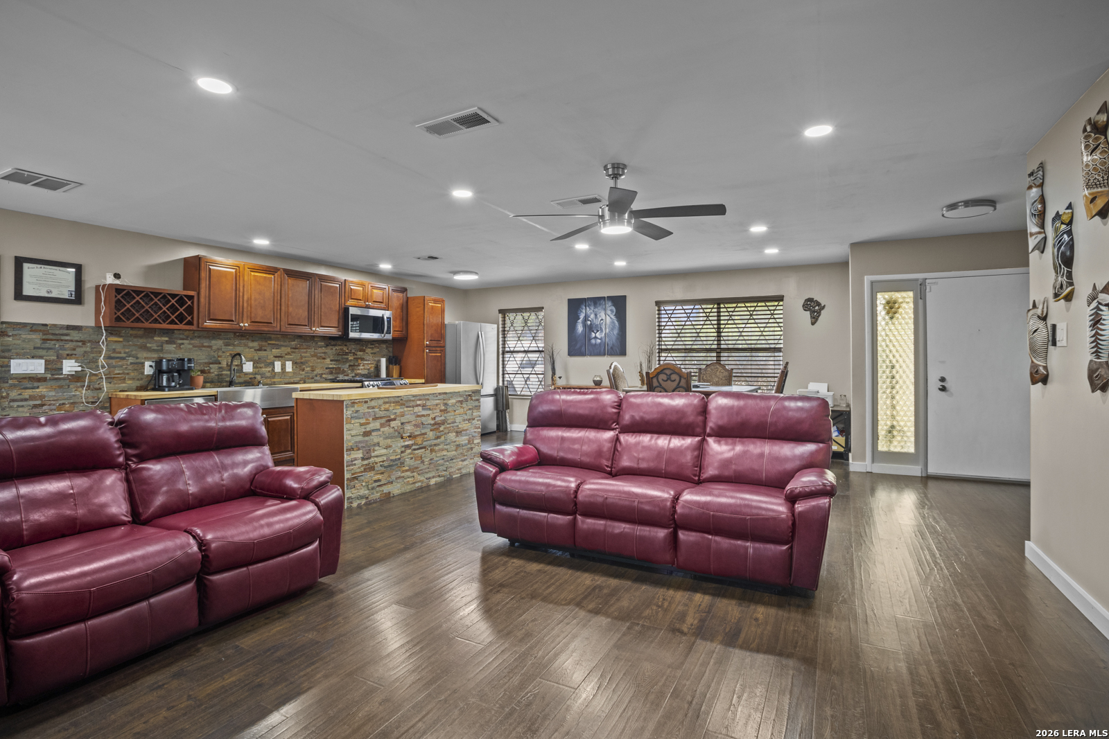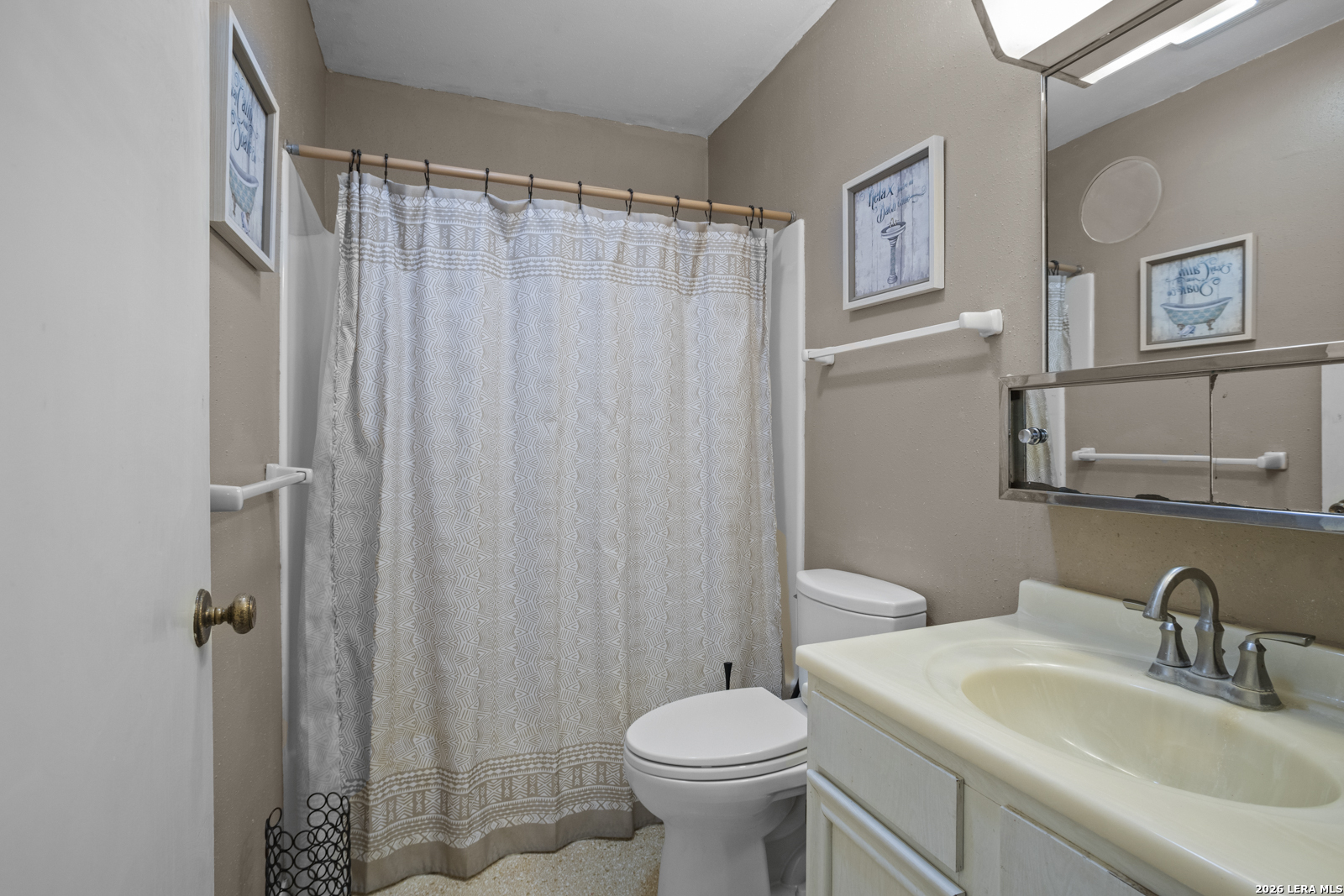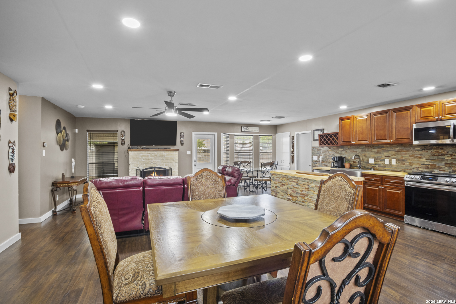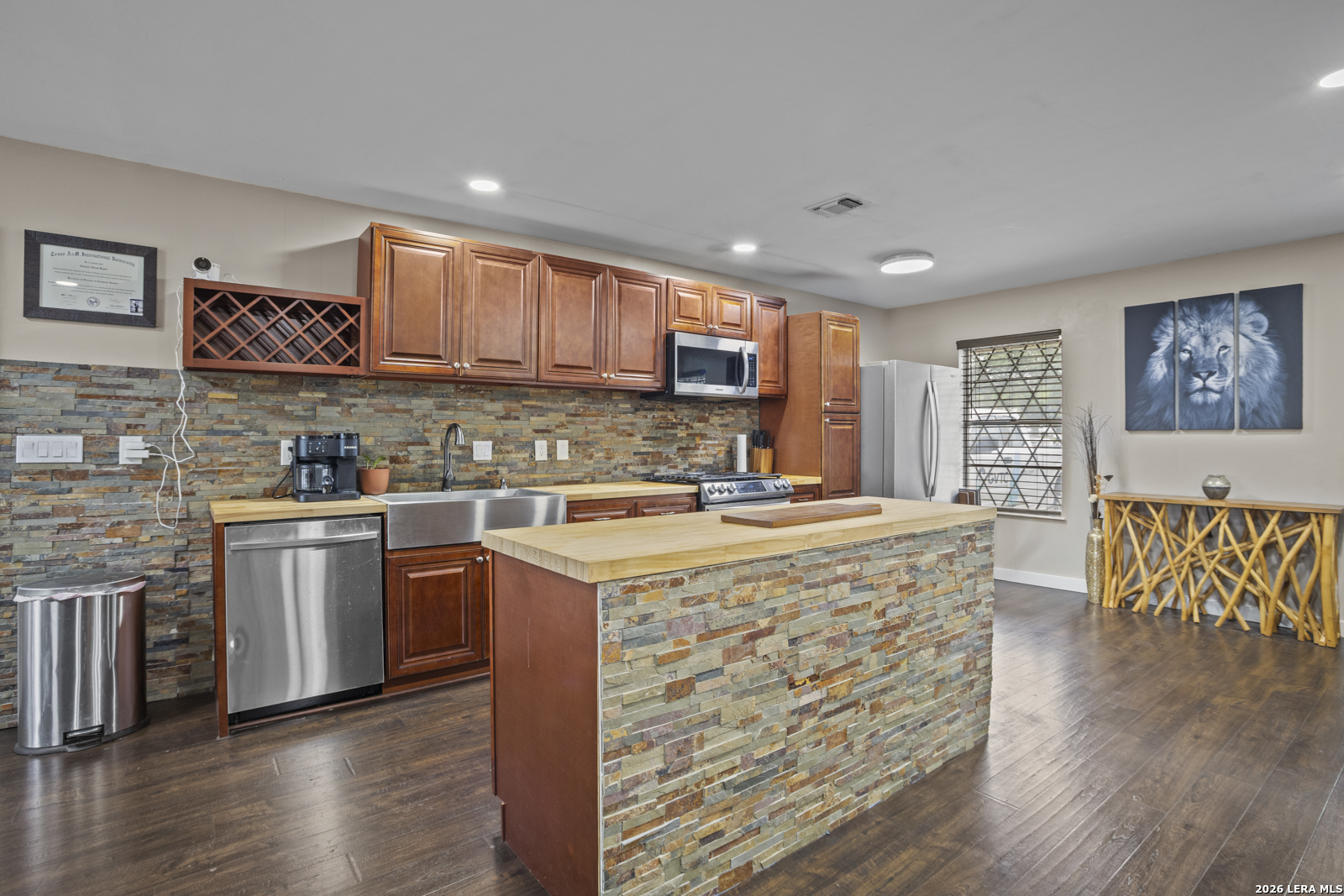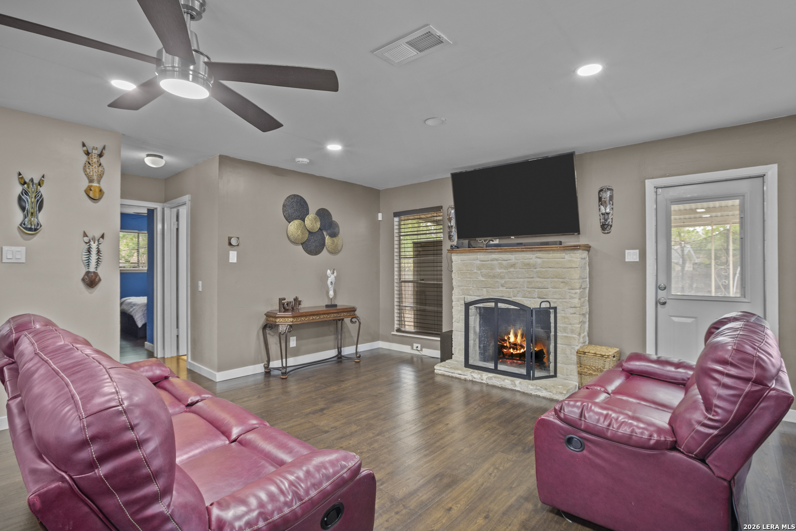 Welcome to 5518 Merlin in San Antonio, a well-updated 4-bedroom, 3-bath home offering a flexible and functional layout. The open-concept living area features a cozy fireplace and flows seamlessly into the island kitchen, complete with a farmhouse sink, stainless steel appliances, and gas cooking. The converted garage adds valuable living space with a large bedroom and an updated full bathroom featuring a single vanity and a stand-up shower, making it ideal for guests or multi-generational living. Inside, you'll also find an interior laundry room for added convenience. Additional highlights include good-sized bedrooms, a large backyard, and a covered patio perfect for outdoor entertaining. Recent updates such as refreshed flooring and a updated bathroom in the converted garage give the home a modern, move-in-ready feel.