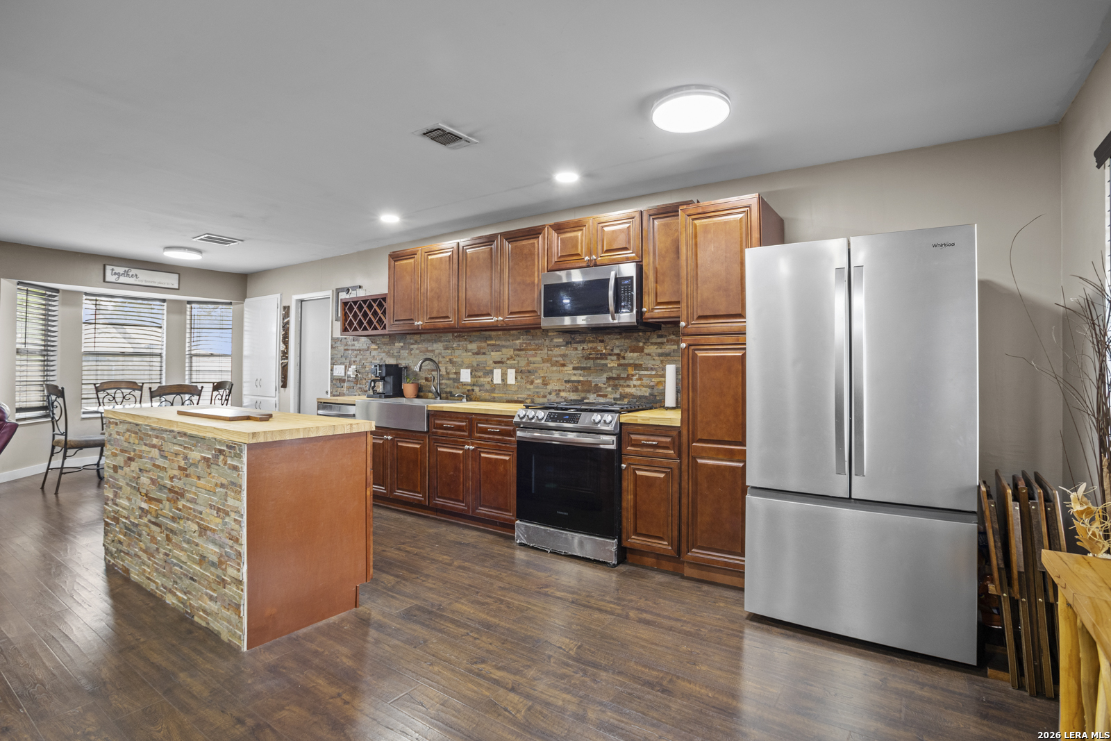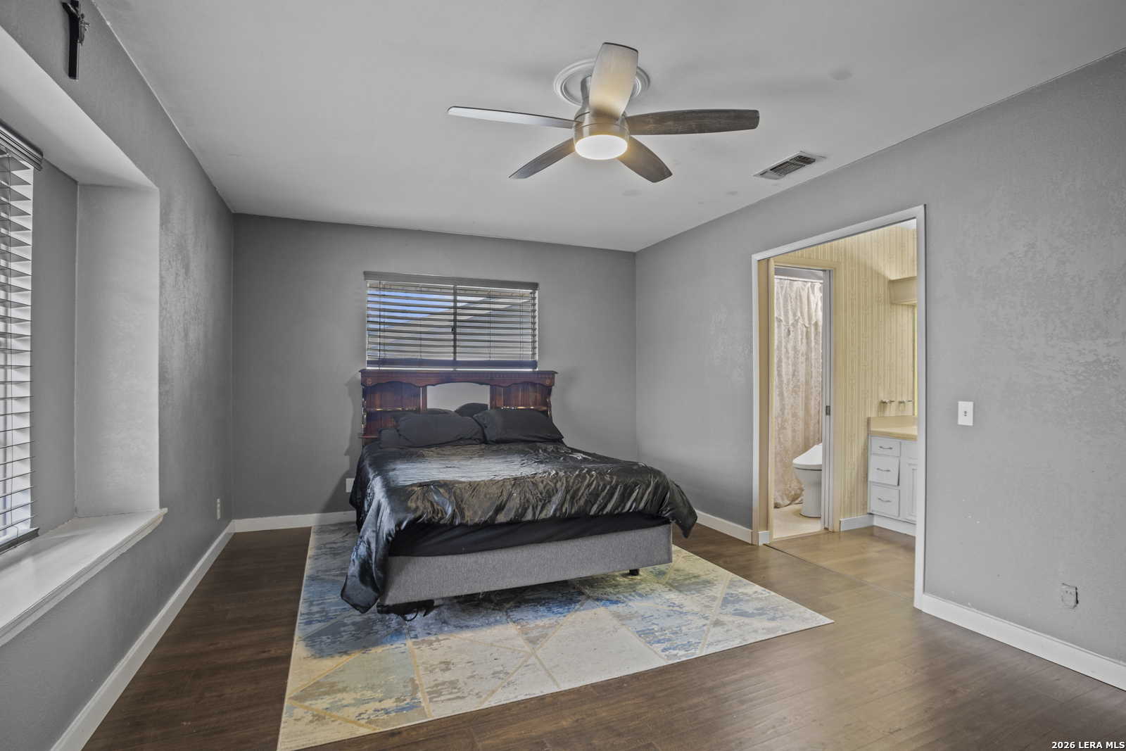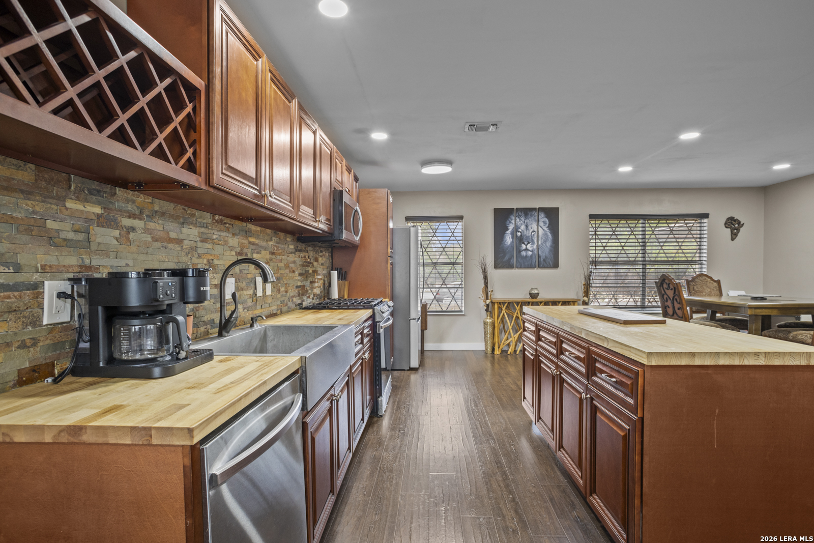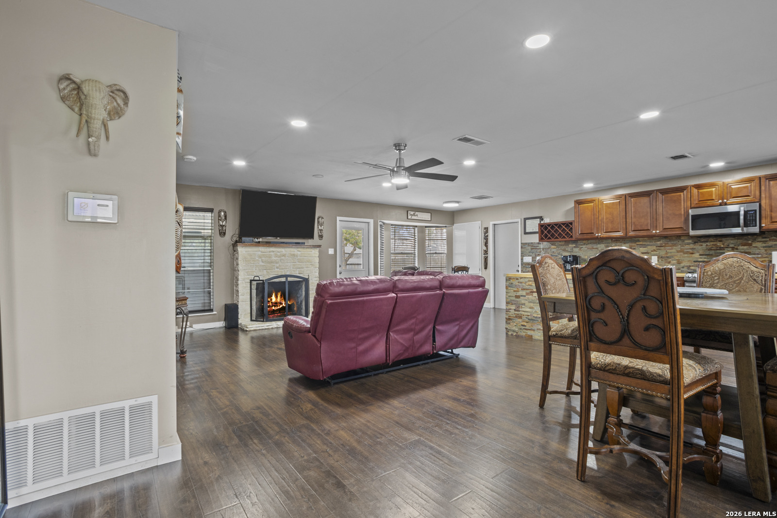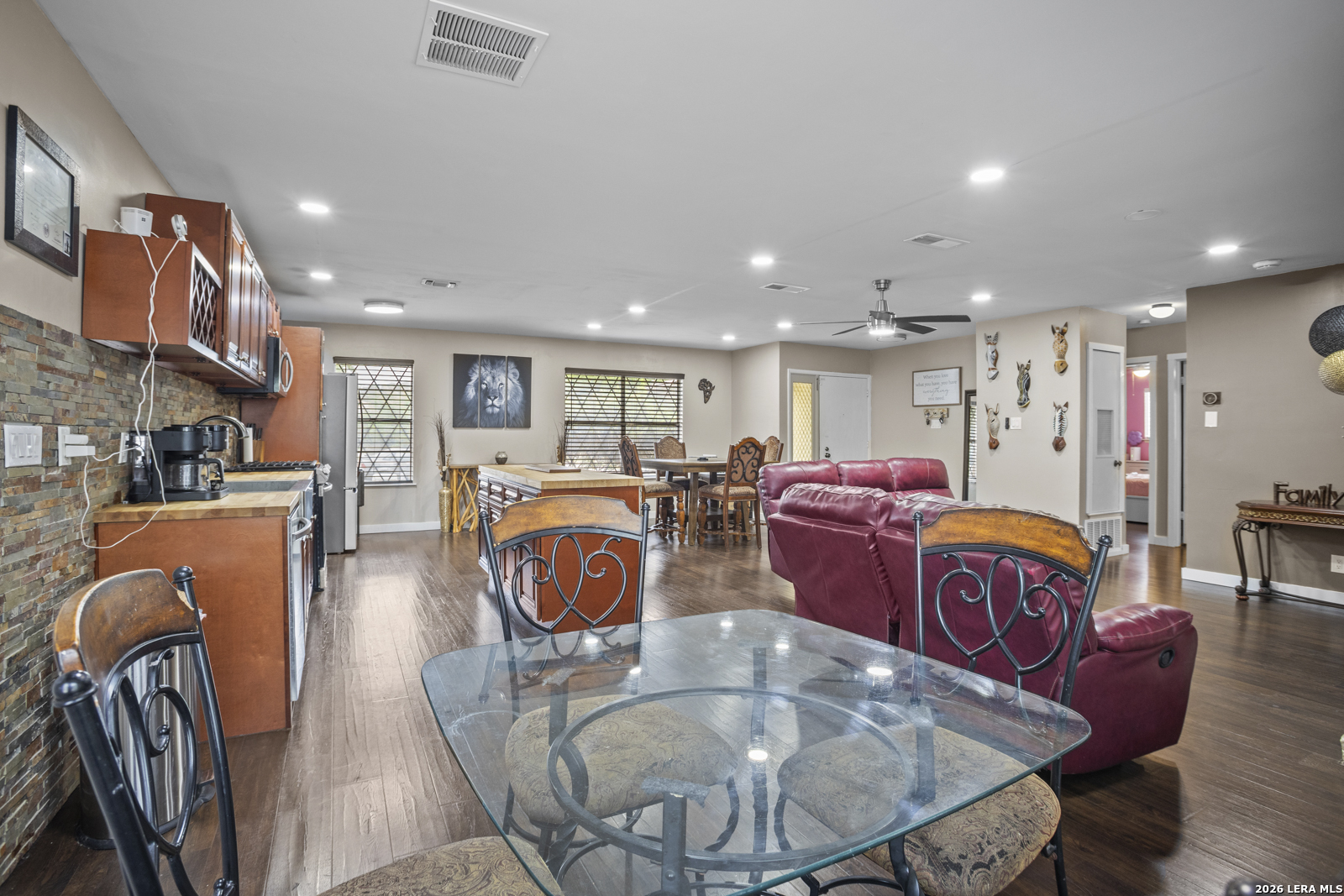 Welcome to 5518 Merlin in San Antonio, a well-updated 4-bedroom, 3-bath home offering a flexible and functional layout. The open-concept living area features a cozy fireplace and flows seamlessly into the island kitchen, complete with a farmhouse sink, stainless steel appliances, and gas cooking. The converted garage adds valuable living space with a large bedroom and an updated full bathroom featuring a single vanity and a stand-up shower, making it ideal for guests or multi-generational living. Inside, you'll also find an interior laundry room for added convenience. Additional highlights include good-sized bedrooms, a large backyard, and a covered patio perfect for outdoor entertaining. Recent updates such as refreshed flooring and a updated bathroom in the converted garage give the home a modern, move-in-ready feel.