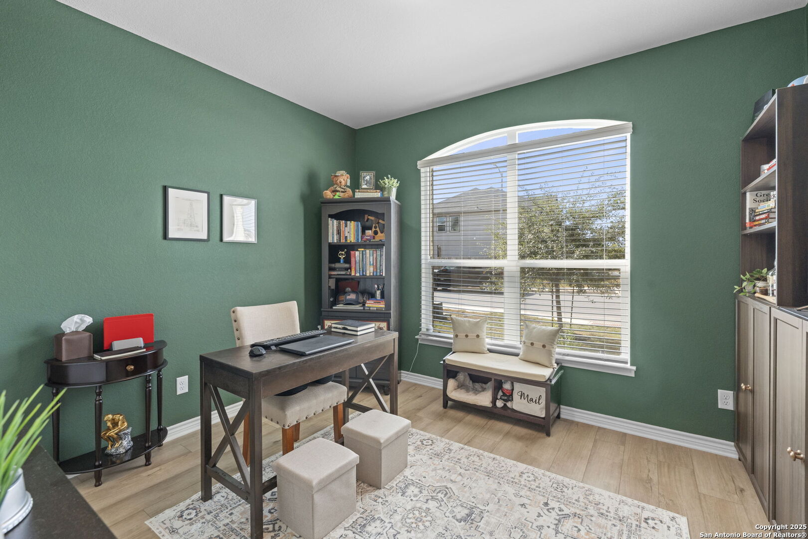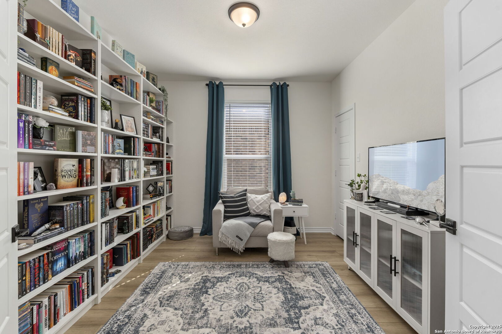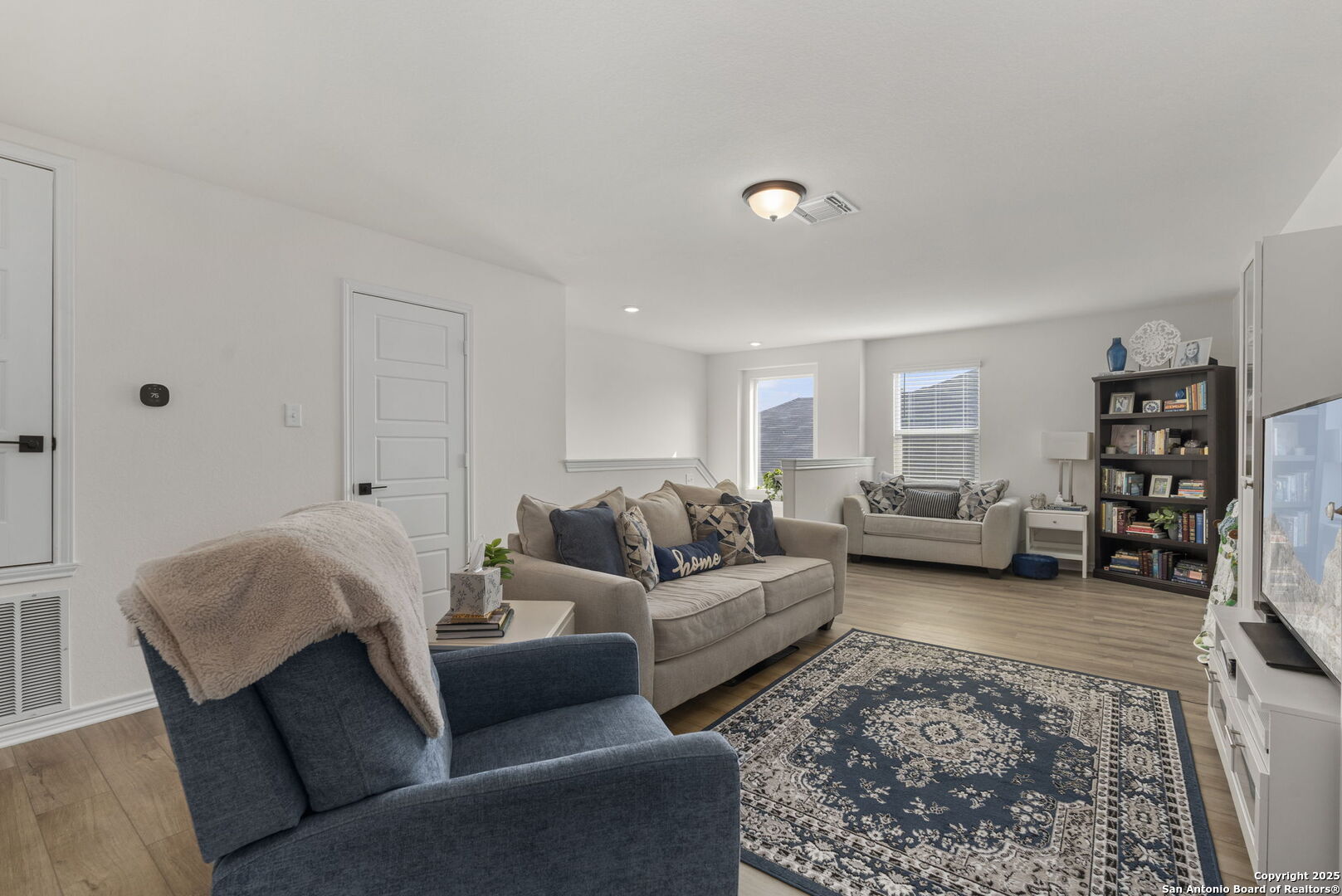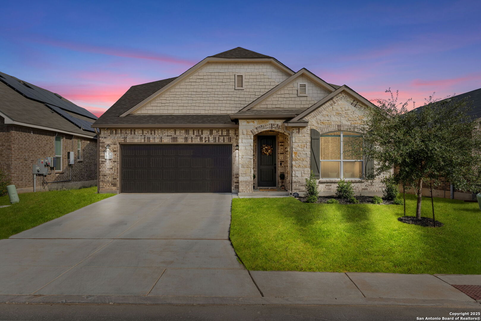 You have found home! This beauty is a must see. 1.5 story with great curb appeal welcomes you inside. Carpet free downstairs with an Inviting entry with updated ceiling light fixtures with 2 bedrooms up front with a full bathroom. Down the hall is a double door study with a huge closet perfect for storage. Hall leads you inside the kitchen that you will want to entertain guests in and hosts gatherings. Beautiful Backsplash with so many cabinets. Additional counter space off the dining area perfect for a coffee bar, drinks or kitchen gadgets. Built in appliances with double ovens, electric cook top and a window over the sink allowing natural light and view of trees. Island with pendant lighting perfect for additional seating and showing off those holiday platters. Dining area opens to the kithcen and living area. Primary bedroom is tucked away from the other rooms and living area offering great privacy with a walk in closet with custom built in shelving. Bathroom with double vanilty, Tub/shower and a linen closet. Laundry room with built in shelving. Upstairs you will find a great size bright open game room with engineered wood flooring and a full bedroom and bathroom perfect for a college student, secondary primary or for guests. Love the outdoors? This home has a wonderful oversized covered back patio with shade in the afternoon and has a view of the greenbelt with mature trees in your own yard. Flat and ready for game day BBQ's. This home is a true gem with so many extra features and you can see the pride of ownership the moment you step inside. No need to build since you can't find this 1.5 story style in this area for this price! A true single story with Bonus Room. No City taxes.