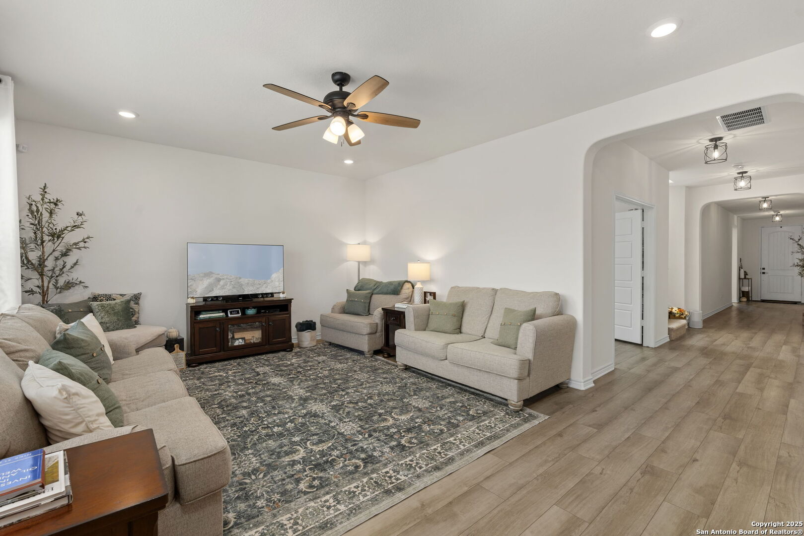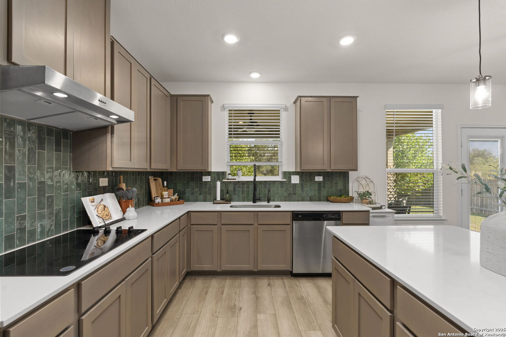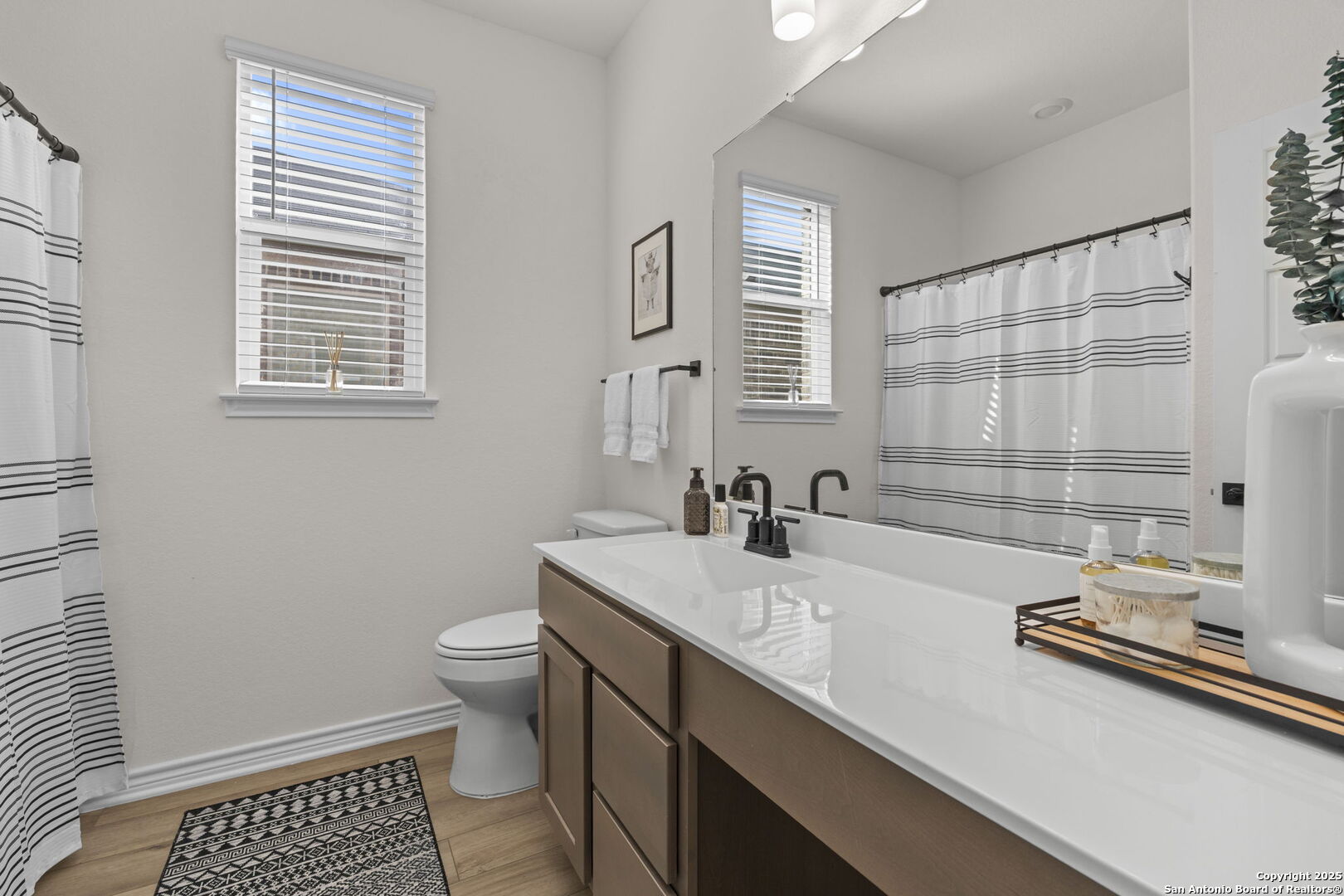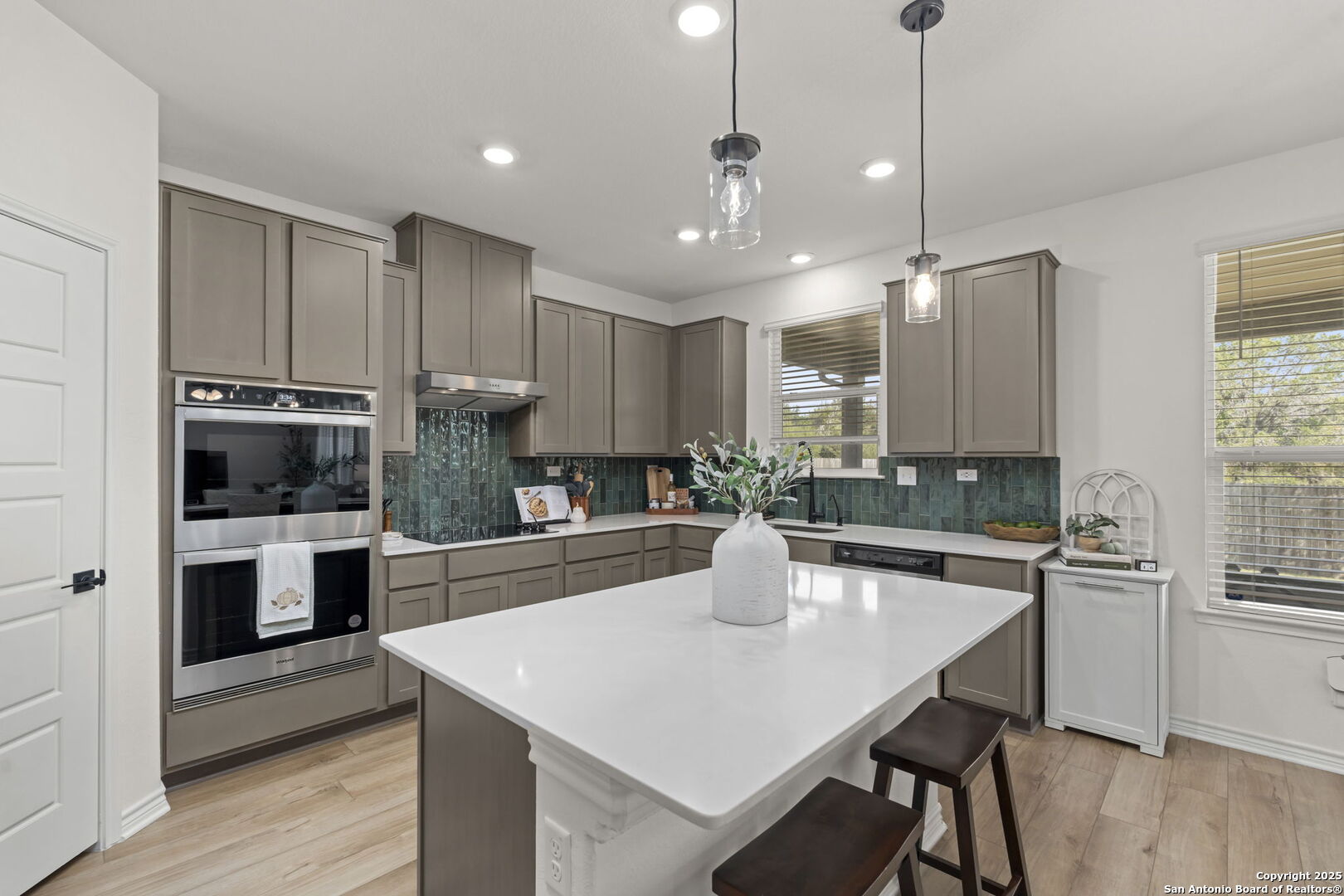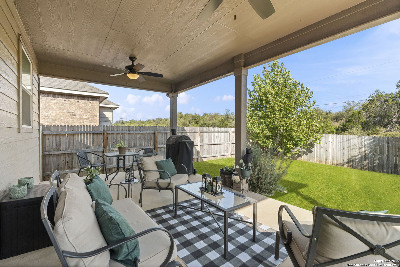 You have found home! This beauty is a must see. 1.5 story with great curb appeal welcomes you inside. Carpet free downstairs with an Inviting entry with updated ceiling light fixtures with 2 bedrooms up front with a full bathroom. Down the hall is a double door study with a huge closet perfect for storage. Hall leads you inside the kitchen that you will want to entertain guests in and hosts gatherings. Beautiful Backsplash with so many cabinets. Additional counter space off the dining area perfect for a coffee bar, drinks or kitchen gadgets. Built in appliances with double ovens, electric cook top and a window over the sink allowing natural light and view of trees. Island with pendant lighting perfect for additional seating and showing off those holiday platters. Dining area opens to the kithcen and living area. Primary bedroom is tucked away from the other rooms and living area offering great privacy with a walk in closet with custom built in shelving. Bathroom with double vanilty, Tub/shower and a linen closet. Laundry room with built in shelving. Upstairs you will find a great size bright open game room with engineered wood flooring and a full bedroom and bathroom perfect for a college student, secondary primary or for guests. Love the outdoors? This home has a wonderful oversized covered back patio with shade in the afternoon and has a view of the greenbelt with mature trees in your own yard. Flat and ready for game day BBQ's. This home is a true gem with so many extra features and you can see the pride of ownership the moment you step inside. No need to build since you can't find this 1.5 story style in this area for this price! A true single story with Bonus Room. No City taxes.