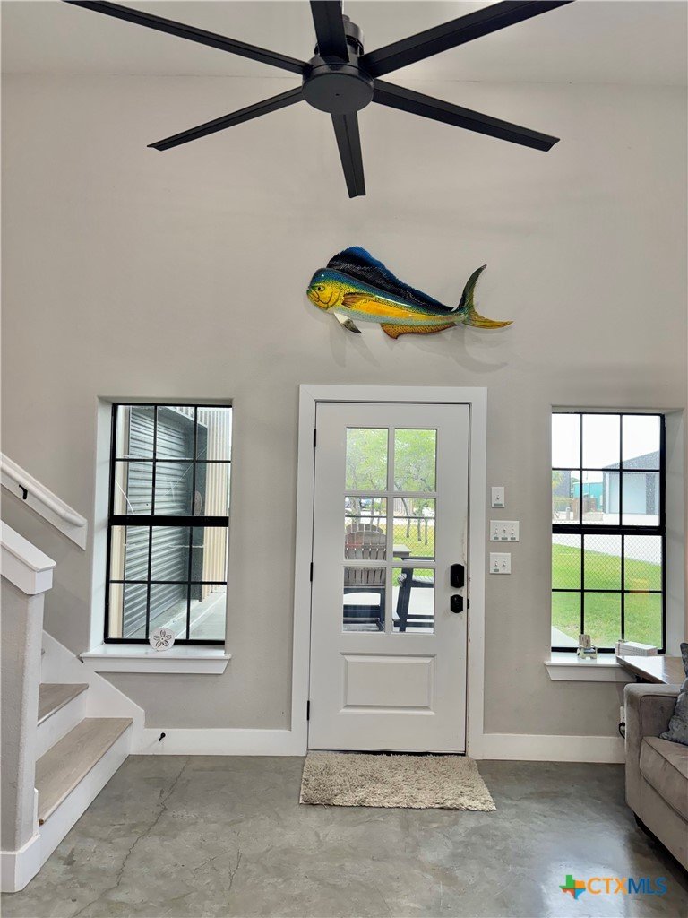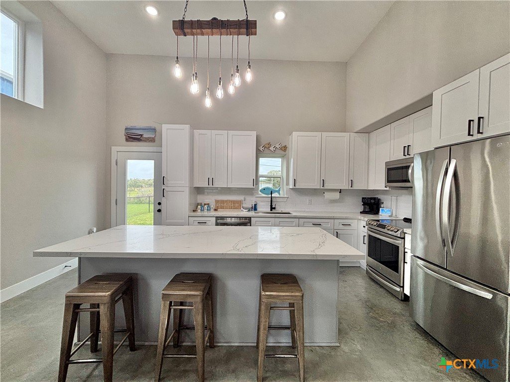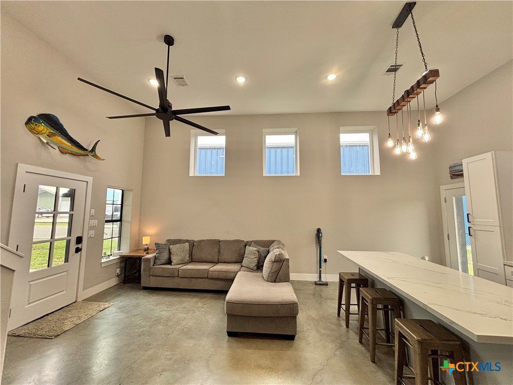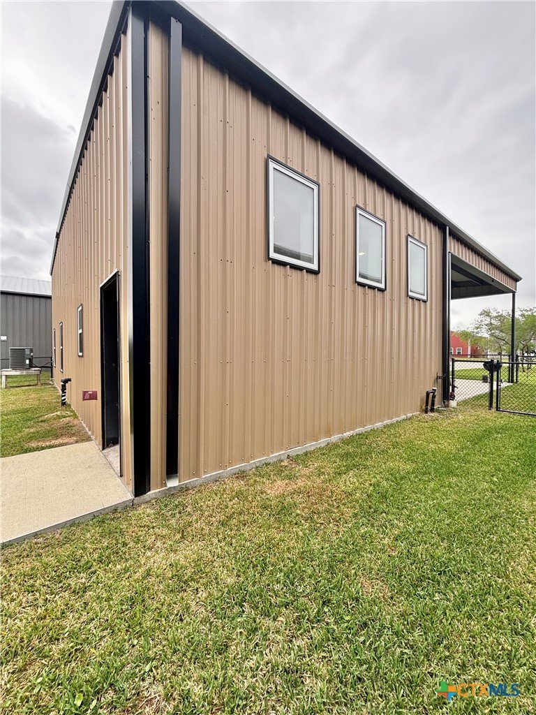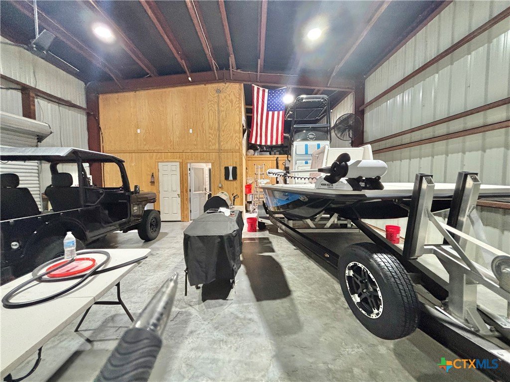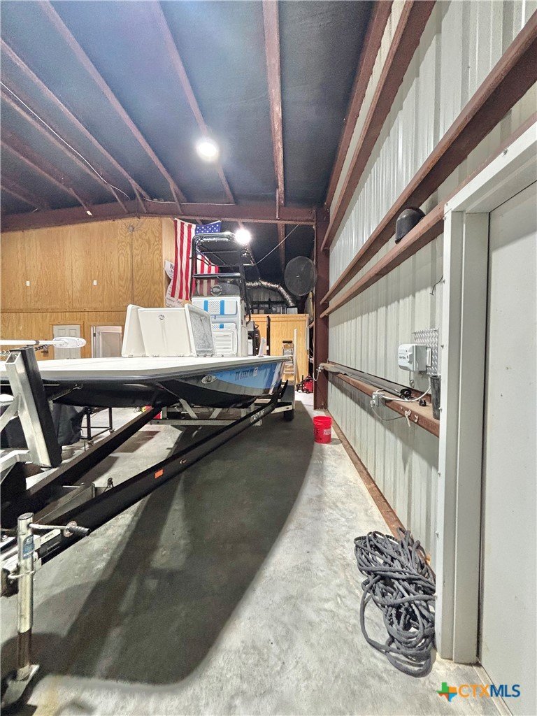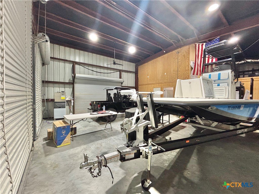 East facing 3 bed, 2 bath w/3 roll up garage doors in gated West Bank subdivision. Indirect light brightens the living and kitchen areas of this 2 story open concept barnominium with modern accents in a gray and white color scheme. Living room chandelier, drop lights in kitchen over granite countertops with subway backsplash, electric stove and built-in microwave. Glass back door lets out to large, fenced backyard and North/South side yards, to front yard. Large concrete driveway, on right, accommodates multiple cars/trucks and Canopy over 1/2 of driveway provides shade. Two, tall roll up Boat Stall doors face driveway. Adjacent half rollup garage door provides breeze to adjoining patio and allows access to garage. Covered patio adjoining front door is gated with privacy provided by large shade tree, in front yard. First floor includes utility room with door into garage, plus two bedrooms and one bath w/tile shower. First bedroom has two built-in bunkbeds; great for kids and visitors. Second bedroom has large closet and accommodates a queen bed. Upstairs, a large master bedroom and master bath with Tile tub/shower enclosure create a private get-away for Owner. Backyard has room for swimming pool, or kids play area. Kitchen w/electric oven, built-in microwave, farm style sink, Center Island, great for sharing a fish fry to pizza with the kids! See you in POC soon, to see a 3/2 Barndo w/ 2 Stall Boat Barn under $450K!