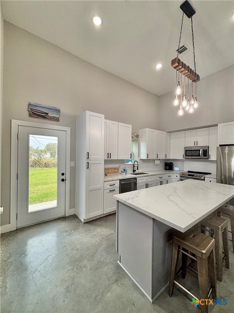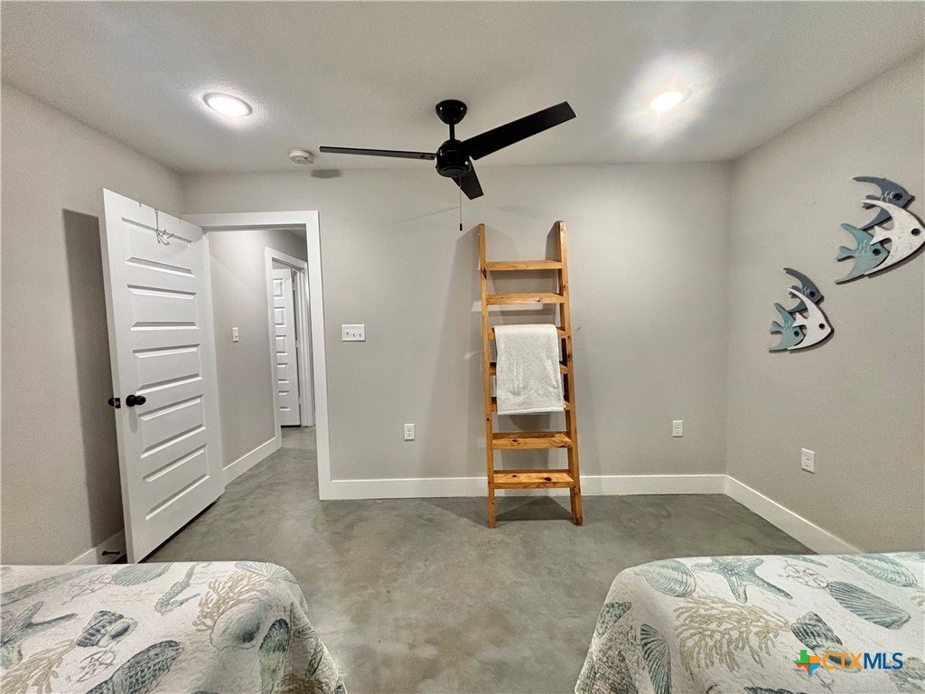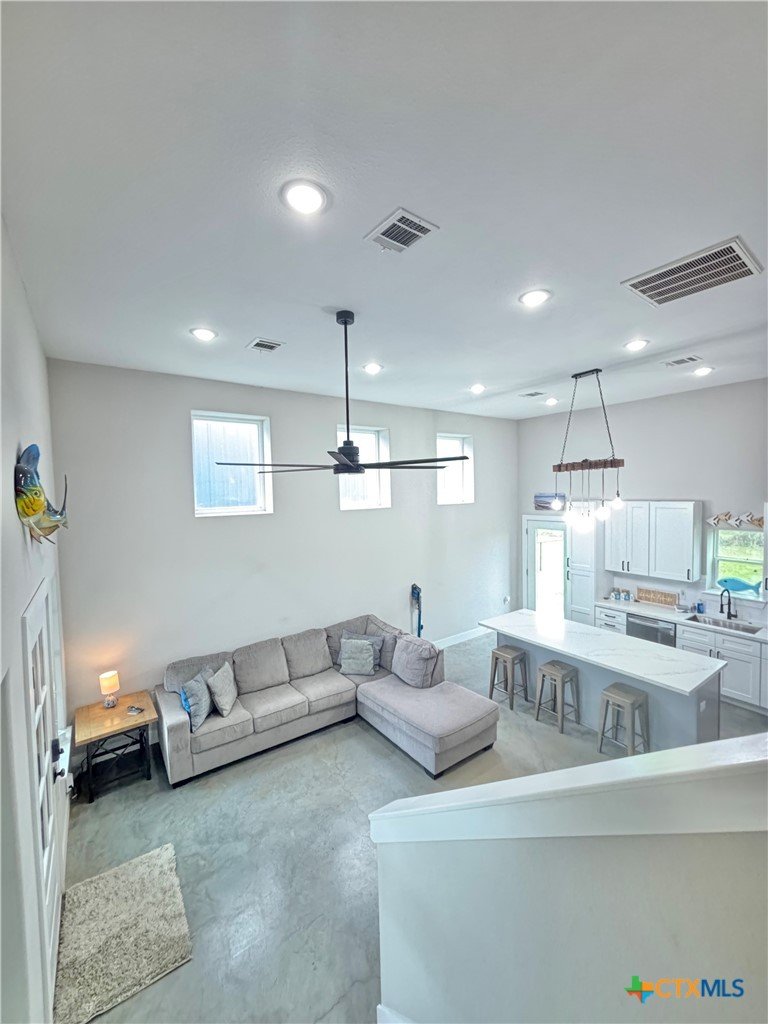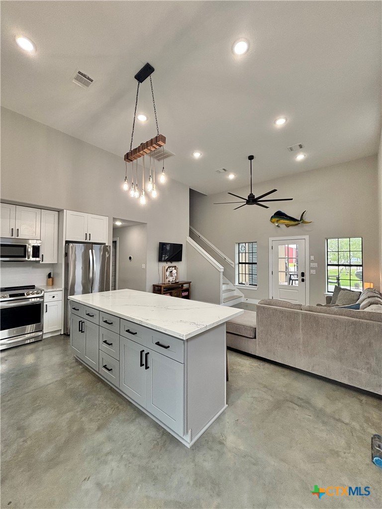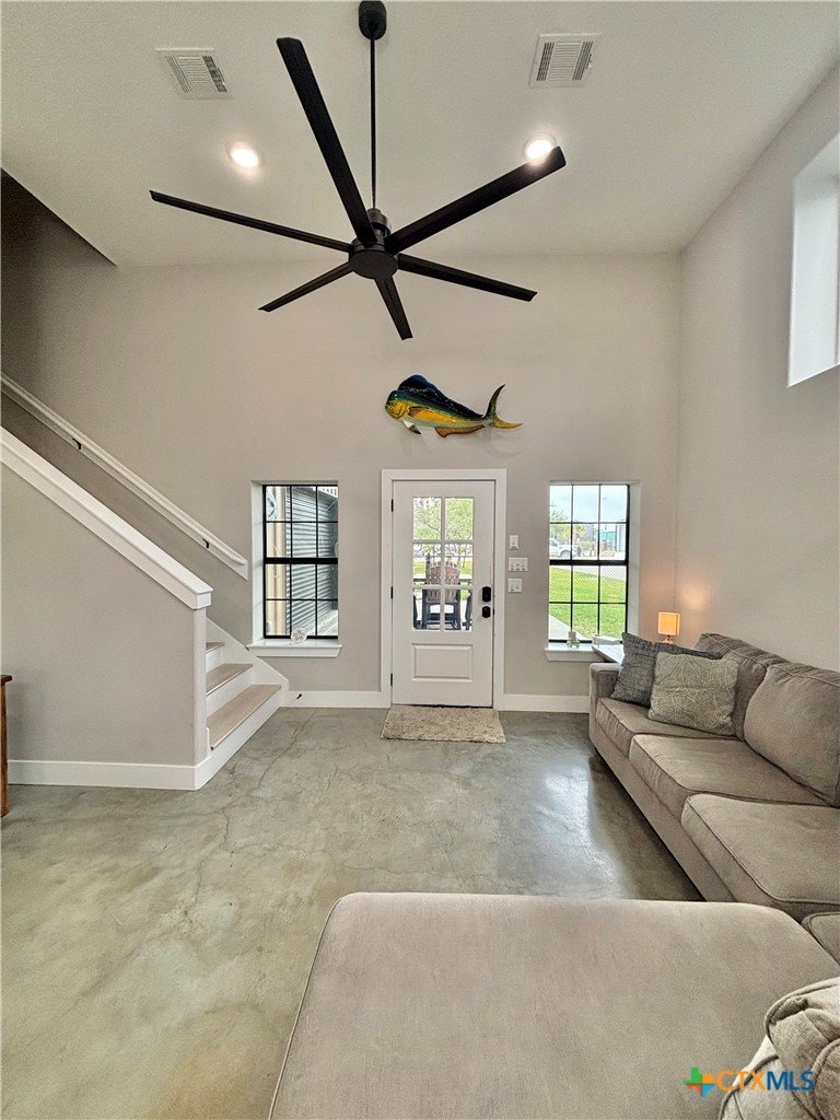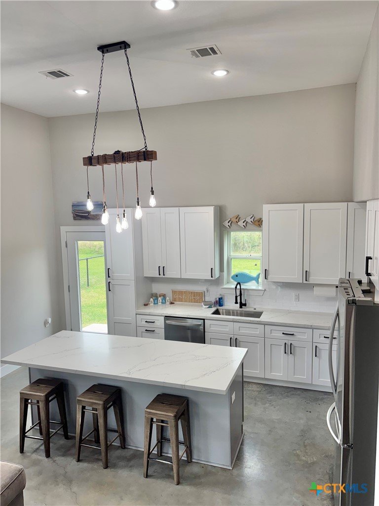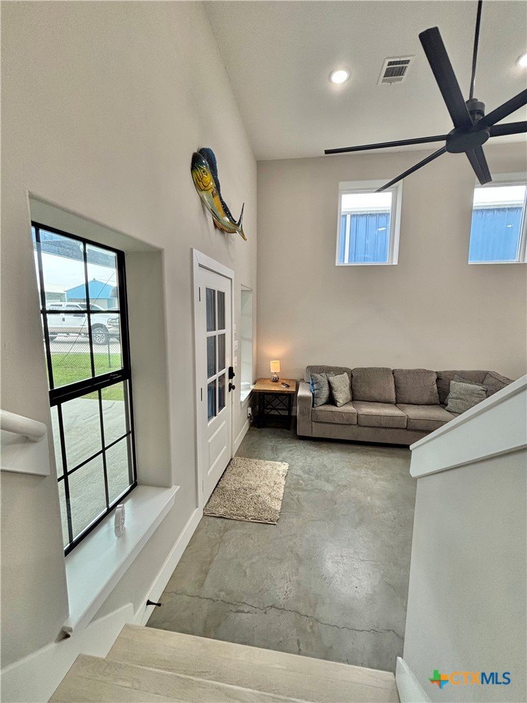 East facing 3 bed, 2 bath w/3 roll up garage doors in gated West Bank subdivision. Indirect light brightens the living and kitchen areas of this 2 story open concept barnominium with modern accents in a gray and white color scheme. Living room chandelier, drop lights in kitchen over granite countertops with subway backsplash, electric stove and built-in microwave. Glass back door lets out to large, fenced backyard and North/South side yards, to front yard. Large concrete driveway, on right, accommodates multiple cars/trucks and Canopy over 1/2 of driveway provides shade. Two, tall roll up Boat Stall doors face driveway. Adjacent half rollup garage door provides breeze to adjoining patio and allows access to garage. Covered patio adjoining front door is gated with privacy provided by large shade tree, in front yard. First floor includes utility room with door into garage, plus two bedrooms and one bath w/tile shower. First bedroom has two built-in bunkbeds; great for kids and visitors. Second bedroom has large closet and accommodates a queen bed. Upstairs, a large master bedroom and master bath with Tile tub/shower enclosure create a private get-away for Owner. Backyard has room for swimming pool, or kids play area. Kitchen w/electric oven, built-in microwave, farm style sink, Center Island, great for sharing a fish fry to pizza with the kids! See you in POC soon, to see a 3/2 Barndo w/ 2 Stall Boat Barn under $450K!