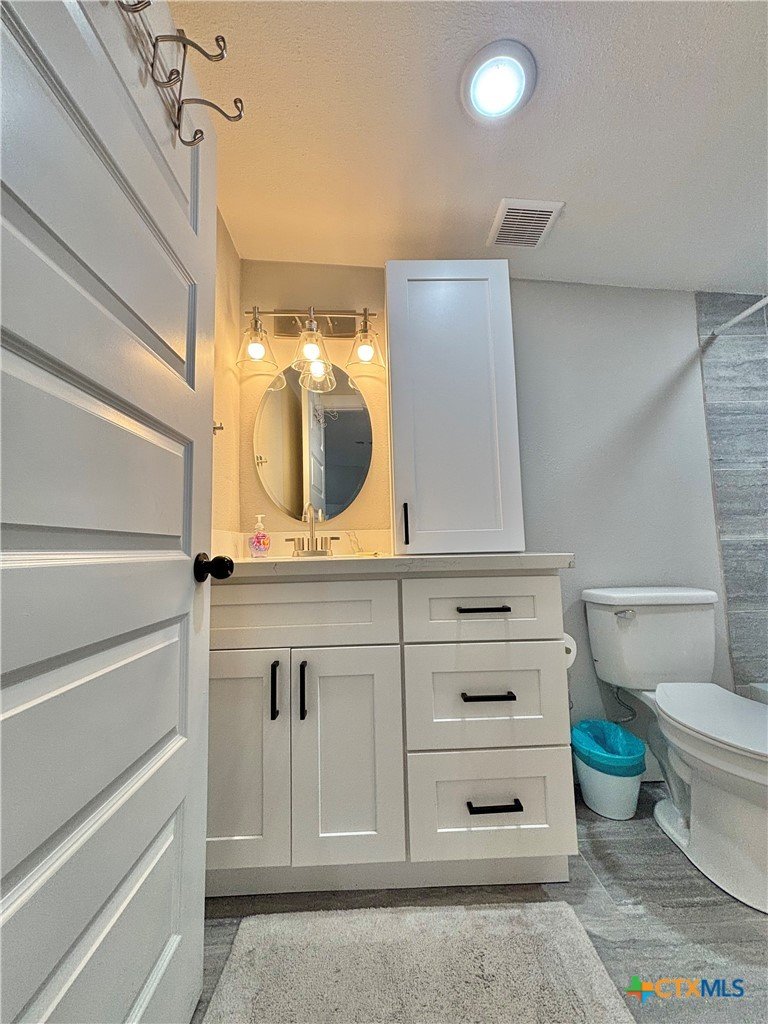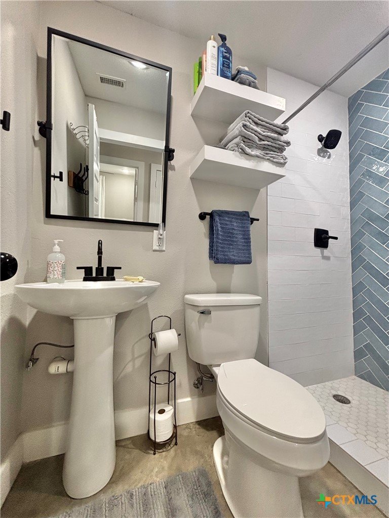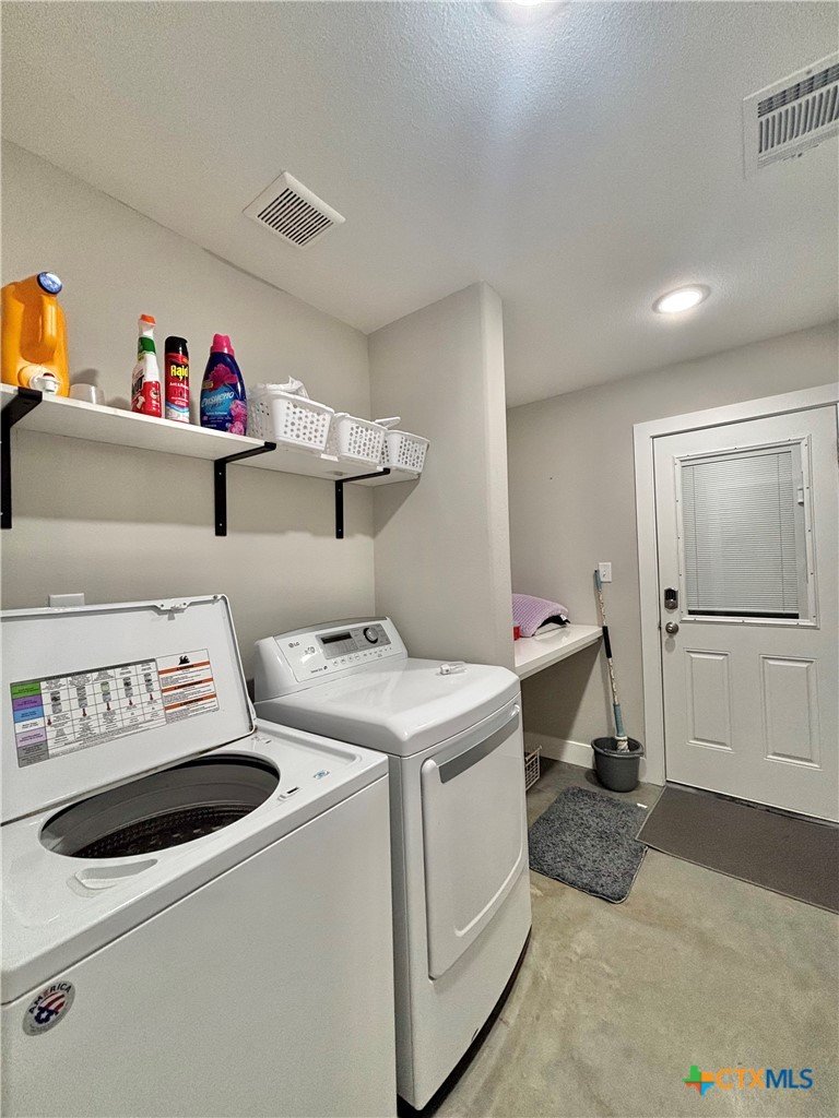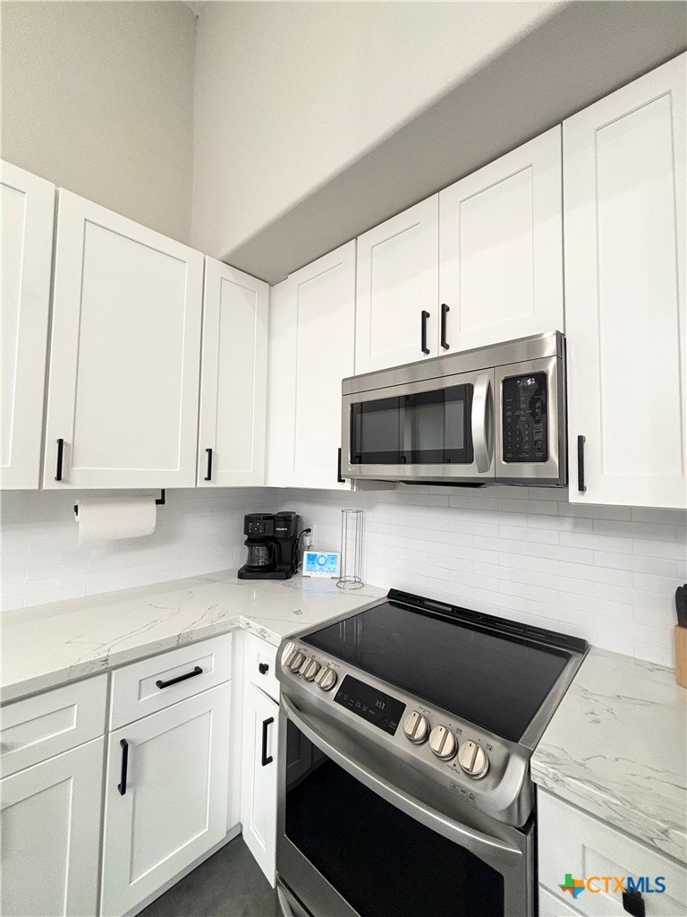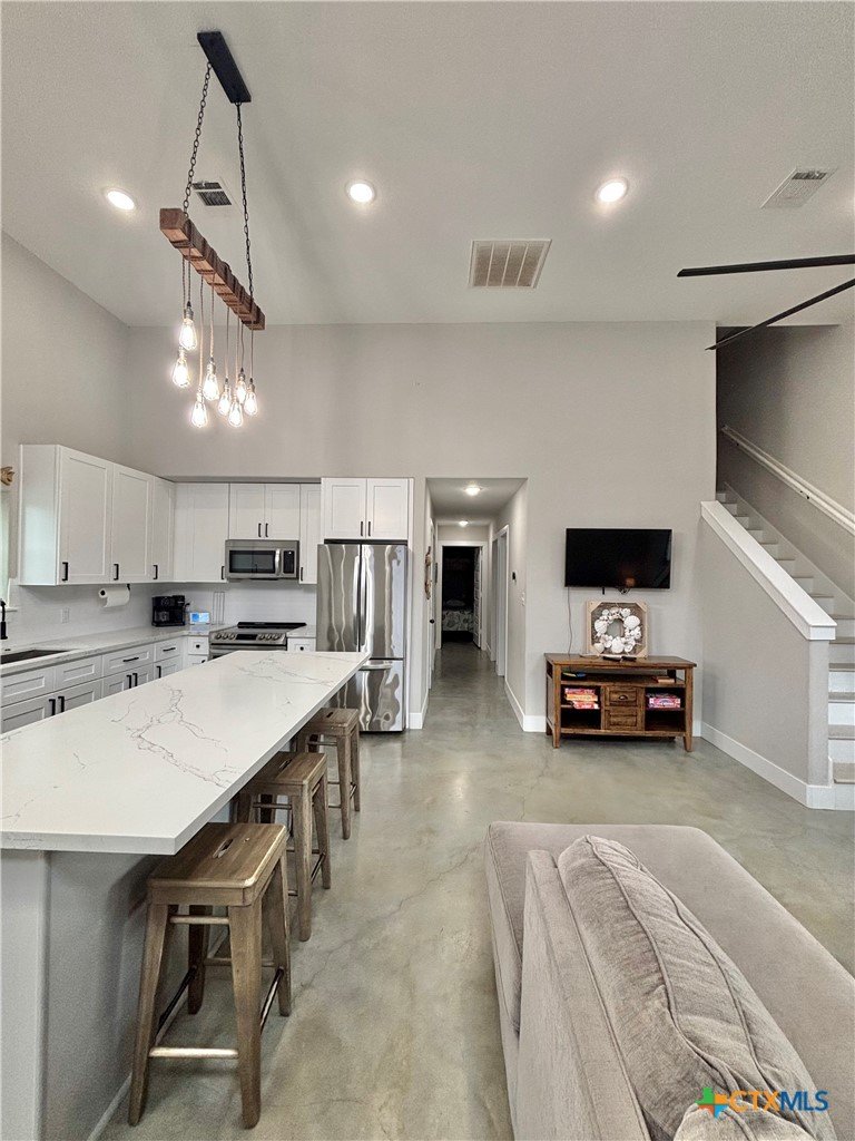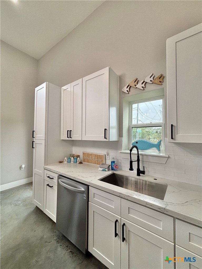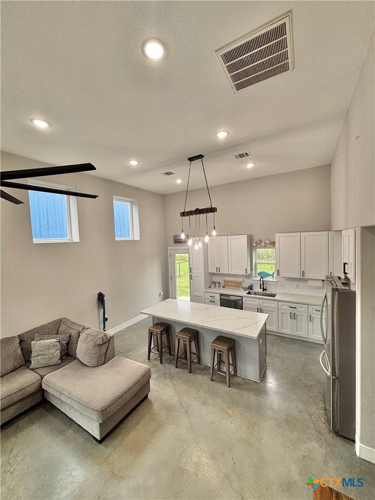 East facing 3 bed, 2 bath w/3 roll up garage doors in gated West Bank subdivision. Indirect light brightens the living and kitchen areas of this 2 story open concept barnominium with modern accents in a gray and white color scheme. Living room chandelier, drop lights in kitchen over granite countertops with subway backsplash, electric stove and built-in microwave. Glass back door lets out to large, fenced backyard and North/South side yards, to front yard. Large concrete driveway, on right, accommodates multiple cars/trucks and Canopy over 1/2 of driveway provides shade. Two, tall roll up Boat Stall doors face driveway. Adjacent half rollup garage door provides breeze to adjoining patio and allows access to garage. Covered patio adjoining front door is gated with privacy provided by large shade tree, in front yard. First floor includes utility room with door into garage, plus two bedrooms and one bath w/tile shower. First bedroom has two built-in bunkbeds; great for kids and visitors. Second bedroom has large closet and accommodates a queen bed. Upstairs, a large master bedroom and master bath with Tile tub/shower enclosure create a private get-away for Owner. Backyard has room for swimming pool, or kids play area. Kitchen w/electric oven, built-in microwave, farm style sink, Center Island, great for sharing a fish fry to pizza with the kids! See you in POC soon, to see a 3/2 Barndo w/ 2 Stall Boat Barn under $450K!