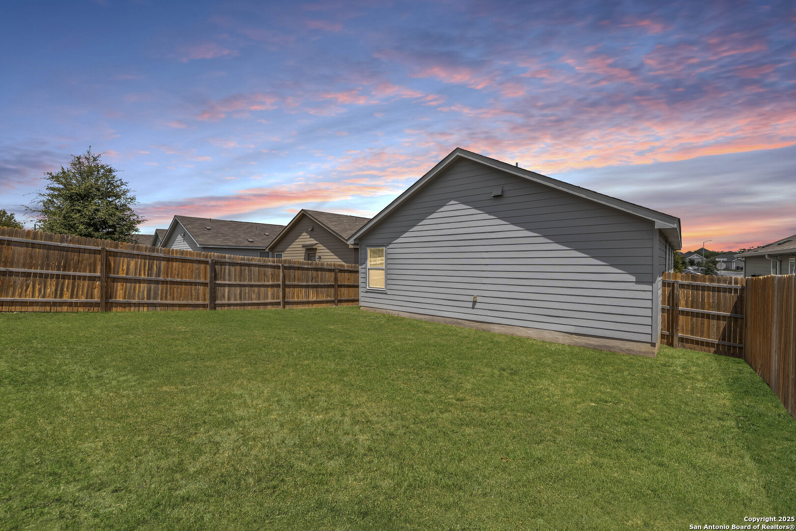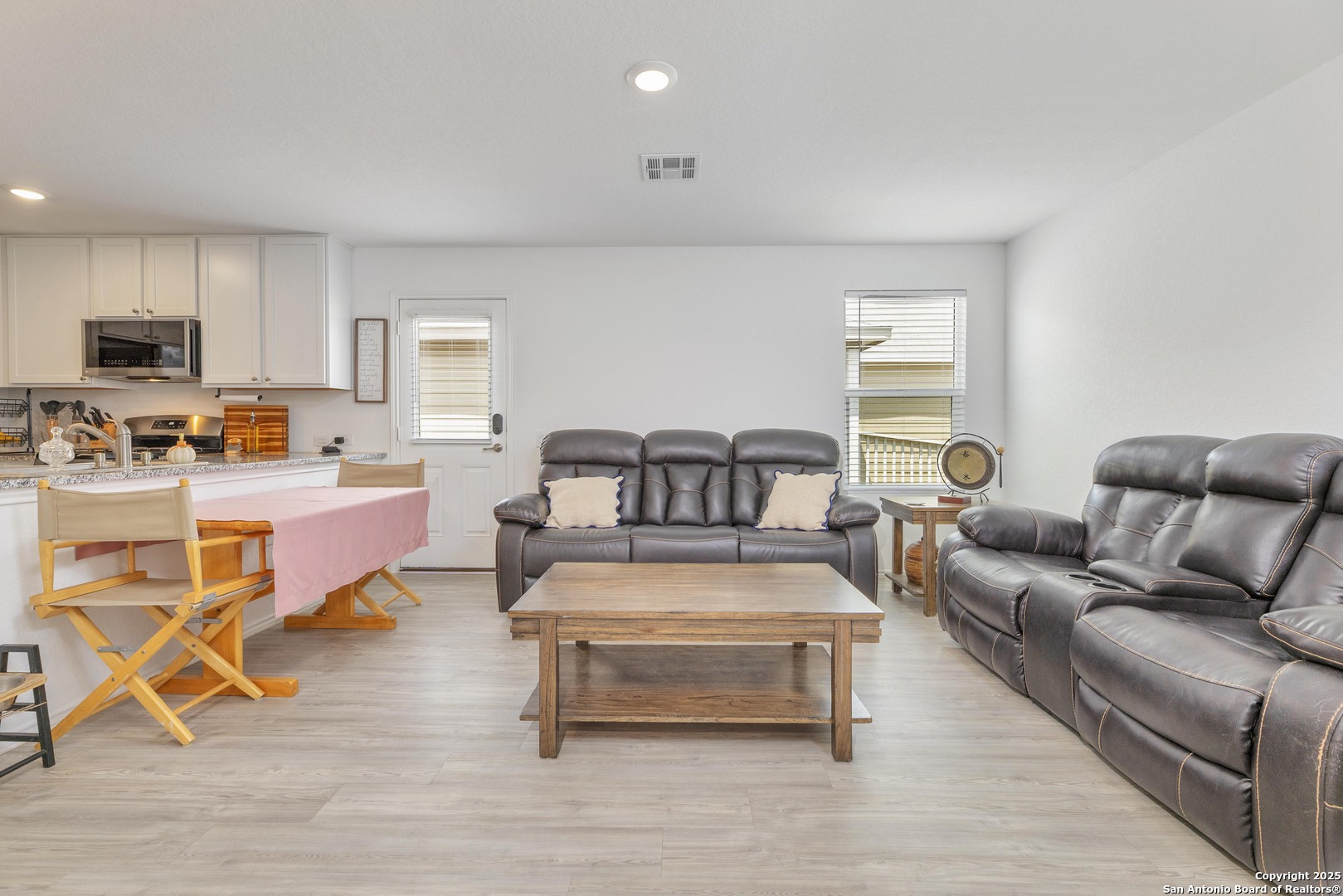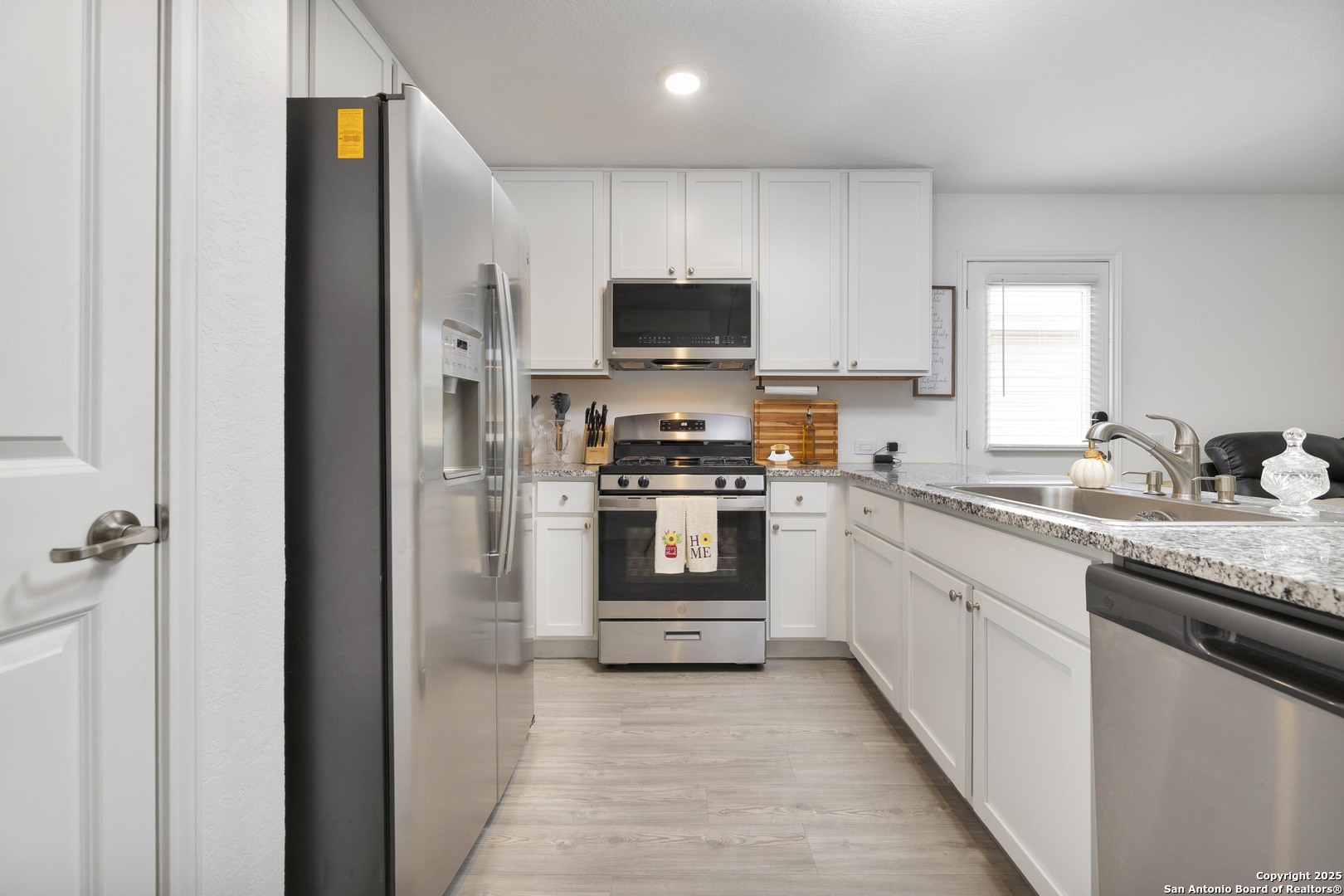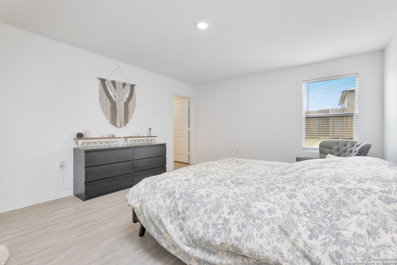 Welcome to this modern single-story home in Northeast Crossing. Built in 2021, this move-in ready 3-bedroom, 2-bath layout offers clean design, open space, and low-maintenance living. Step inside to an open-concept living and dining area with upgraded wood-look flooring and abundant natural light. The kitchen features granite countertops, white cabinetry, stainless appliances, and a gas range - perfect for home chefs and everyday ease. The spacious primary suite includes a walk-in closet and private bath with granite vanity and shower/tub combo. Two additional bedrooms provide flexibility for guests, kids, or a home office. Enjoy a fully fenced backyard, ideal for pets or play, plus a 2-car garage and wide driveway. The neighborhood is tucked into NEISD with no city taxes and convenient access to Loop 410, I-35, and Fort Sam.