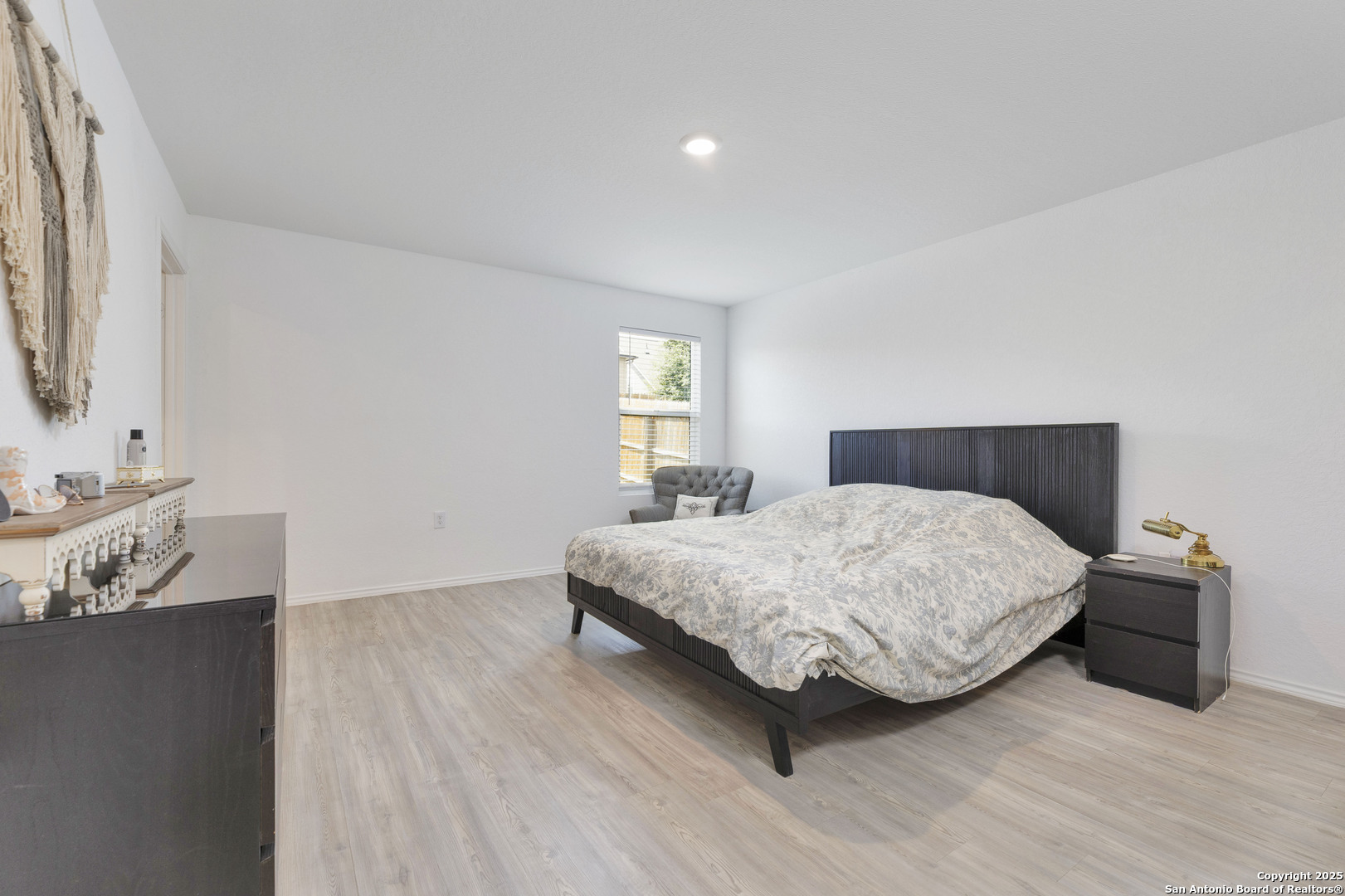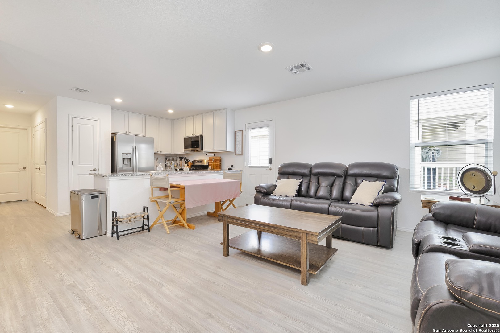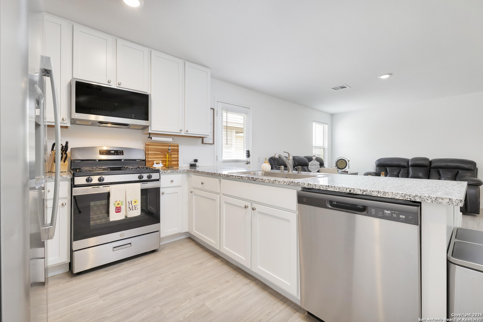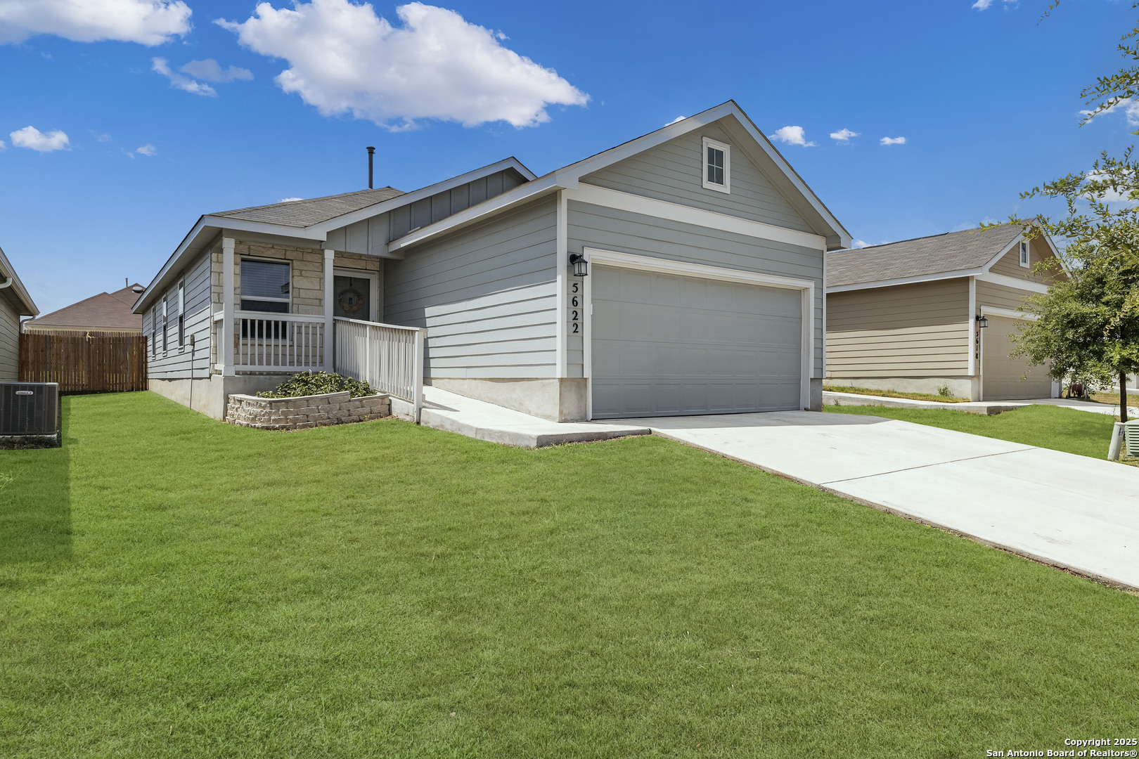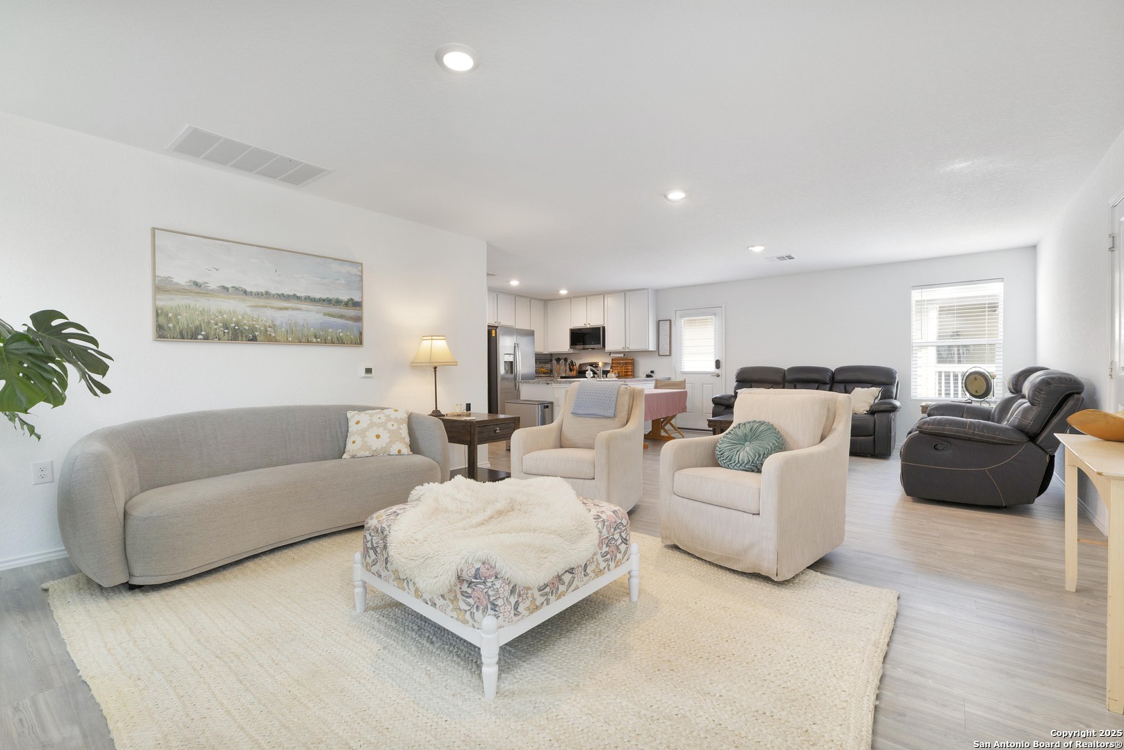 Welcome to this modern single-story home in Northeast Crossing. Built in 2021, this move-in ready 3-bedroom, 2-bath layout offers clean design, open space, and low-maintenance living. Step inside to an open-concept living and dining area with upgraded wood-look flooring and abundant natural light. The kitchen features granite countertops, white cabinetry, stainless appliances, and a gas range - perfect for home chefs and everyday ease. The spacious primary suite includes a walk-in closet and private bath with granite vanity and shower/tub combo. Two additional bedrooms provide flexibility for guests, kids, or a home office. Enjoy a fully fenced backyard, ideal for pets or play, plus a 2-car garage and wide driveway. The neighborhood is tucked into NEISD with no city taxes and convenient access to Loop 410, I-35, and Fort Sam.