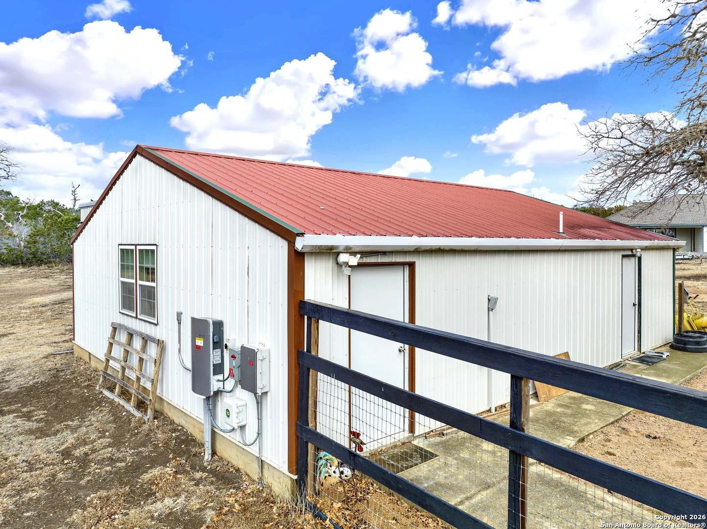 Welcome home to this exceptionally well-kept and thoughtfully updated 3-bedroom, 2-bath home situated on three lots totaling approximately 1.6 acres, shaded by beautiful mature trees and tucked away on a quiet cul-de-sac. This property offers space, functionality, and comfort both inside and out. Inside, you'll find numerous upgrades, including new flooring and pine ceilings (2019), granite countertops (2023), stainless steel appliances featuring a Bosch dishwasher, electric stove, and refrigerator, plus custom up and down blinds in the livingroom, zebra blinds in the primary, guest room, and dining room. The living room showcases a custom built-in and a cozy wood-burning fireplace (chimney swept 2025). The primary suite was expanded and updated in 2023, offering an upgraded closet and a beautifully remodeled bath with double sinks, walk-in shower, and French-door closet. A 2023 laundry room extension adds convenience with a walk-in pantry, and added storage. Additional improvements include a 2023 hot water heater, metal roof, and heat pump water heater. This home offers ADA accessibility, including an accessible bedroom and bathroom with walk-in shower. A spacious enclosed sunroom (approx. 320 sq ft) with a mini-split provides year-round enjoyment, while a covered back patio is perfect for relaxing outdoors. The property truly shines with its exterior features: a 36x30 shop with electric, A/C, water, and toilet; open RV cover (20x40); 10.5x16 red barn with ramp for golf cart, mower, or storage; chicken coop; and four 1,250-gallon rainwater collection tanks. Additional highlights include wired generator hookup, paid solar panels, traditional septic pump replaced in 2019, and quarterly pest control. A rare opportunity offering privacy, upgrades, and versatility-this property is ready to be enjoyed.