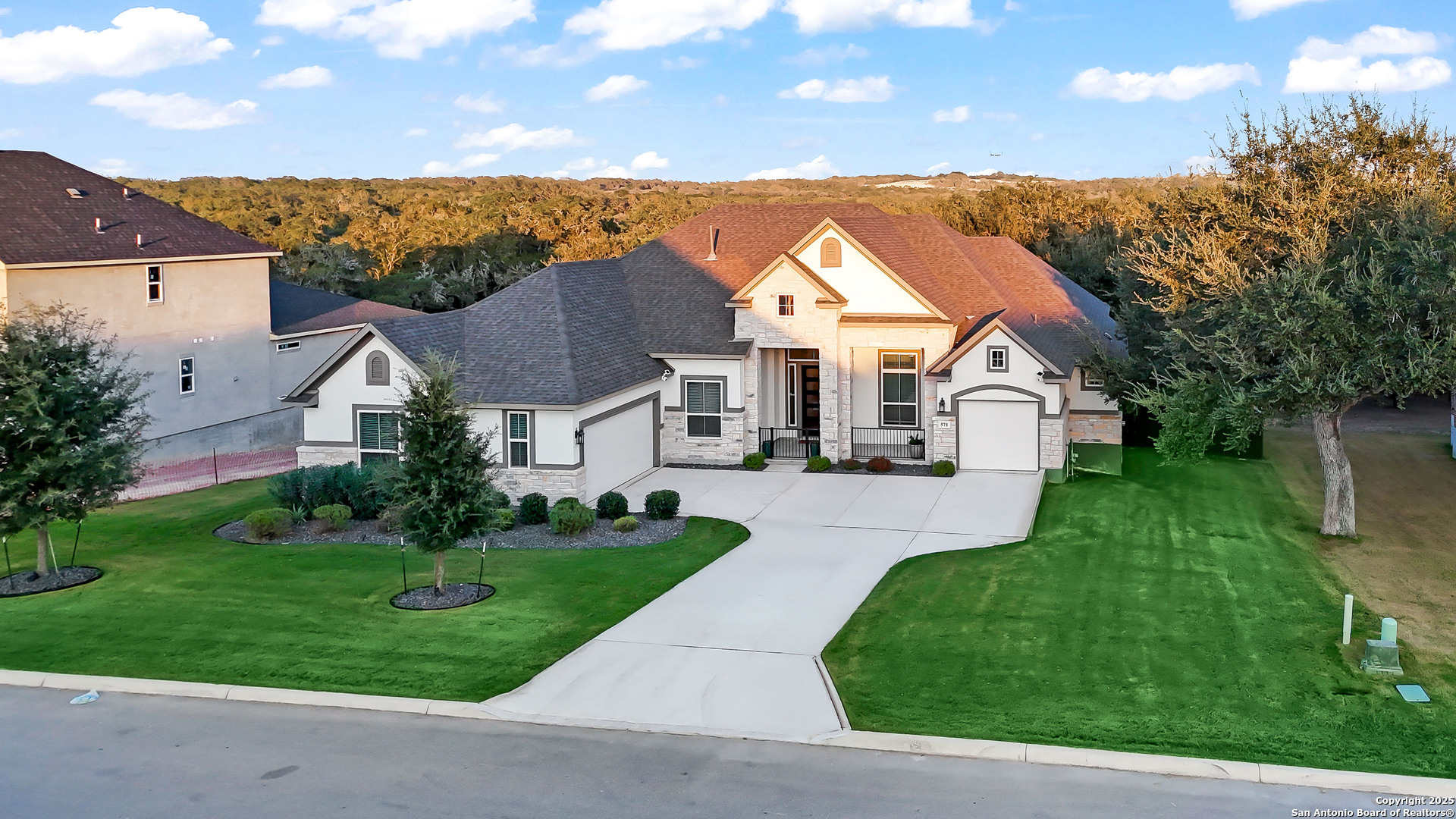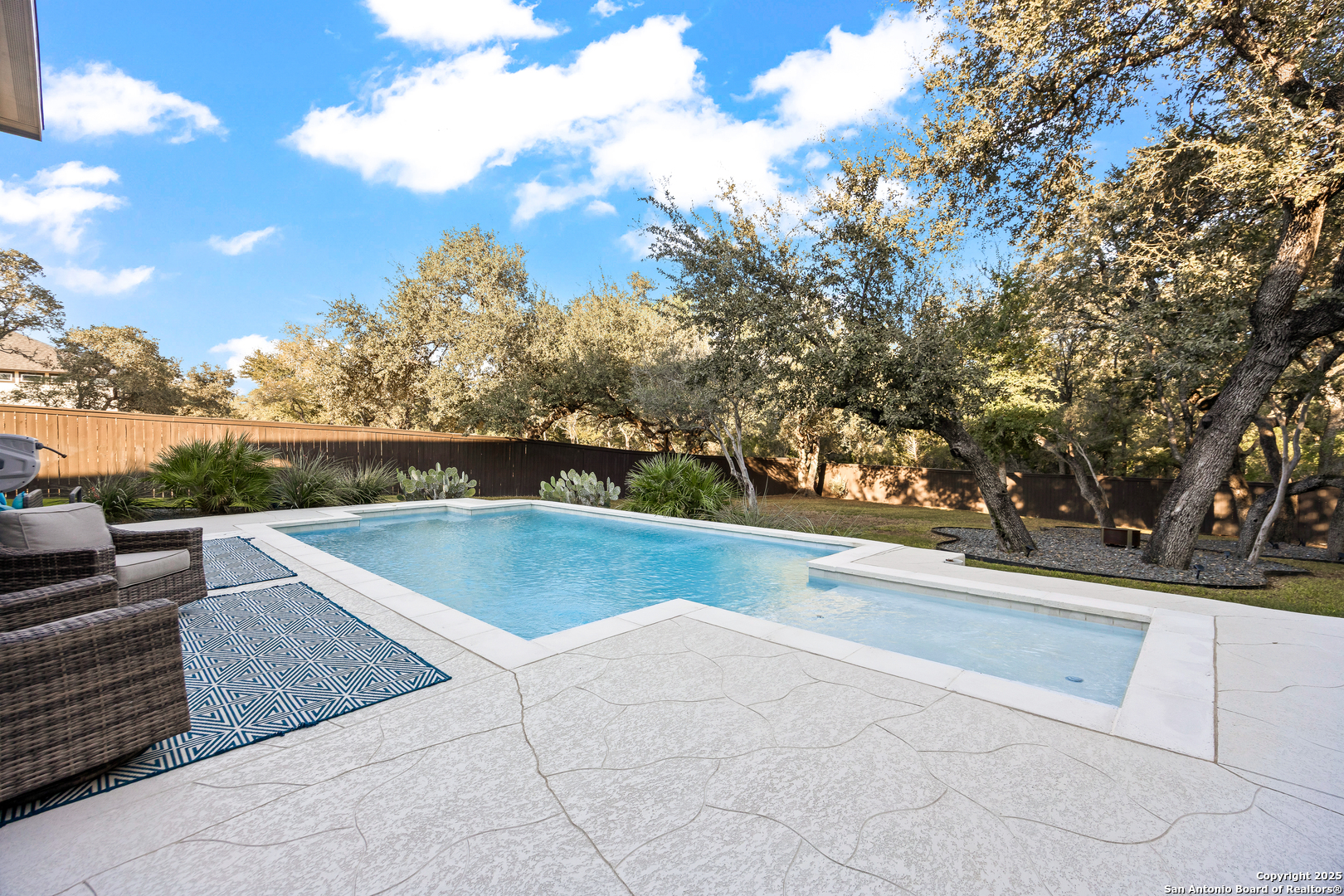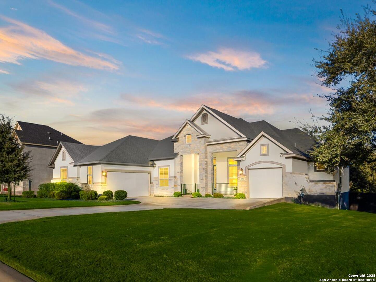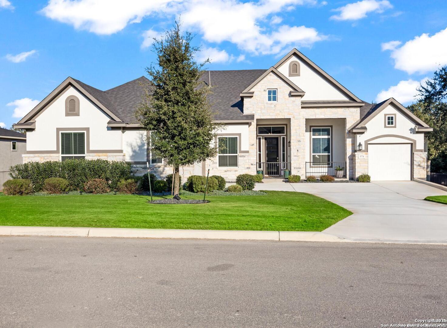3.88 VA Assumable Loan Available! This exquisite one-story Chesmar home features one of the builder's most popular floor plans, offering soaring ceilings, elegant finishes, and an open concept layout designed for both everyday comfort and effortless entertaining. At the center of the home, the expansive living area showcases custom built-ins and a striking fireplace that adds warmth and sophistication. The gourmet kitchen is a true showpiece, featuring dual islands, an oversized walk-in pantry, abundant cabinetry and counter space, a reverse osmosis system, stainless steel appliances, a GE Profile five-burner gas cooktop, pot filler, and two breakfast bars ideal for gatherings. The private primary suite offers serene views and patio access, along with a spa-like bathroom featuring a freestanding soaking tub, oversized walk-in shower, dual vanities, linen storage, and a custom closet with built-ins and triple hanging rods. Each secondary bedroom includes a private bath and walk-in closet for maximum comfort and privacy. A dedicated study with 12-foot ceilings and French doors provides the perfect space for work or quiet retreat. Additional highlights include mounted televisions (included), a well-appointed utility room with cabinetry, granite counters, refrigerator space, hanging rod, and a practical drop zone. The three-car split garage is finished with epoxy floors, custom shelving, and a Defender Series water softener. The property sits on a generous .47-acre greenbelt lot surrounded by mature trees and professional landscaping. The fully fenced yard includes a full sprinkler system, ensuring the grounds remain lush and vibrant year-round. Enjoy exceptional outdoor living with a screened-in patio complete with a cozy gas fireplace and stamped concrete flooring. Beyond the patio, discover a resort-style backyard that stands out from the rest-featuring an in-ground pool with quad massaging jets, a sun deck with a sparkling fountain, and a top-of-the-line system allowing the pool to be heated or cooled for year-round enjoyment. Located within the highly acclaimed Medina Valley ISD, this home offers refined living in a convenient location with easy access to Highway 90 and Loop 1604.
