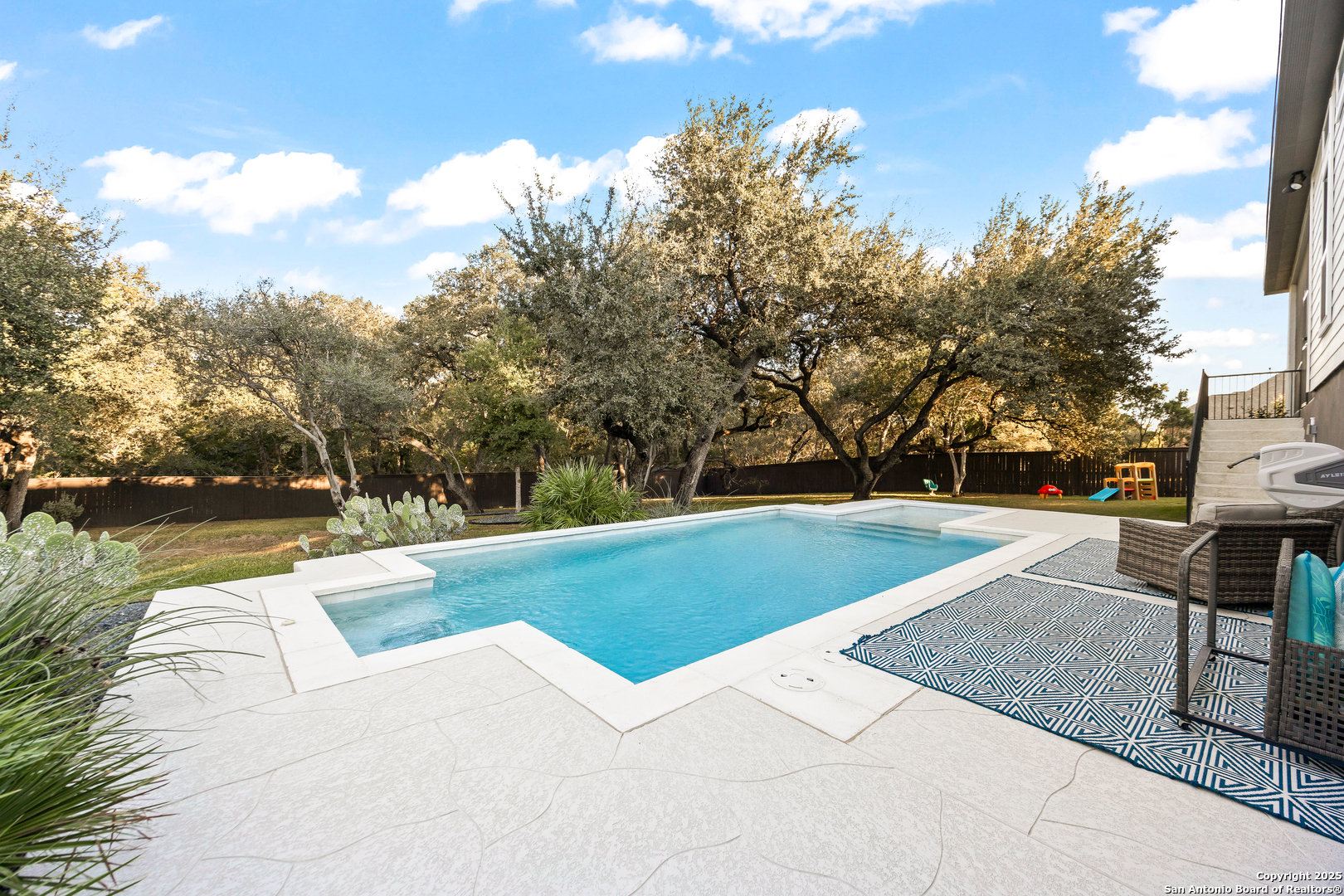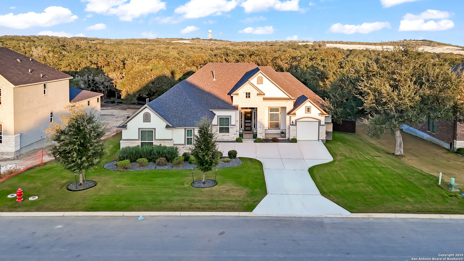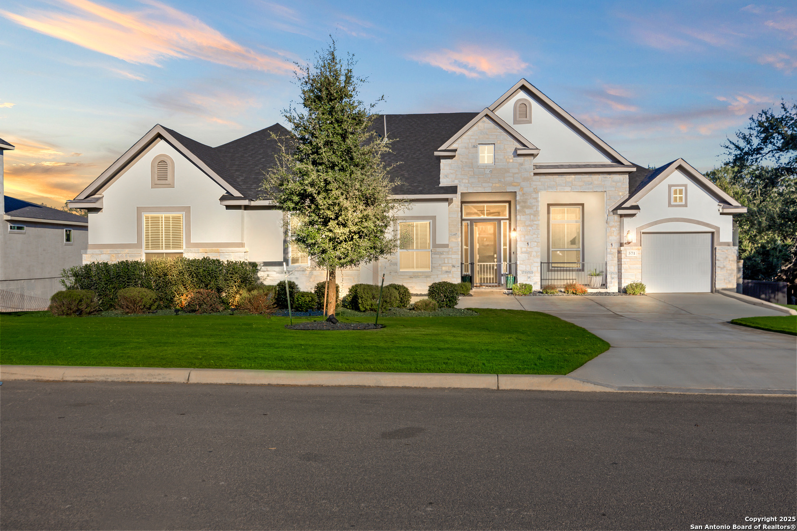 3.88 VA Assumable Loan Available! This exquisite one-story Chesmar home features one of the builder's most popular floor plans, offering soaring ceilings, elegant finishes, and an open concept layout designed for both everyday comfort and effortless entertaining. At the center of the home, the expansive living area showcases custom built-ins and a striking fireplace that adds warmth and sophistication. The gourmet kitchen is a true showpiece, featuring dual islands, an oversized walk-in pantry, abundant cabinetry and counter space, a reverse osmosis system, stainless steel appliances, a GE Profile five-burner gas cooktop, pot filler, and two breakfast bars ideal for gatherings. The private primary suite offers serene views and patio access, along with a spa-like bathroom featuring a freestanding soaking tub, oversized walk-in shower, dual vanities, linen storage, and a custom closet with built-ins and triple hanging rods. Each secondary bedroom includes a private bath and walk-in closet for maximum comfort and privacy. A dedicated study with 12-foot ceilings and French doors provides the perfect space for work or quiet retreat. Additional highlights include mounted televisions (included), a well-appointed utility room with cabinetry, granite counters, refrigerator space, hanging rod, and a practical drop zone. The three-car split garage is finished with epoxy floors, custom shelving, and a Defender Series water softener. The property sits on a generous .47-acre greenbelt lot surrounded by mature trees and professional landscaping. The fully fenced yard includes a full sprinkler system, ensuring the grounds remain lush and vibrant year-round. Enjoy exceptional outdoor living with a screened-in patio complete with a cozy gas fireplace and stamped concrete flooring. Beyond the patio, discover a resort-style backyard that stands out from the rest-featuring an in-ground pool with quad massaging jets, a sun deck with a sparkling fountain, and a top-of-the-line system allowing the pool to be heated or cooled for year-round enjoyment. Located within the highly acclaimed Medina Valley ISD, this home offers refined living in a convenient location with easy access to Highway 90 and Loop 1604.
