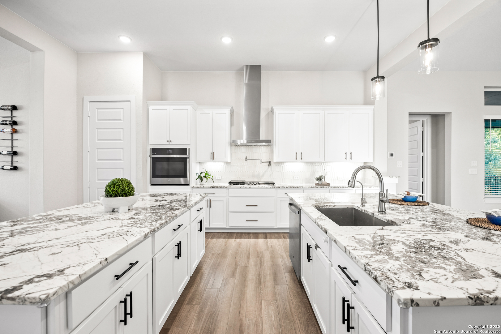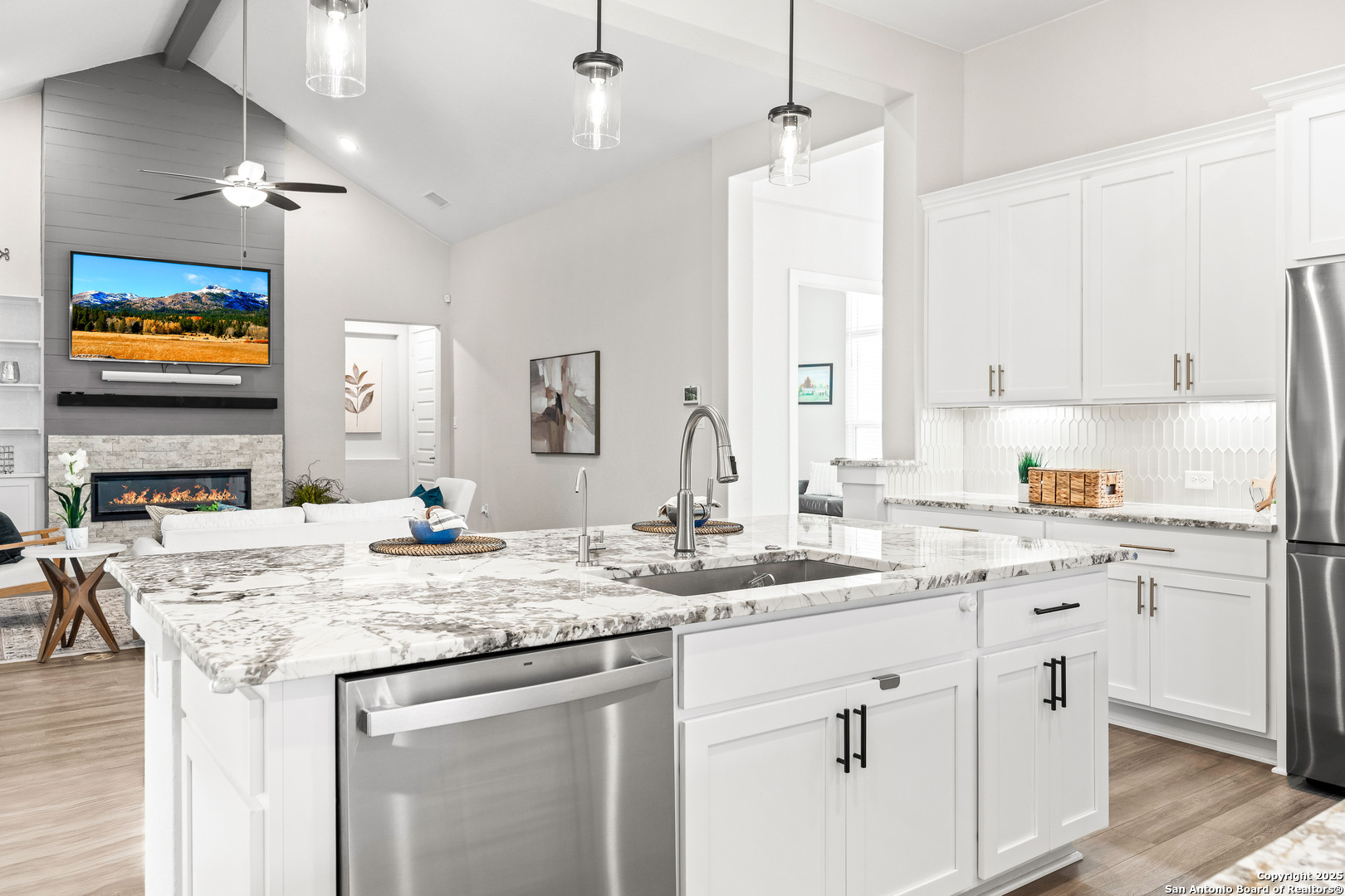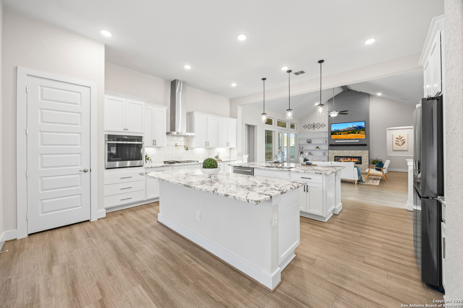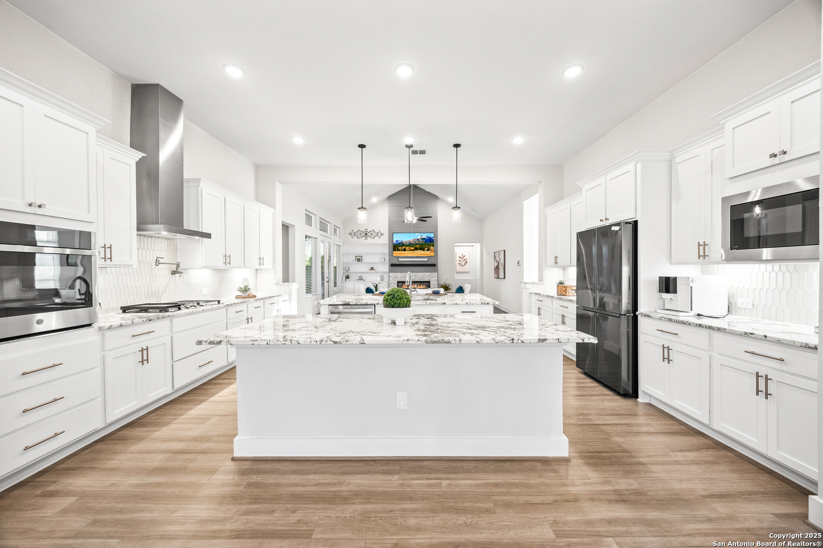 3.88 VA Assumable Loan Available! This exquisite one-story Chesmar home features one of the builder's most popular floor plans, offering soaring ceilings, elegant finishes, and an open concept layout designed for both everyday comfort and effortless entertaining. At the center of the home, the expansive living area showcases custom built-ins and a striking fireplace that adds warmth and sophistication. The gourmet kitchen is a true showpiece, featuring dual islands, an oversized walk-in pantry, abundant cabinetry and counter space, a reverse osmosis system, stainless steel appliances, a GE Profile five-burner gas cooktop, pot filler, and two breakfast bars ideal for gatherings. The private primary suite offers serene views and patio access, along with a spa-like bathroom featuring a freestanding soaking tub, oversized walk-in shower, dual vanities, linen storage, and a custom closet with built-ins and triple hanging rods. Each secondary bedroom includes a private bath and walk-in closet for maximum comfort and privacy. A dedicated study with 12-foot ceilings and French doors provides the perfect space for work or quiet retreat. Additional highlights include mounted televisions (included), a well-appointed utility room with cabinetry, granite counters, refrigerator space, hanging rod, and a practical drop zone. The three-car split garage is finished with epoxy floors, custom shelving, and a Defender Series water softener. The property sits on a generous .47-acre greenbelt lot surrounded by mature trees and professional landscaping. The fully fenced yard includes a full sprinkler system, ensuring the grounds remain lush and vibrant year-round. Enjoy exceptional outdoor living with a screened-in patio complete with a cozy gas fireplace and stamped concrete flooring. Beyond the patio, discover a resort-style backyard that stands out from the rest-featuring an in-ground pool with quad massaging jets, a sun deck with a sparkling fountain, and a top-of-the-line system allowing the pool to be heated or cooled for year-round enjoyment. Located within the highly acclaimed Medina Valley ISD, this home offers refined living in a convenient location with easy access to Highway 90 and Loop 1604.