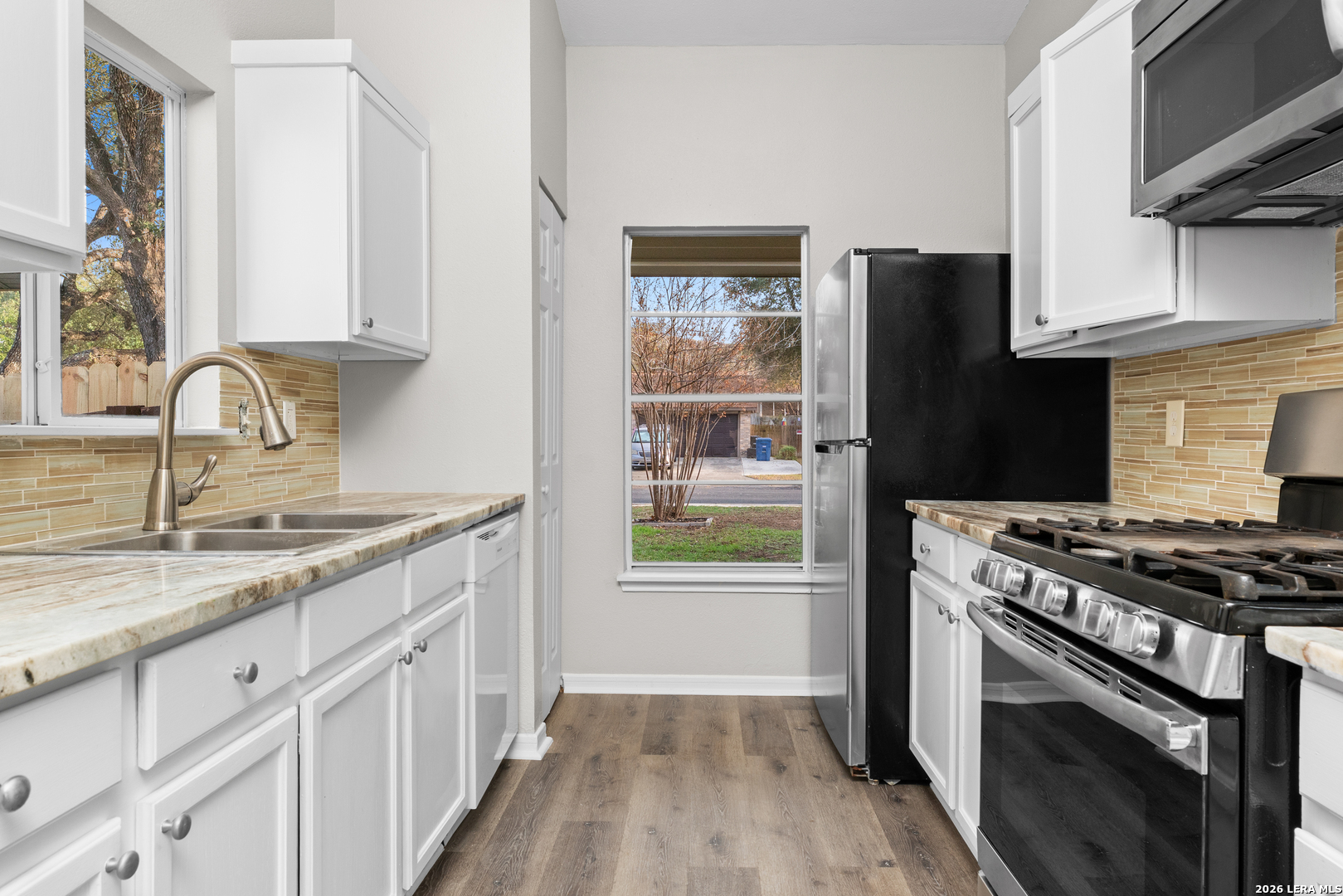 **OPEN HOUSE** SATURDAY FEB 21ST 12PM-3PM!! .23 ACRE LOT! CUTE AS A BUTTON! WITH 1235 SQ FT OF LIVING AREA, THIS 3 BED, 2 BATH HOME IS VERY CONTEMPORARY, GORGEOUS & INVITING! 1 MILE FROM 1604, AND EXTREMELY NEAR LOOP 1604 & IH 35 INTERSECTION. ENJOY YOUR SERENE LIVING ROOM ENCOMPASSED W/ A MODERN LOOKING FIREPLACE & A SEPARATE SPACIOUS DINING ROOM. RECENT UPGRADES INCLUDE: LUXURY VINYL PLANK THROUGHOUT ENTIRE HOME, STUNNING QUARTZ KITCHEN COUNTERTOPS, GAS COOKING, MASTER BATHROOM & GUEST BATHROOM COMPLETELY REMODELED W/ ULTRAMODERN SELECTIONS. DESIGNER PAINT THROUGHOUT INTERIOR, UPGRADED INTERIOR DOORS, ELEGANT KITCHEN BACKSPLASH, LAVISH LIGHT FIXTURES, 3 INCH COLONIAL BASEBOARDS, 40 INCH WIDE FRONT DOOR, AND RECENTLY INSTALLED HVAC UNIT. ENJOY YOUR BEAUTIFUL BACKYARD WITH NO REAR NEIGHBORS. SCHEDULE YOUR VIEWING TODAY. YOU WILL BE AMAZED!