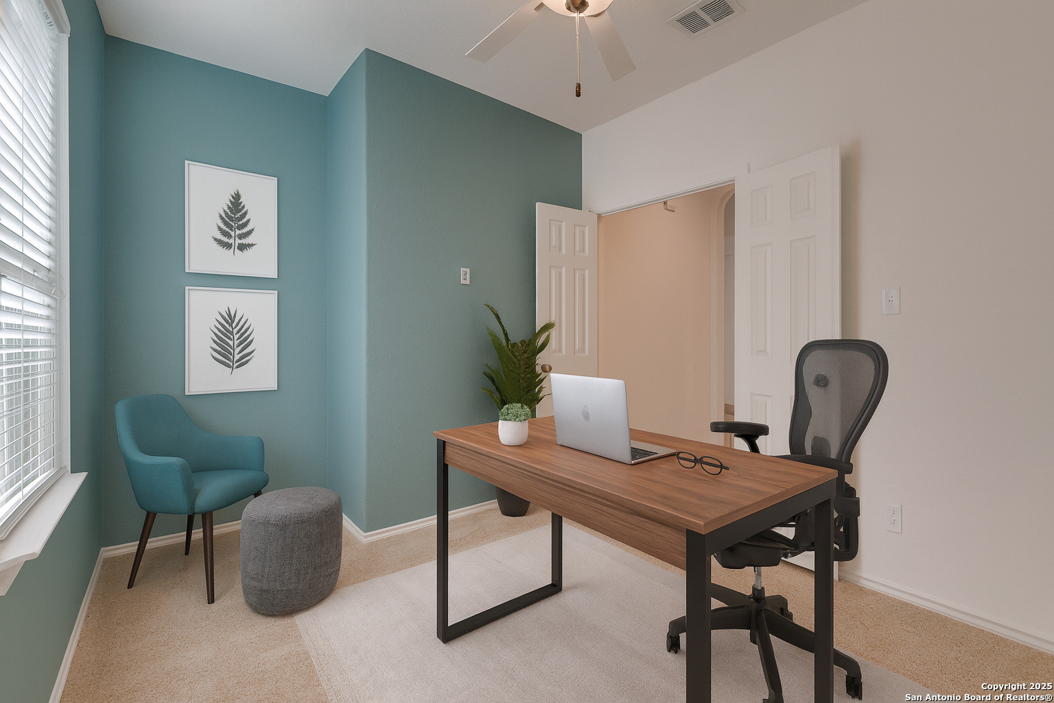 Welcome to this beautifully updated 3-bedroom, 2-bathroom home with an additional OFFICE (that can easily be converted to a 4th bedroom)! Located in the highly sought-after Wortham Oaks neighborhood, this home features a spacious, open-concept floorplan that is perfect for both family living and entertaining. The area qualifies for USDA loans with potential for ZERO DOWN! The home has been recently updated with fresh paint throughout, new luxury vinyl plank flooring, and brand-new carpet in the bedrooms. The roof was replaced just a year ago, offering peace of mind for years to come. Additionally, the water heater was replaced only 6 months ago. The primary bedroom includes a large walk-in closet with plenty of room for all your belongings. The property also boasts updated light fixtures and ceiling fans, which bring a modern touch to every room. Outside, the level backyard is perfect for outdoor activities, and the playscape can convey with the home. Living in Wortham Oaks comes with great community amenities, including two pools for relaxation and fun and a playground. The neighborhood also brings in food trucks on the weekends and celebrates holidays together, fostering a lively and friendly atmosphere. Built by DR Horton, this home is a true gem in Wortham Oaks. Don't miss the chance to make this updated beauty your new home. And yes...AI did have its hand in some of the pictures; if AI has this much creativity with this blank canvas, how much more will you be able to make it your own personal home! Schedule your private tour today! Buyer to verify all schools and measurements.