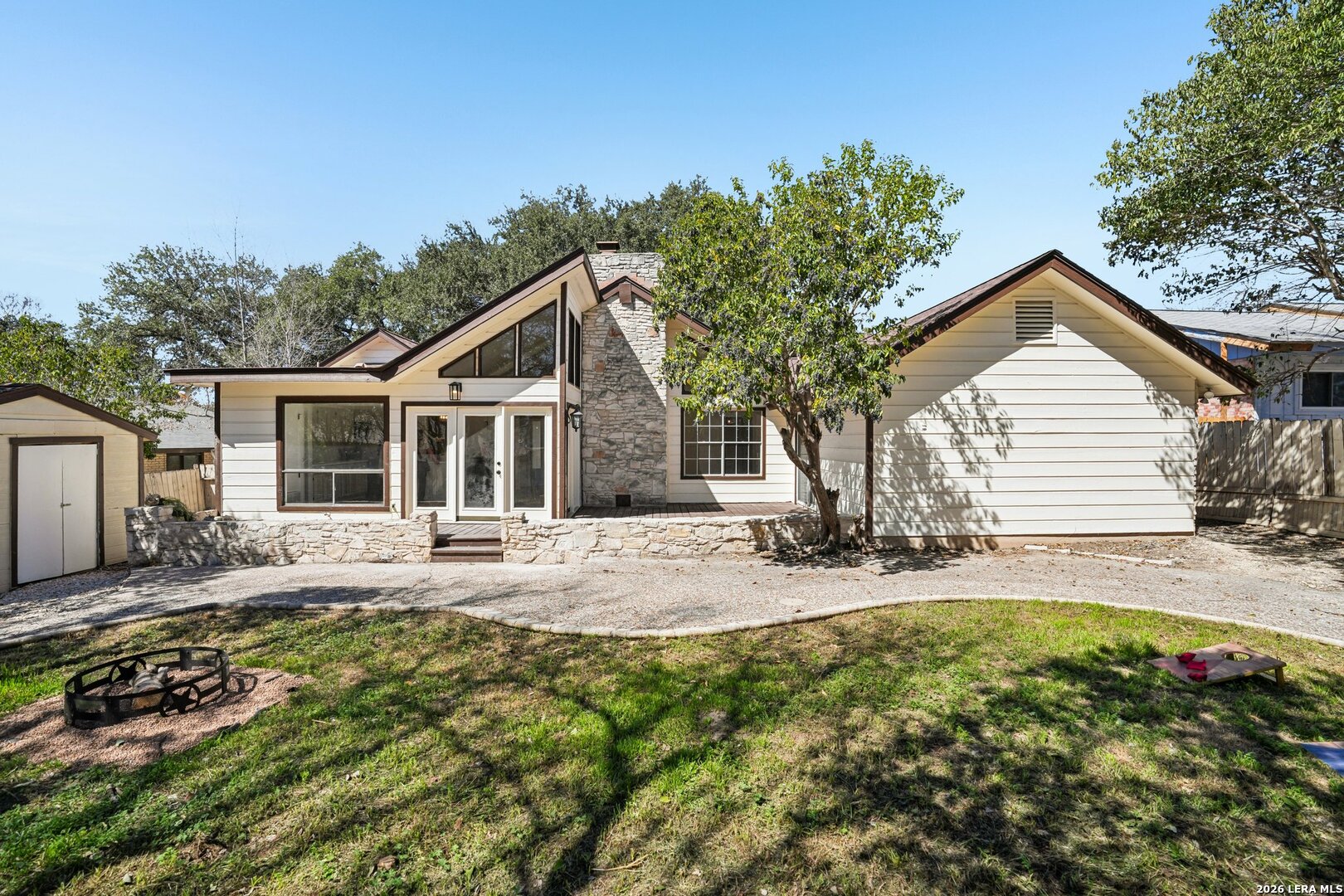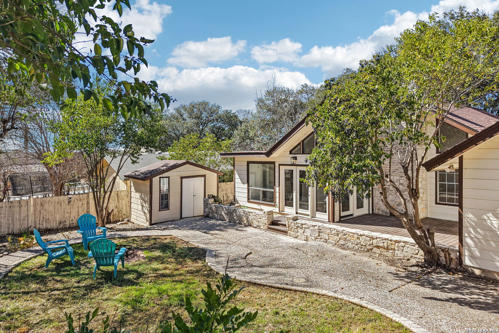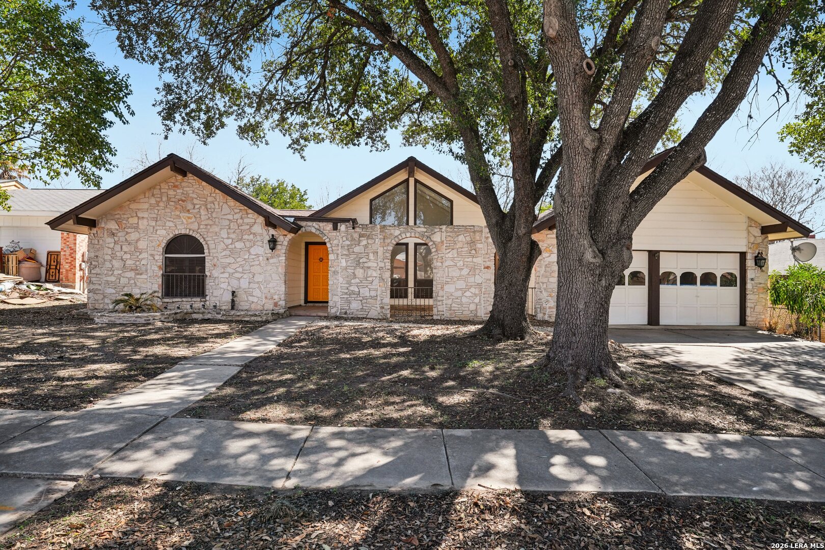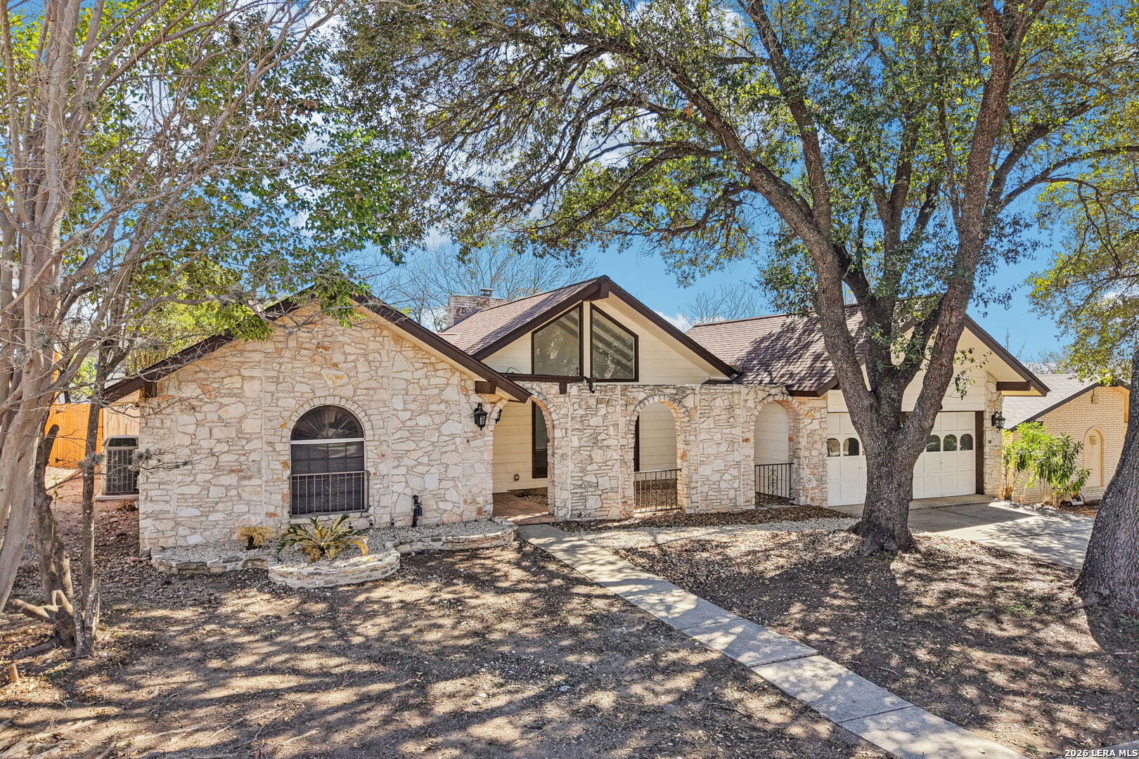 ** OPEN HOUSE on Sunday, 03/08/2026 from 1-4pm and Thursday, 03/12/2026 from 5-7pm ** Located in Leon Valley, this single-story, fully remodeled home offers timeless charm, thoughtful updates, and a prime setting surrounded by mature trees. The striking stone exterior and tiled front porch create an inviting first impression. Inside, vaulted high ceilings and abundant windows fill the home with natural light, enhancing its open, airy feel. Two spacious living areas provide flexibility for entertaining, relaxing, or creating a dedicated workspace. The main living room centers around a natural-stone gas fireplace and includes a built-in desk that can easily function as a coffee station or planning center. The eat-in kitchen is both stylish and functional, featuring a large island with breakfast bar, quartz countertops, stainless steel appliances, extensive cabinetry, and generous counter space. A combined walk-in pantry and laundry room adds convenience, while abundant storage throughout the home ensures everything has its place. The primary suite offers private access to the back deck and a beautifully updated bathroom with two vanities, his-and-her closets, and a tile shower. The guest bathroom also features dual vanities and elegant finishes, creating a cohesive and modern feel. Step outside to a private backyard designed for relaxation and entertaining. An expansive wood deck, additional patio slab, and tranquil fountain enhance the outdoor experience. The wired storage shed can double as a workshop, and mature trees offer a peaceful backdrop. Situated with easy access to Loop 410 for a convenient commute across San Antonio, this property provides the comfort of a quiet, established neighborhood within minutes of restaurants, shopping, and essential services.