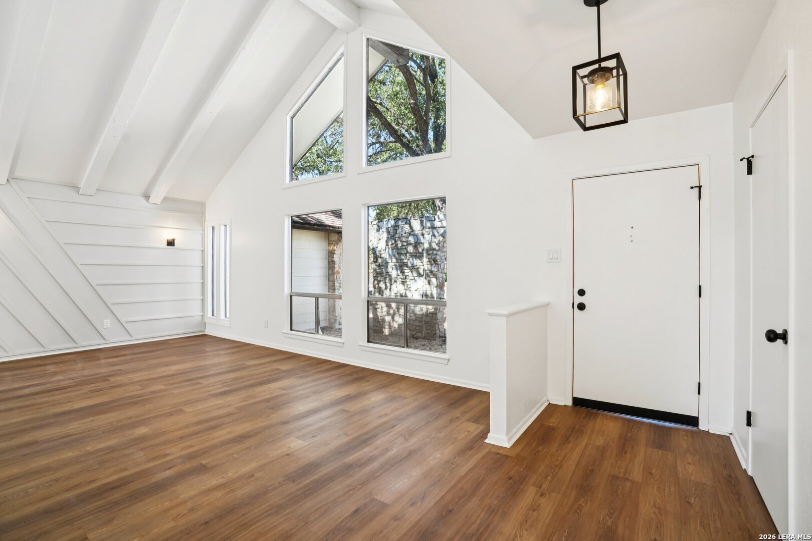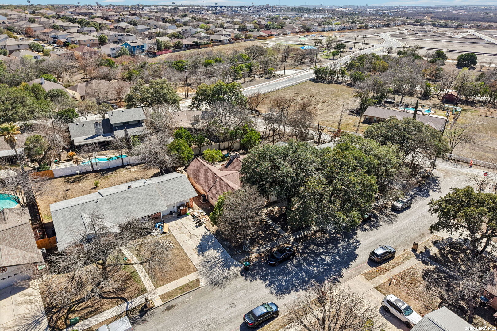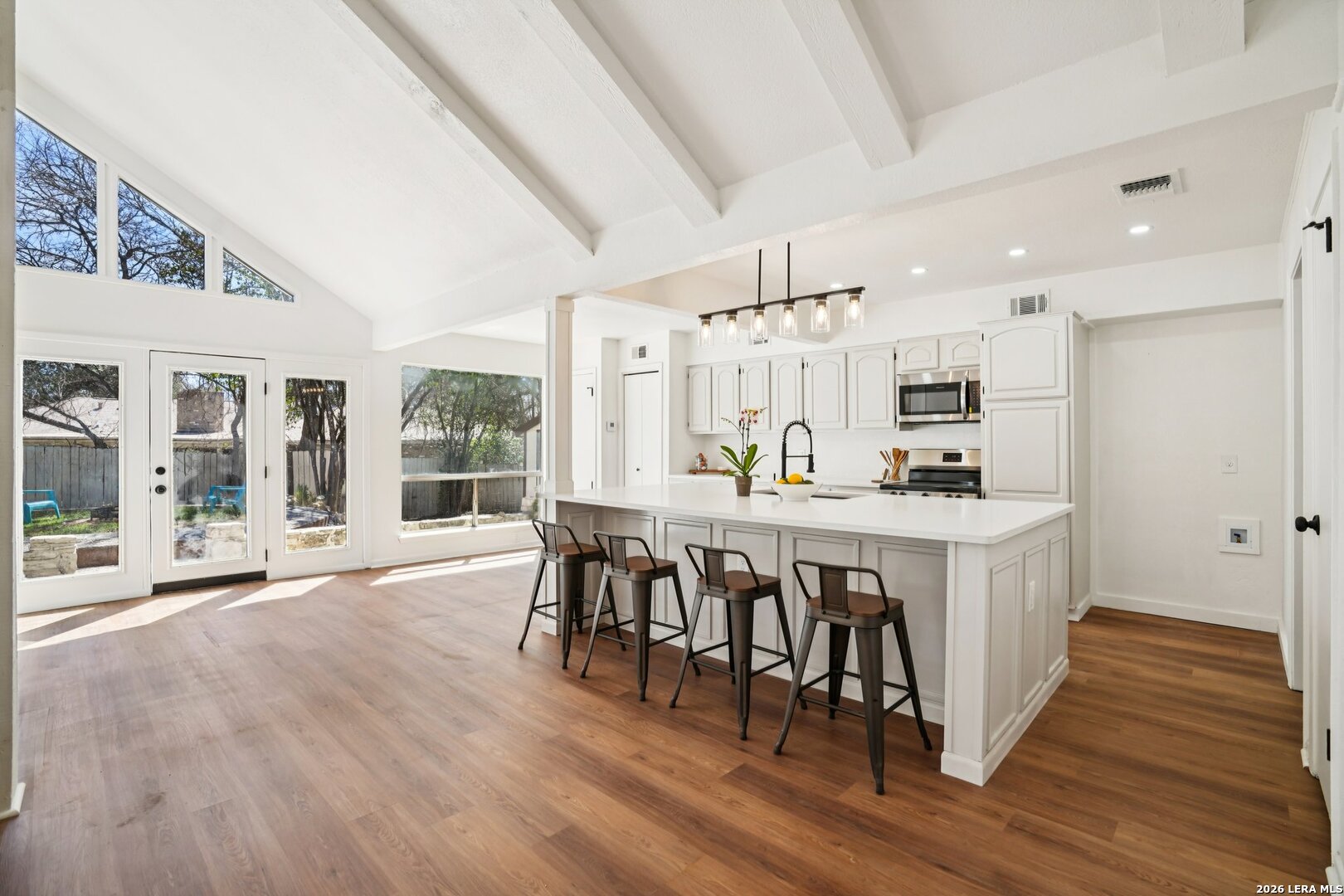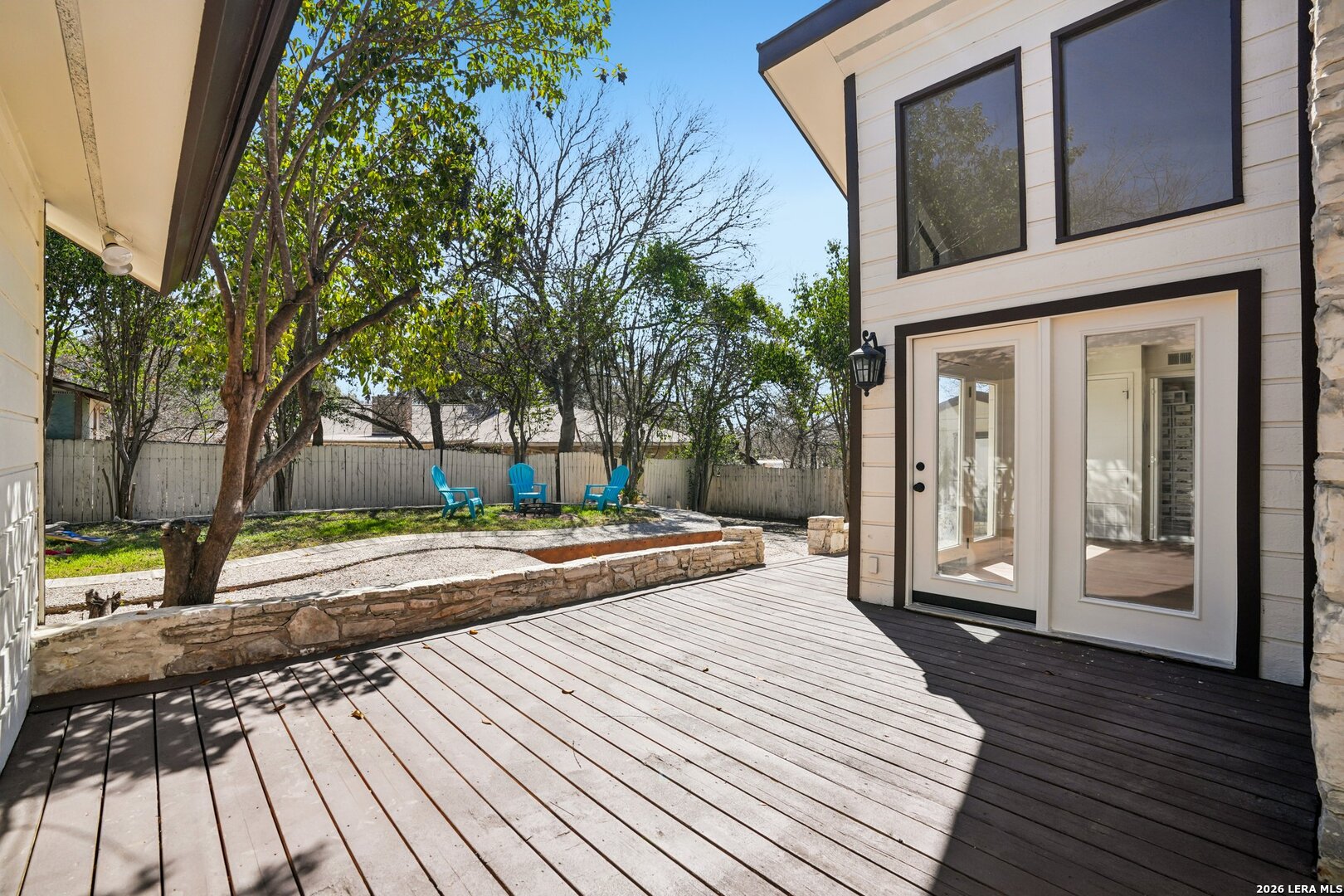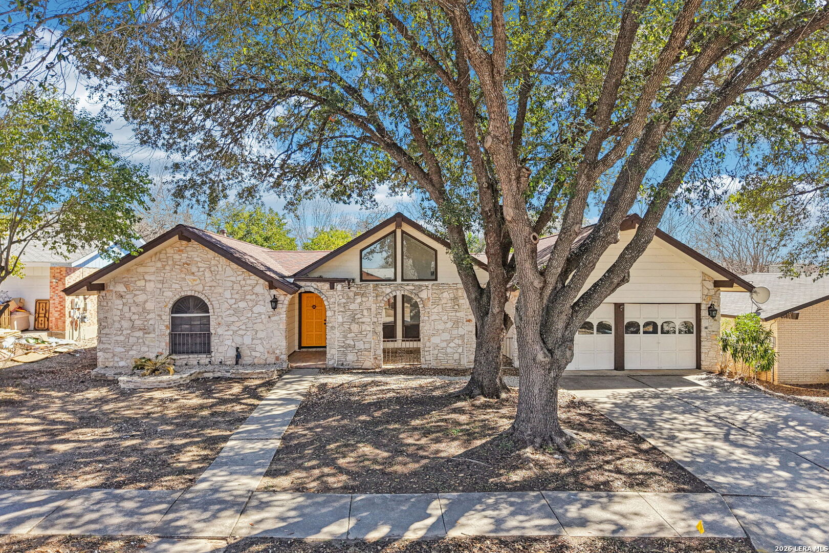 ** OPEN HOUSE on Sunday, 03/08/2026 from 1-4pm and Thursday, 03/12/2026 from 5-7pm ** Located in Leon Valley, this single-story, fully remodeled home offers timeless charm, thoughtful updates, and a prime setting surrounded by mature trees. The striking stone exterior and tiled front porch create an inviting first impression. Inside, vaulted high ceilings and abundant windows fill the home with natural light, enhancing its open, airy feel. Two spacious living areas provide flexibility for entertaining, relaxing, or creating a dedicated workspace. The main living room centers around a natural-stone gas fireplace and includes a built-in desk that can easily function as a coffee station or planning center. The eat-in kitchen is both stylish and functional, featuring a large island with breakfast bar, quartz countertops, stainless steel appliances, extensive cabinetry, and generous counter space. A combined walk-in pantry and laundry room adds convenience, while abundant storage throughout the home ensures everything has its place. The primary suite offers private access to the back deck and a beautifully updated bathroom with two vanities, his-and-her closets, and a tile shower. The guest bathroom also features dual vanities and elegant finishes, creating a cohesive and modern feel. Step outside to a private backyard designed for relaxation and entertaining. An expansive wood deck, additional patio slab, and tranquil fountain enhance the outdoor experience. The wired storage shed can double as a workshop, and mature trees offer a peaceful backdrop. Situated with easy access to Loop 410 for a convenient commute across San Antonio, this property provides the comfort of a quiet, established neighborhood within minutes of restaurants, shopping, and essential services.