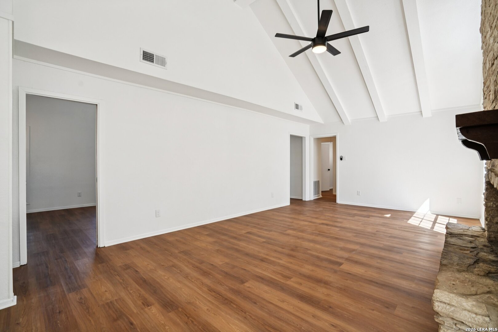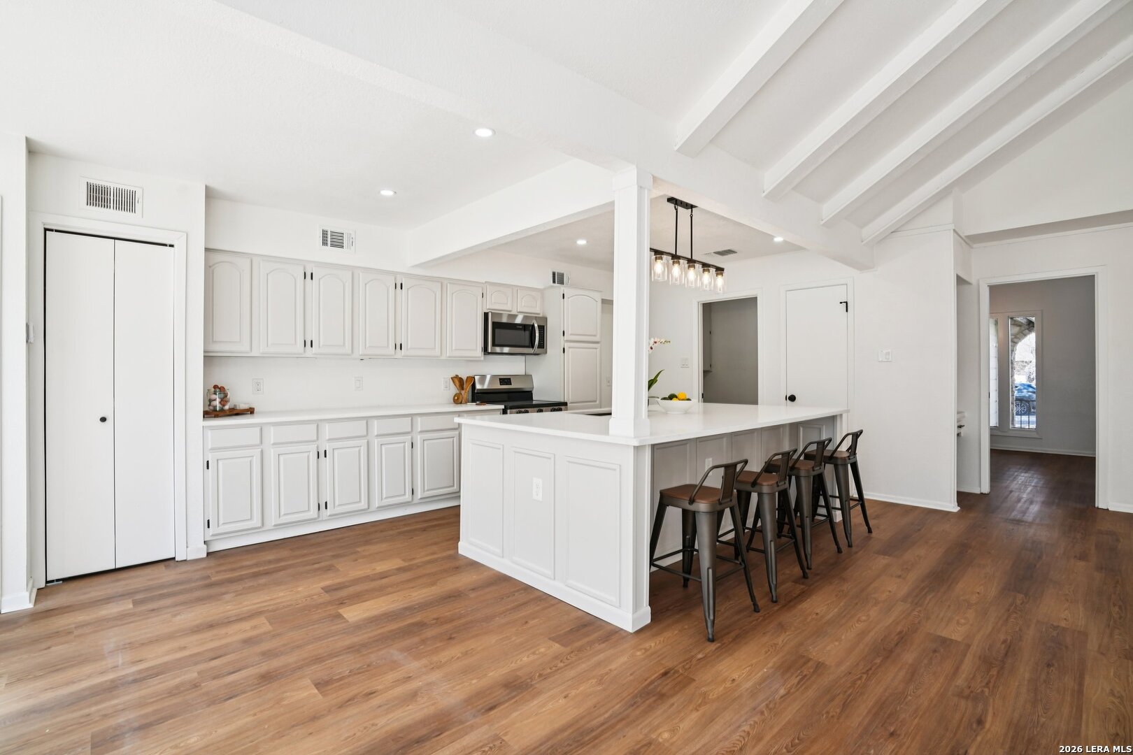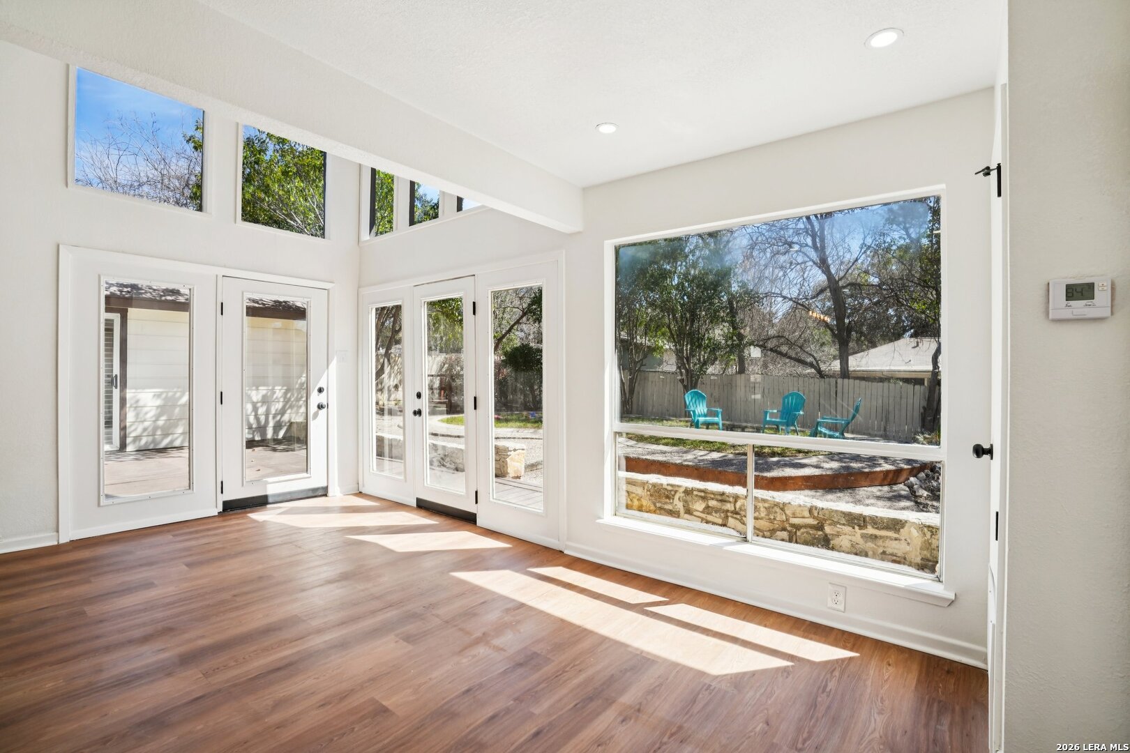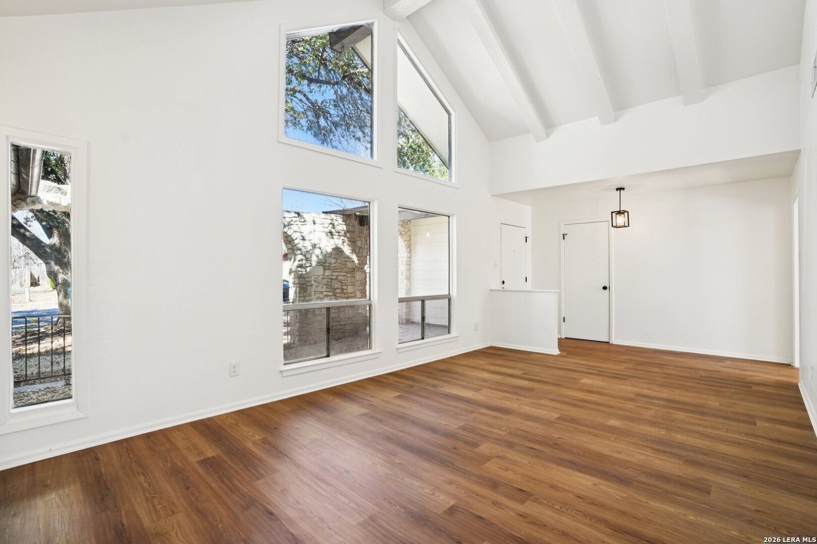 ** OPEN HOUSE on Sunday, 03/08/2026 from 1-4pm and Thursday, 03/12/2026 from 5-7pm ** Located in Leon Valley, this single-story, fully remodeled home offers timeless charm, thoughtful updates, and a prime setting surrounded by mature trees. The striking stone exterior and tiled front porch create an inviting first impression. Inside, vaulted high ceilings and abundant windows fill the home with natural light, enhancing its open, airy feel. Two spacious living areas provide flexibility for entertaining, relaxing, or creating a dedicated workspace. The main living room centers around a natural-stone gas fireplace and includes a built-in desk that can easily function as a coffee station or planning center. The eat-in kitchen is both stylish and functional, featuring a large island with breakfast bar, quartz countertops, stainless steel appliances, extensive cabinetry, and generous counter space. A combined walk-in pantry and laundry room adds convenience, while abundant storage throughout the home ensures everything has its place. The primary suite offers private access to the back deck and a beautifully updated bathroom with two vanities, his-and-her closets, and a tile shower. The guest bathroom also features dual vanities and elegant finishes, creating a cohesive and modern feel. Step outside to a private backyard designed for relaxation and entertaining. An expansive wood deck, additional patio slab, and tranquil fountain enhance the outdoor experience. The wired storage shed can double as a workshop, and mature trees offer a peaceful backdrop. Situated with easy access to Loop 410 for a convenient commute across San Antonio, this property provides the comfort of a quiet, established neighborhood within minutes of restaurants, shopping, and essential services.