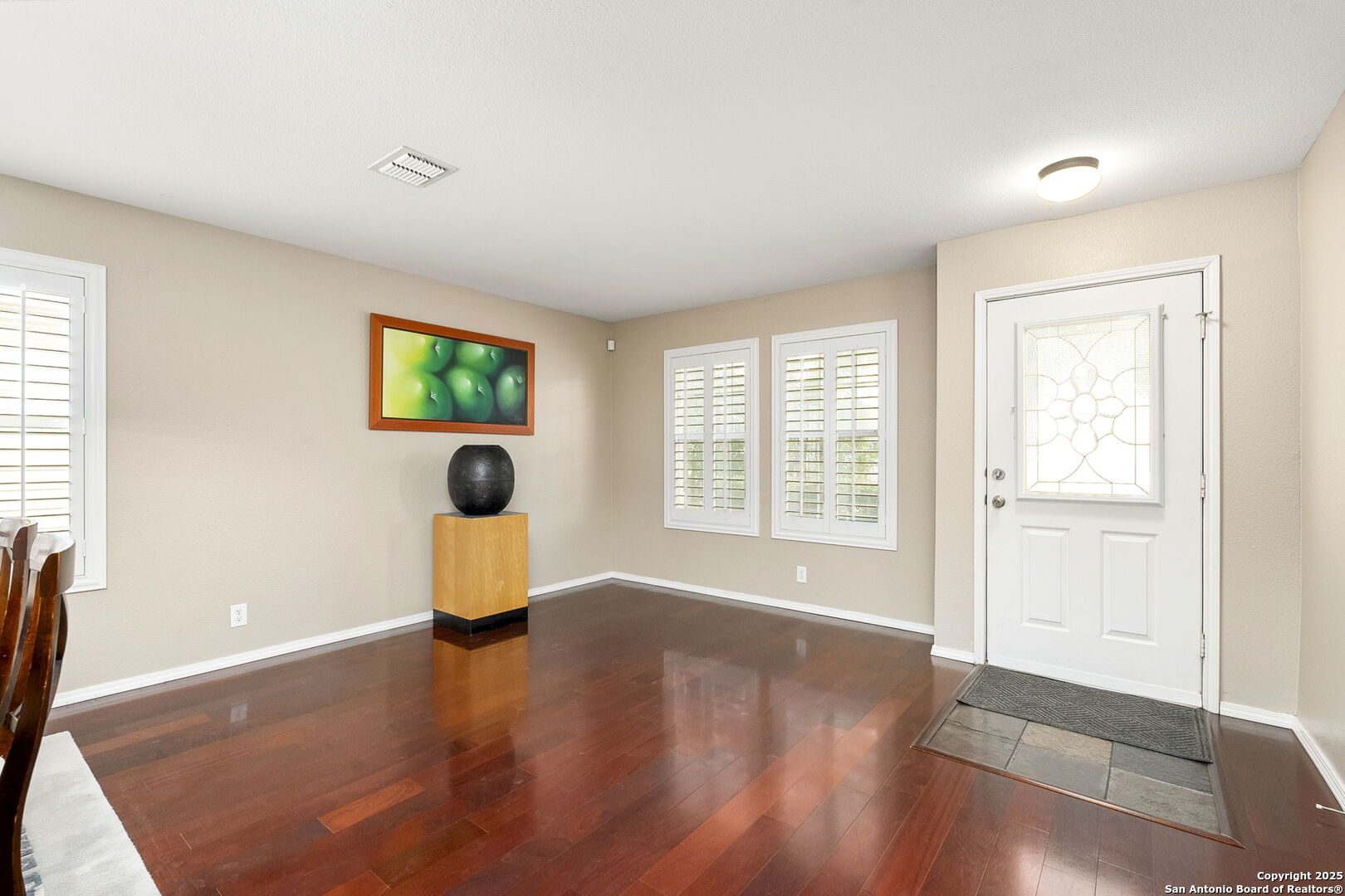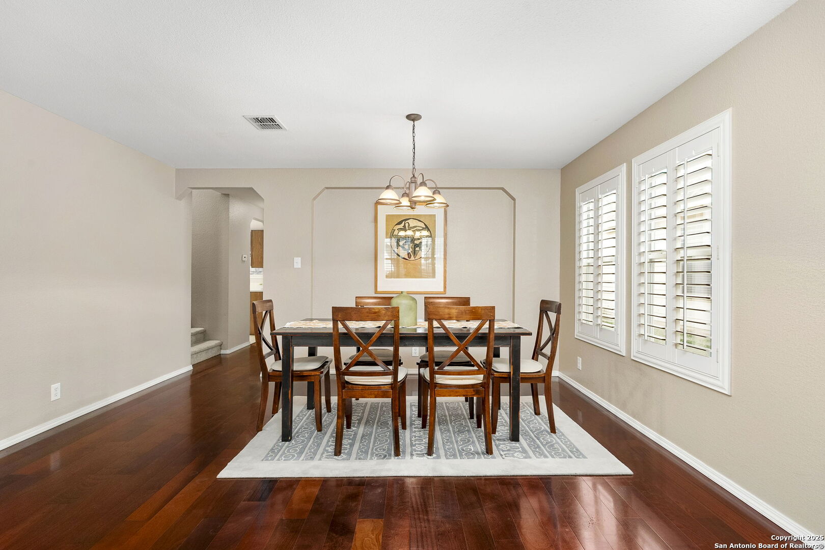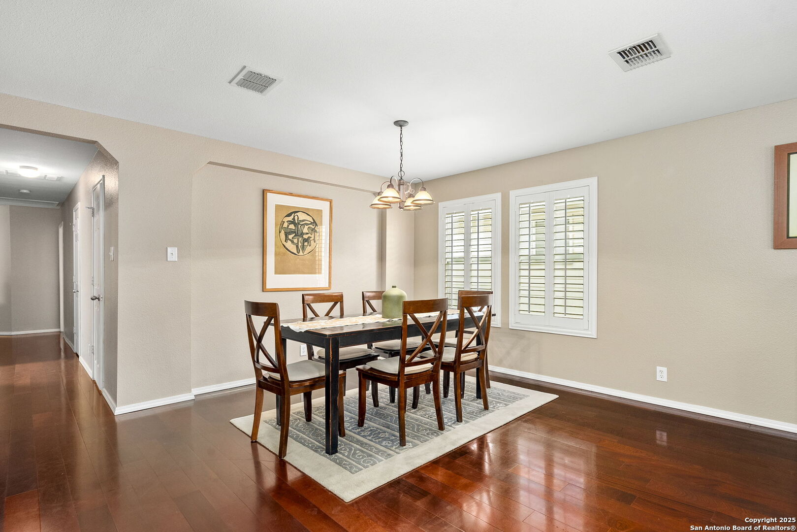 This beautifully maintained home features the Upgraded-Floorplan Package from Centex Homes and showcases a rare exterior finish with three distinct brick styles. Inside, you'll find gorgeous Thomasville hardwood floors throughout the main living areas, complemented by fresh paint and custom plantation shutters and blinds for a refined touch. The modern kitchen is a standout with gleaming stainless steel appliances, a brand-new stove (2024), quartz countertops, and premium cabinetry in both the kitchen and bathrooms. Thoughtful upgrades continue throughout the home with plush carpeting, stylish light fixtures, decorative tile accents, and an elegant upgraded front door. Additional highlights include: Microwave, A/C, and Water Heater all replaced within the last 3 years.Roof replaced approximately 5 years ago. This home is a perfect blend of comfort, quality, and style - ready for its next proud owner.