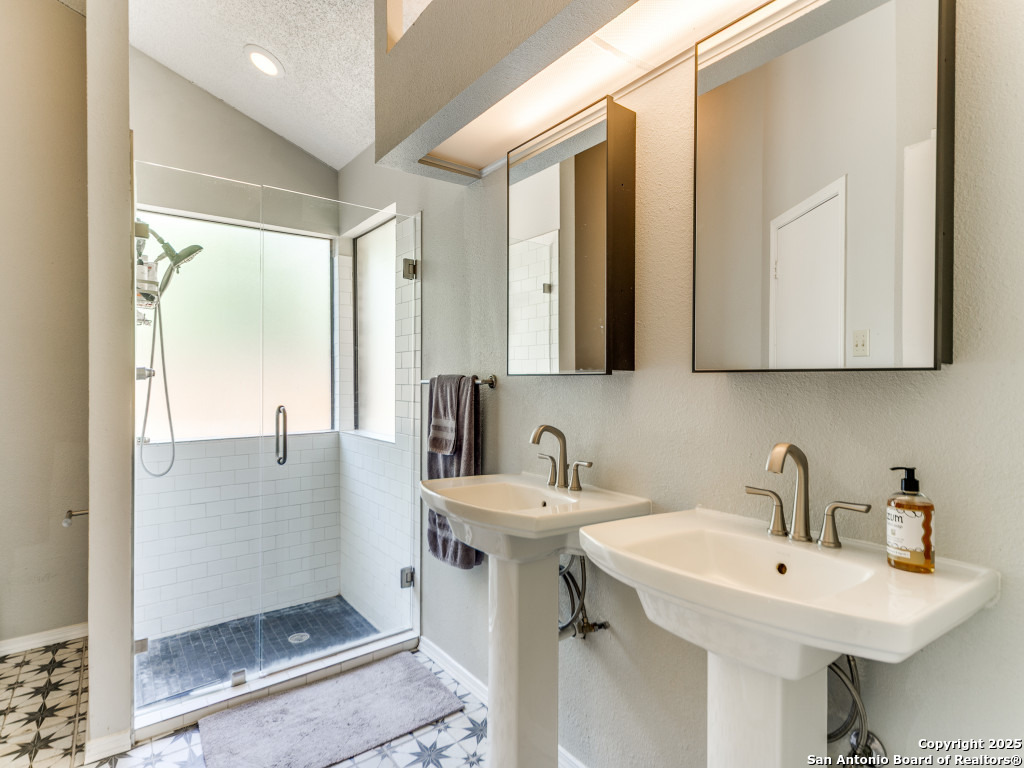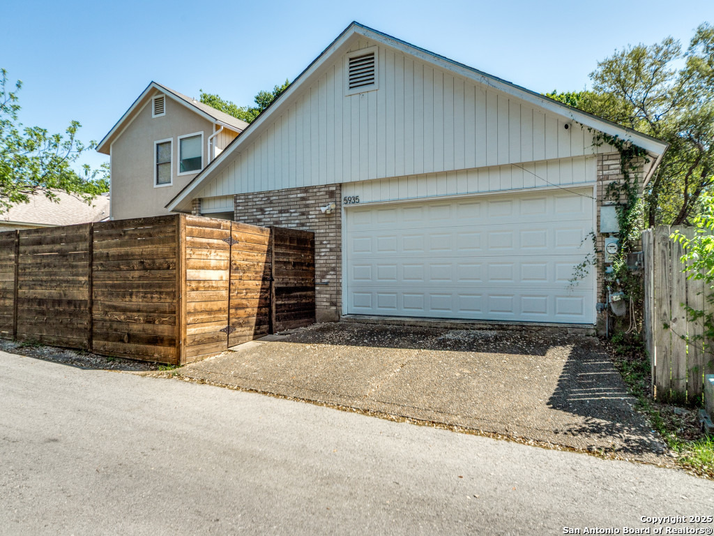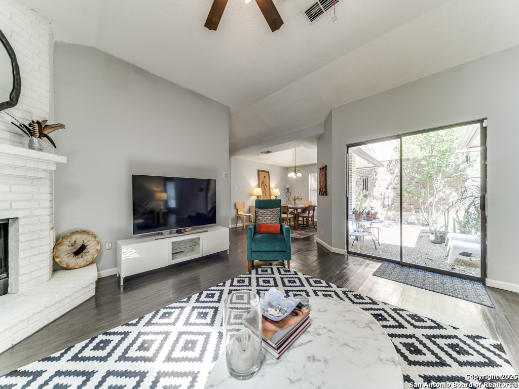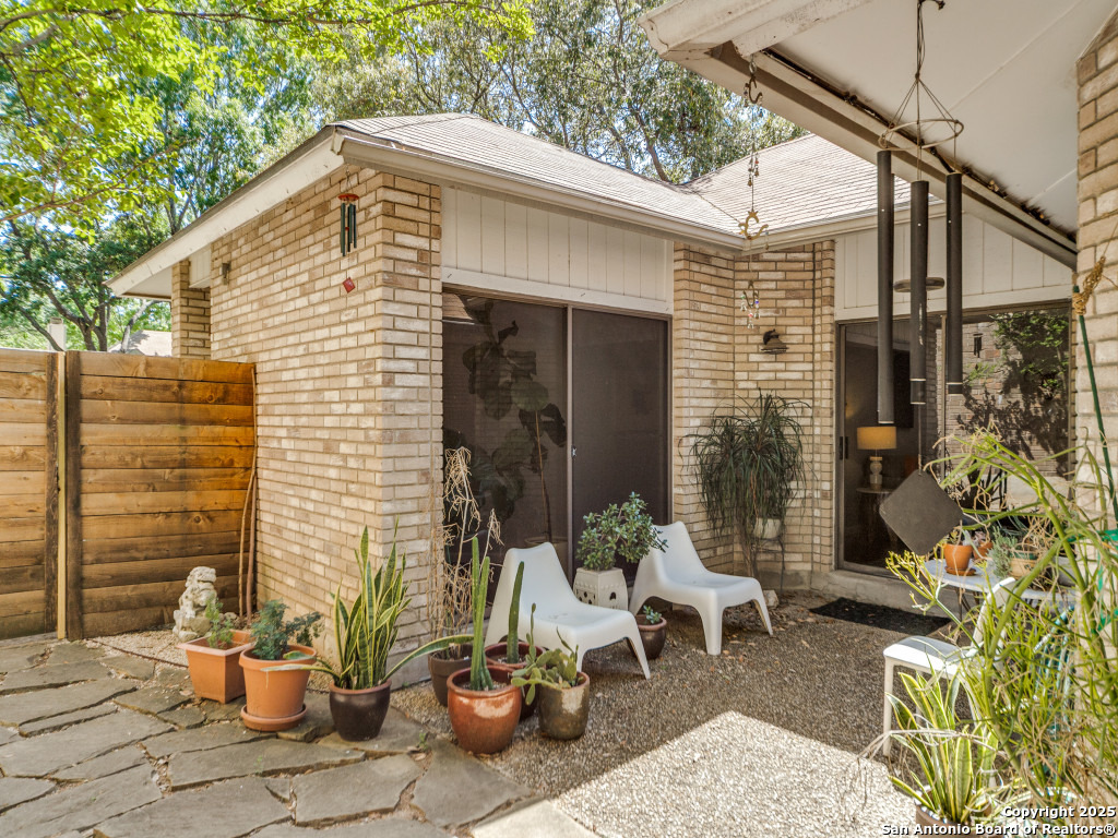 Light and bright single-story 3 bedroom/2 bath garden home with a mid-century modern feel that lives much larger than 1703sf! A classy and private center courtyard brings the outdoors in for entertaining throughout. High ceilings and a floor-to-ceiling corner painted brick fireplace in the living room flow seamlessly to the spacious kitchen with a skylight and a breakfast bar that is open to the dining room and the courtyard. Recent updates include an on-trend primary bath remodel, a recent roof, privacy fence, insulated garage door, modern black front door, dishwasher, gas stove and water heater. Three sides of the home are brick and rear garage siding was recently replaced. The secluded zen yard has an exposed-pebble concrete courtyard and a shady flagstone path side yard. A rare find in San Antonio- this home has a rear-entry garage on an alley. This peaceful home is within walking distance of the community pool and park. Come see your new haven!