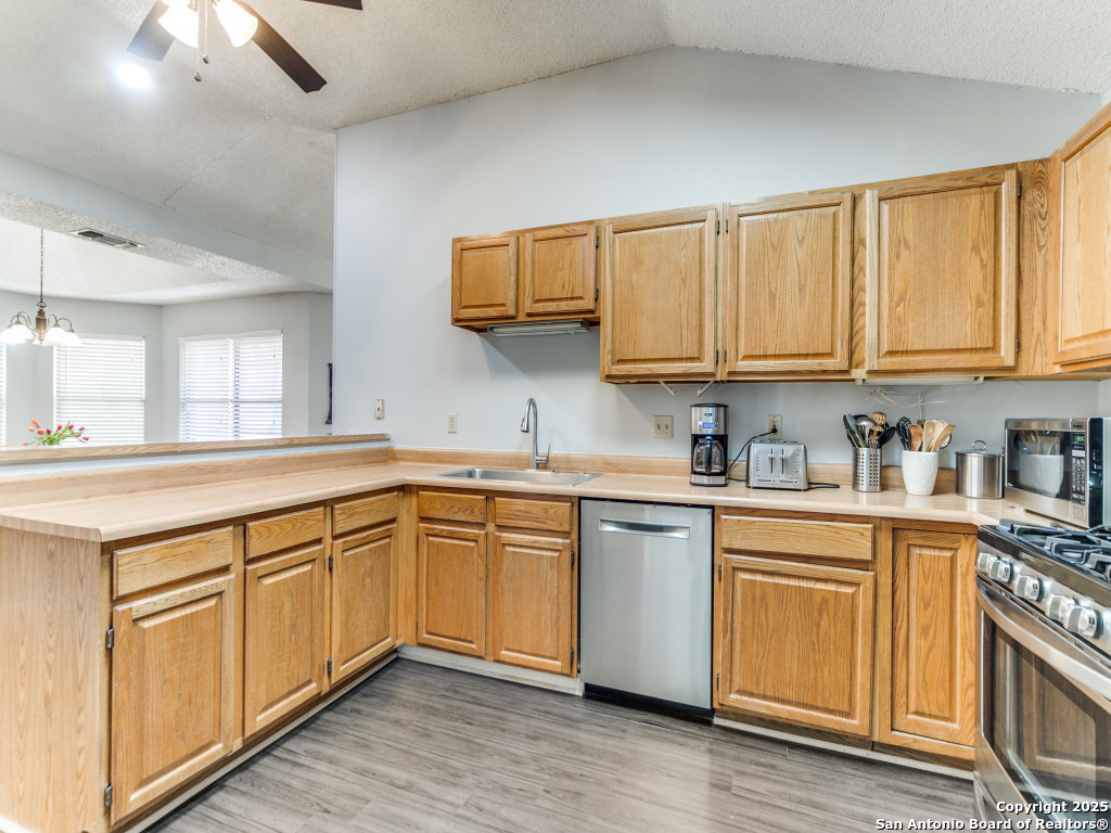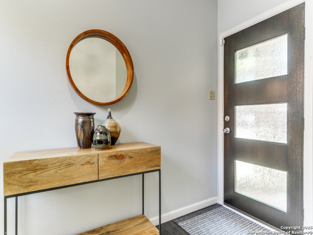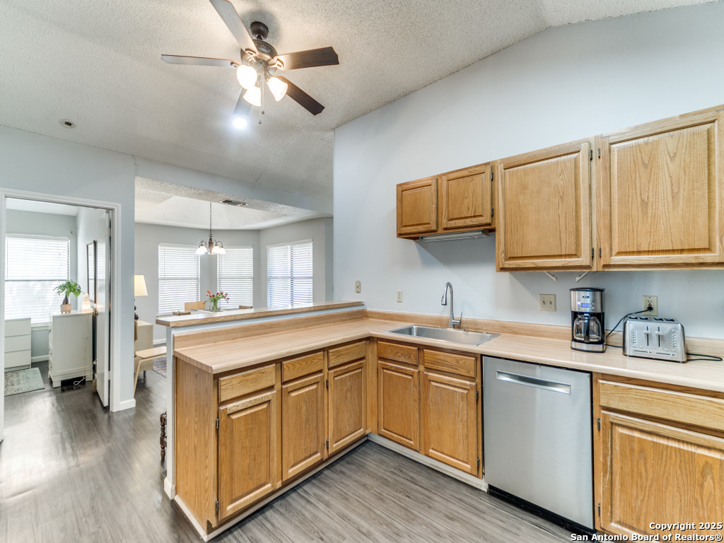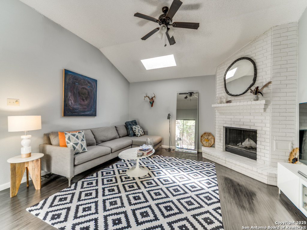 Light and bright single-story 3 bedroom/2 bath garden home with a mid-century modern feel that lives much larger than 1703sf! A classy and private center courtyard brings the outdoors in for entertaining throughout. High ceilings and a floor-to-ceiling corner painted brick fireplace in the living room flow seamlessly to the spacious kitchen with a skylight and a breakfast bar that is open to the dining room and the courtyard. Recent updates include an on-trend primary bath remodel, a recent roof, privacy fence, insulated garage door, modern black front door, dishwasher, gas stove and water heater. Three sides of the home are brick and rear garage siding was recently replaced. The secluded zen yard has an exposed-pebble concrete courtyard and a shady flagstone path side yard. A rare find in San Antonio- this home has a rear-entry garage on an alley. This peaceful home is within walking distance of the community pool and park. Come see your new haven!