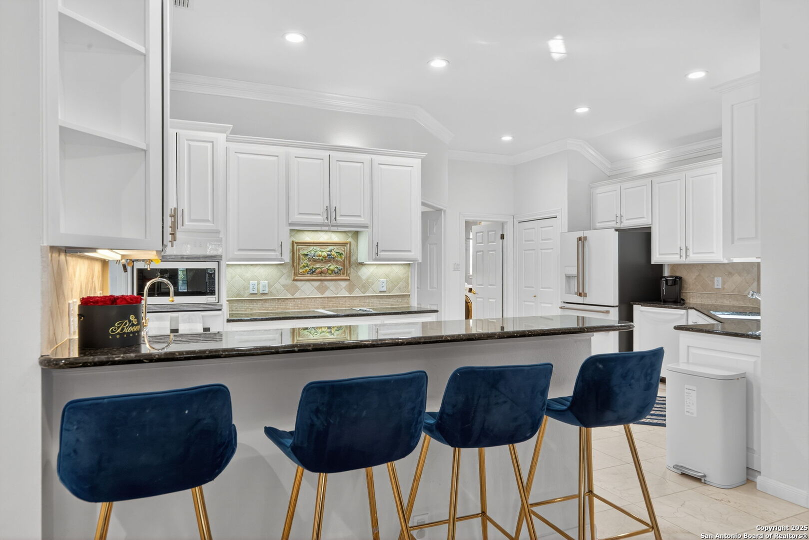Rare Find! Fully Furnished Single-Story Rental in The Dominion Discover comfort and elegance in this beautifully appointed single-story home located in the prestigious, gated community of The Dominion. This furnished residence offers a spacious layout with a huge primary suite featuring direct access to the back patio, two walk-in closets, a soaking tub, and a separate shower. Two additional bedrooms-one perfect for a home office-provide flexibility and comfort. The chef's kitchen is a dream, with premium appliances, a wine fridge, and both a formal dining room and a cozy breakfast area that opens to a private patio for outdoor dining. Enjoy the inviting living room with a fireplace, a large laundry room, and a two-car oversized garage with room for a golf cart. Situated on a quiet cul-de-sac in The Gardens section of The Dominion and comes complete with lawn service. This home offers luxury, privacy and convenience. The Dominion amenities-including golf course, swimming pool, tennis facilities, and clubhouse-are available through separate membership