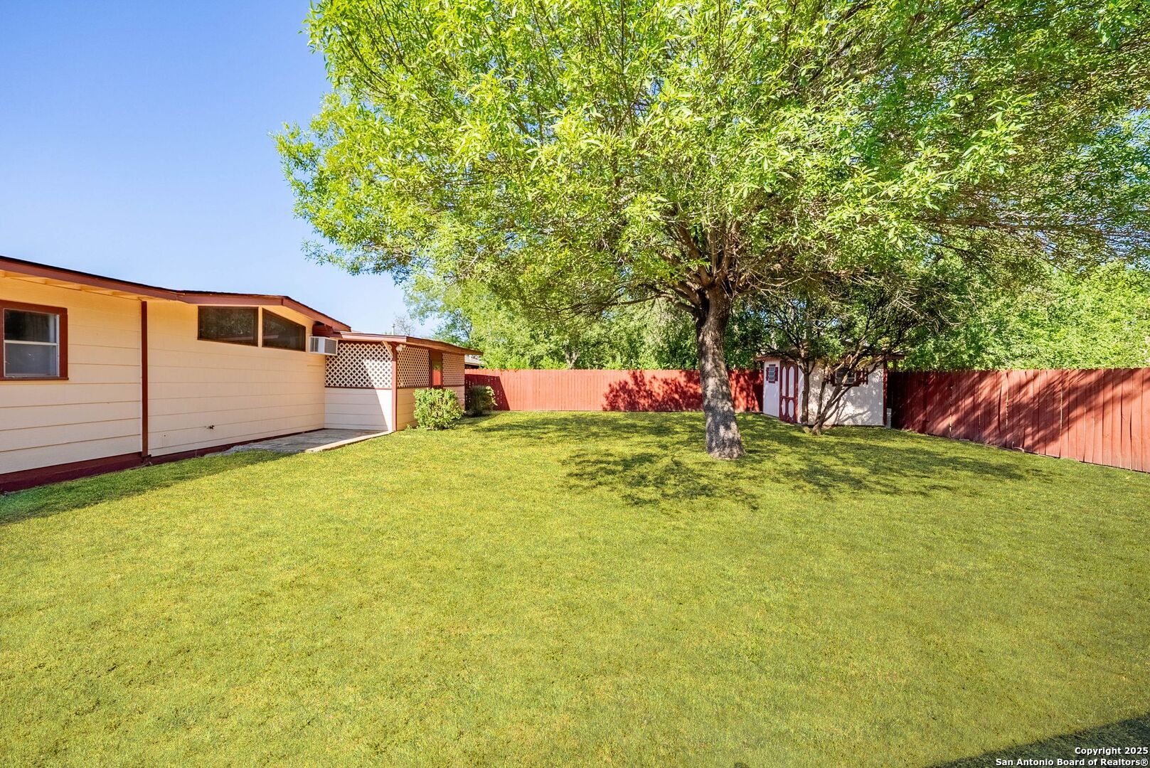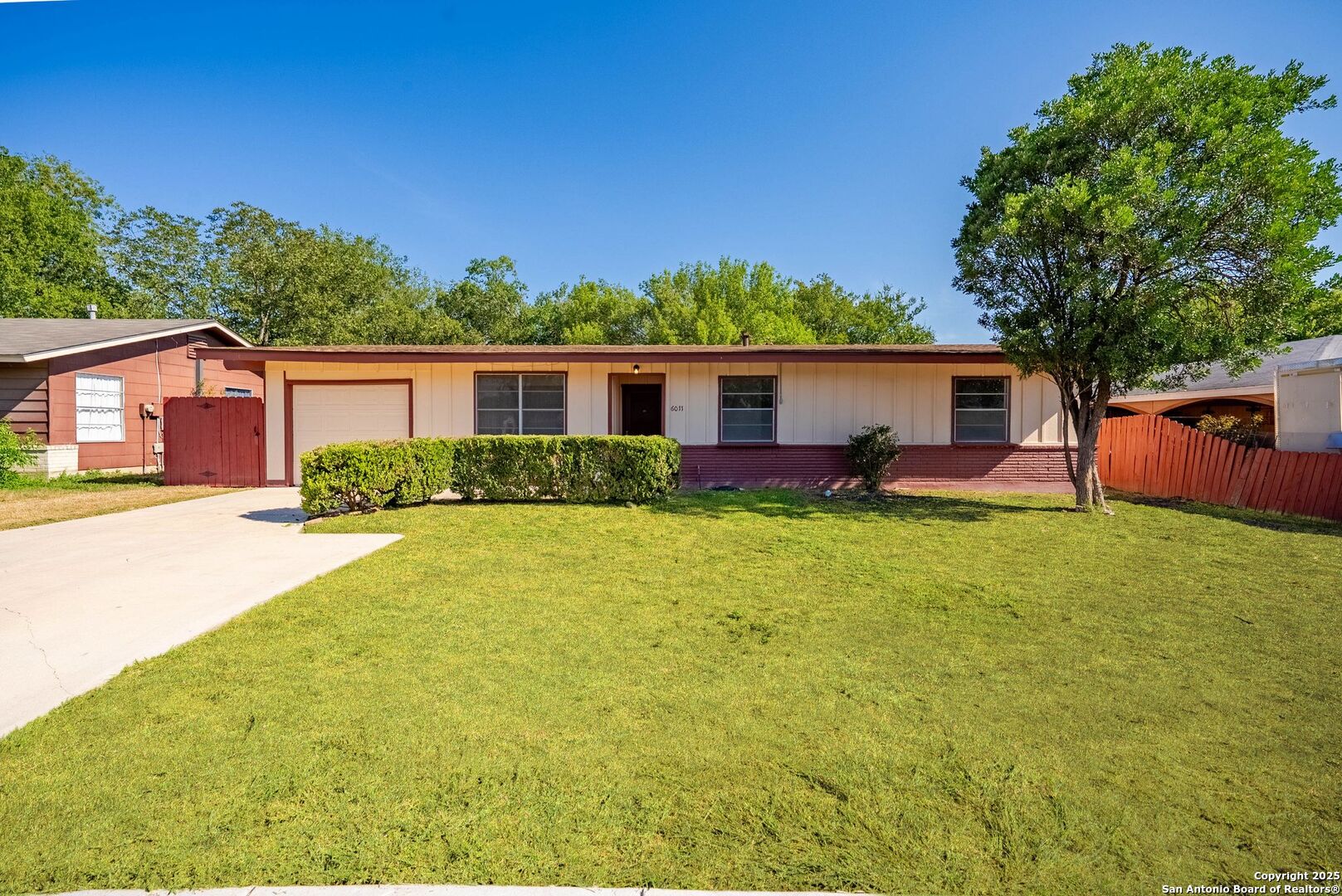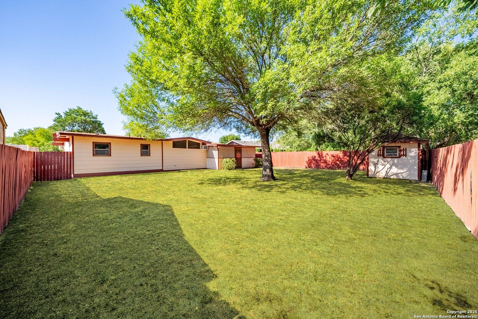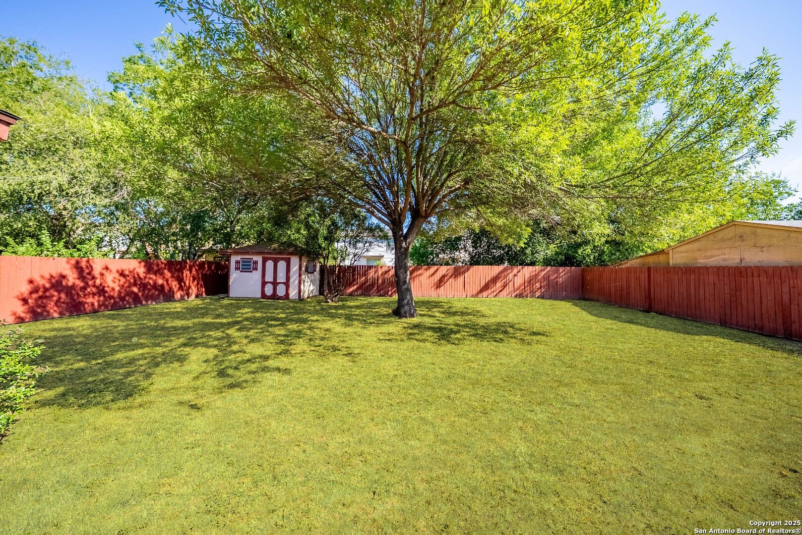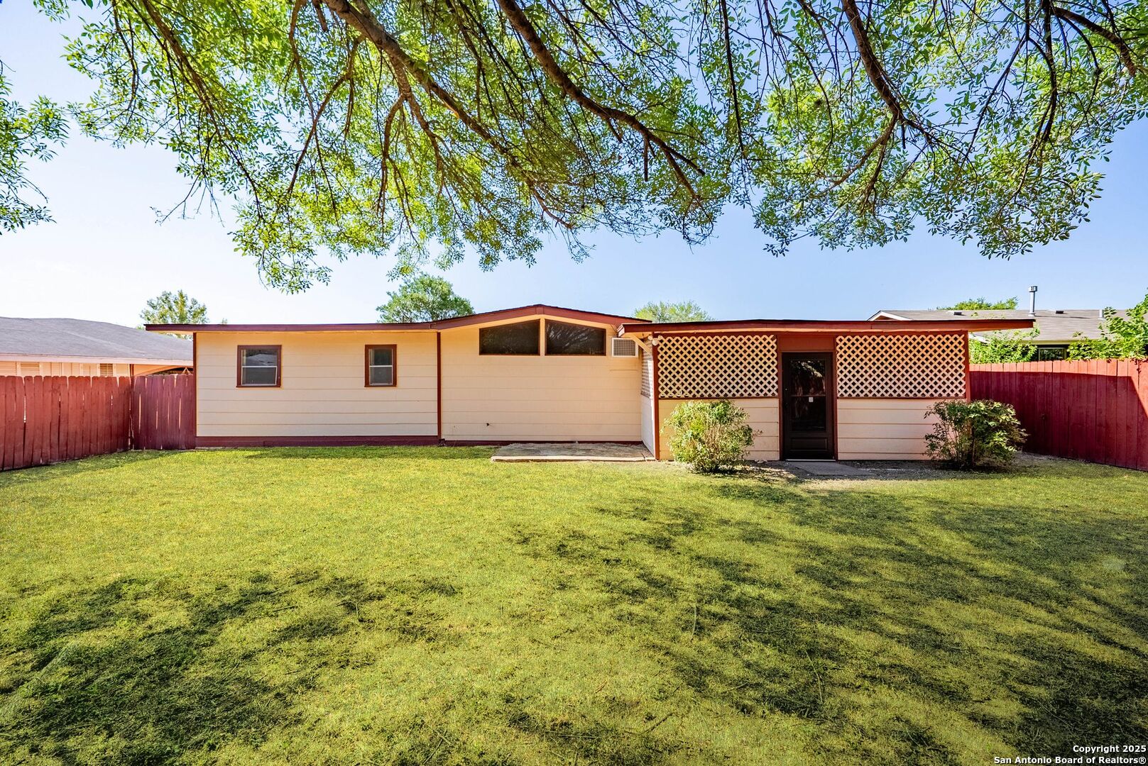 Beneath the shade of majestic oaks, this single-story sanctuary has been reborn with modern elegance. Spanning 1,404 square feet on a generous .21-acre lot, every corner of this 3-bedroom, 2-bath retreat has been thoughtfully reimagined. Step inside to find soaring vaulted ceilings, walls of natural light, and the seamless flow of new luxury vinyl wood-look flooring. The kitchen dazzles with quartz countertops, freshly painted cabinetry, a deep stainless steel sink, and a brand-new stainless gas range ready for your culinary adventures. Each bathroom features walk-in showers clad in decorative modern tile, sleek vanities, and refined plumbing fixtures. Fresh paint, plush new carpet, chic light fixtures, and new ceiling fans complete the interior's transformation. Outdoors you will find an expansive yard that unfolds beneath the canopy of mature oaks, perfect for gatherings, play, or quiet reflection. A storage shed offers convenience, while the sheer size of the lot invites endless possibility. Nearby Lackland Air Force Base and easy access to Loop 410 for a quick commute to work.