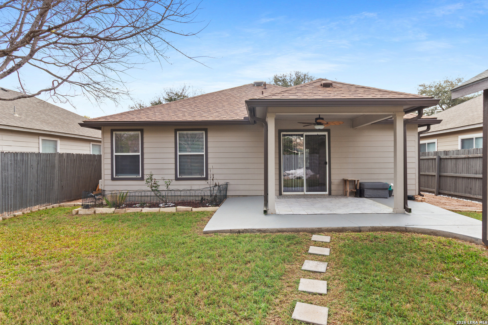 Move-in ready comfort-no projects, no stress. This meticulously maintained home offers true peace of mind from day one, so you can focus on living, not fixing. Curb appeal shines with classic dark red brick on three sides and beautifully maintained landscaping, complete with generous flower beds ready for your personal touch. Inside, enjoy durable hard-surface flooring throughout all main living areas. The flexible 3-bedroom layout allows for a dedicated home office if desired. Both full bathrooms feature updated finishes and walk-in showers, while consistent granite countertops create a cohesive, upscale feel throughout the home. The spacious living area boasts high ceilings and large windows that fill the space with natural light. The kitchen is equipped with stainless steel appliances and abundant storage-perfect for everyday living and entertaining. The fully finished 2-car garage includes a recently applied epoxy-coated floor, giving it a clean, polished look. Step outside to a covered patio with a ceiling fan-ideal for relaxing evenings-plus an additional storage shed for convenience. Major updates include a roof less than one year old with brand new gutters. HOA amenities include a pool, basketball and tennis courts, and a full playground just minutes away. As an added perk, the washer, dryer, and refrigerator convey with the sale, making this an ideal opportunity for first-time buyers or anyone seeking a truly turnkey home. Don't miss your chance to own this well-cared-for property.