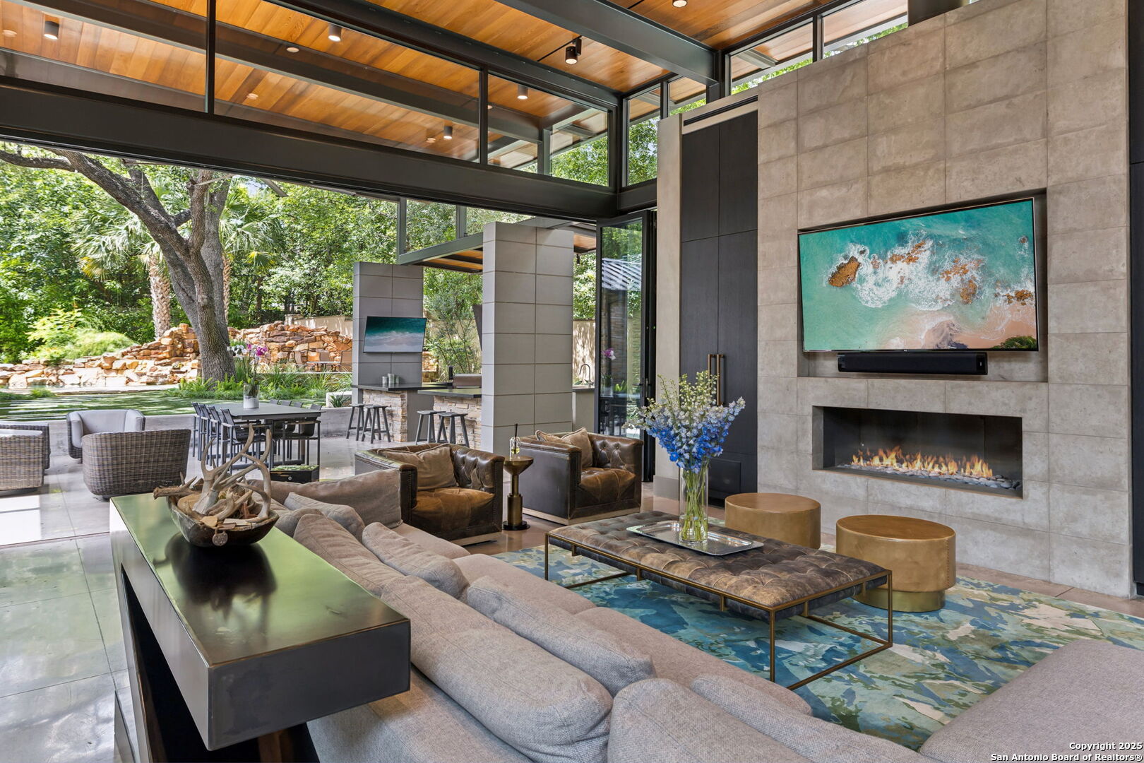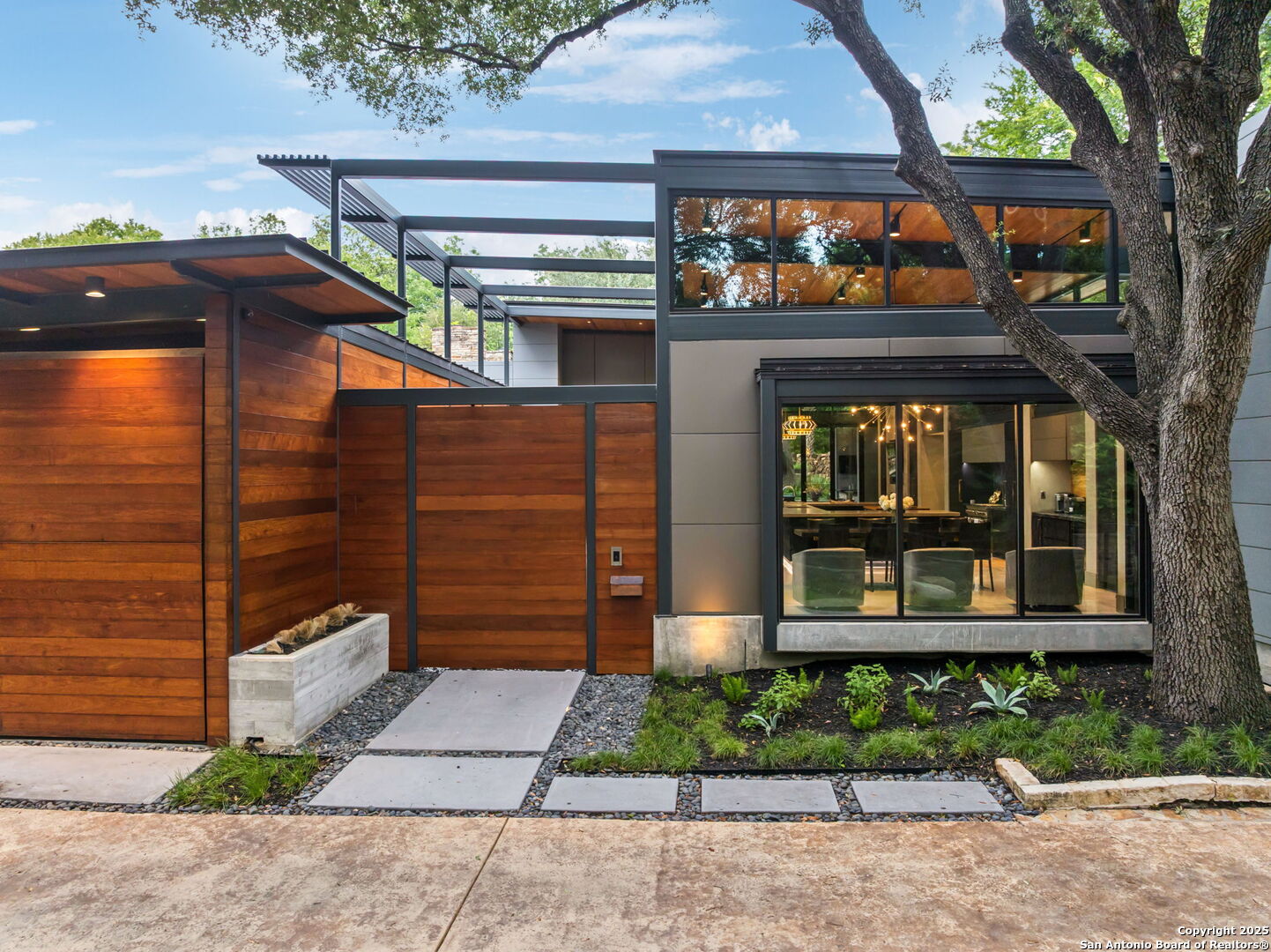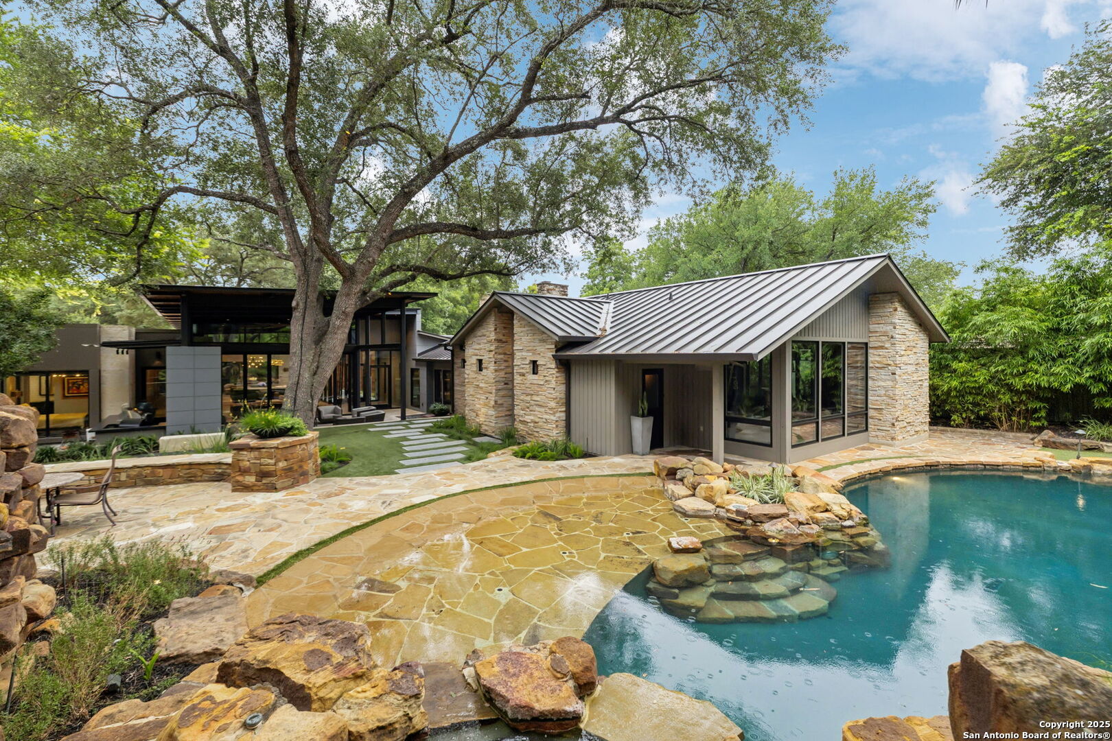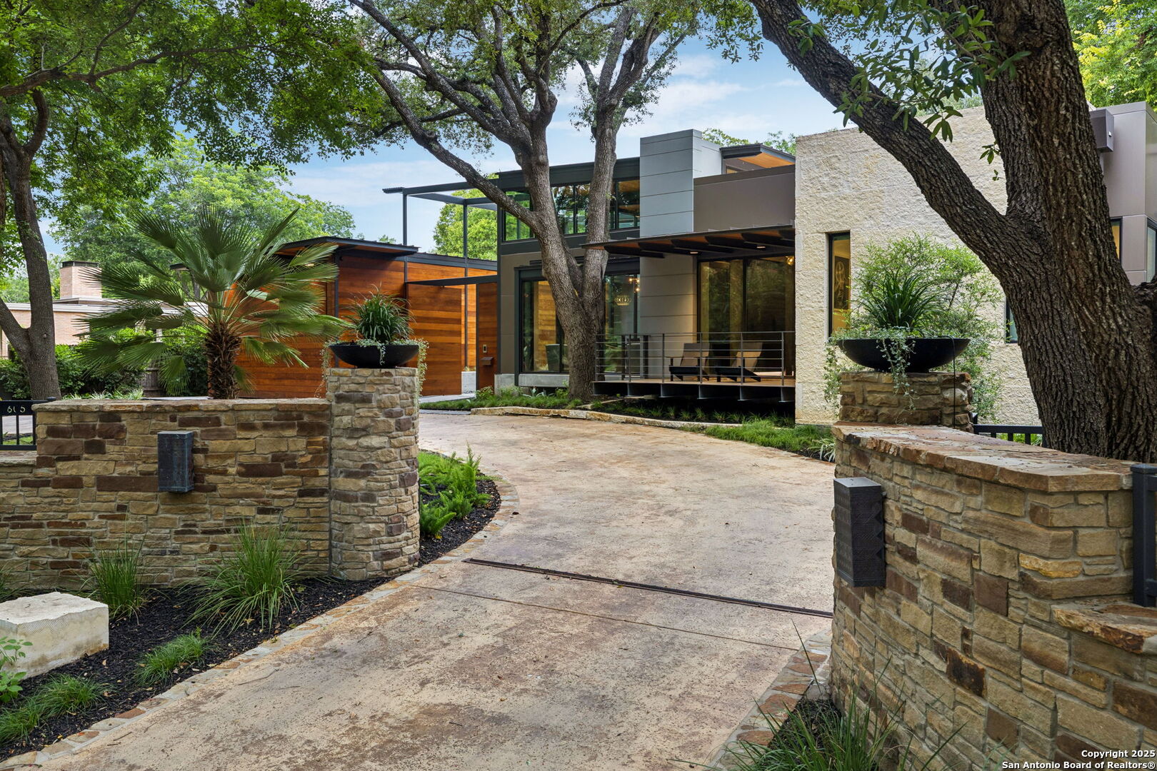 There's simply nothing like this transcendent warm modern home rooted in the Texas landscape, with a commitment to clean lines, natural materials, and seamless indoor-outdoor transitions. Its use of glass as both wall and threshold, and integration of heavy, elemental materials like stone, concrete, and wood set this apart from the usual modern design in San Antonio. The extended ceiling planes, steel framing, and sculptural use of light reflect the same refined restraint. The pivot between privacy and openness, and the way light is curated, feels particularly aligned. The backyard brings fun and privacy, oriented around a massive, heritage oak with curated landscaping and lush, green spaces, and a natural lagoon pool that curves through stone and dense greenery, is simply a work of art on its own. If you need more than a 2-car garage, the high ceilings offer the chance to add lifts for a total of 4, plus there is a huge circle drive. Olmos Park is a crown jewel of sophisticated in town San Antonio living. It's the first choice of many high end buyers in the Alamo City.