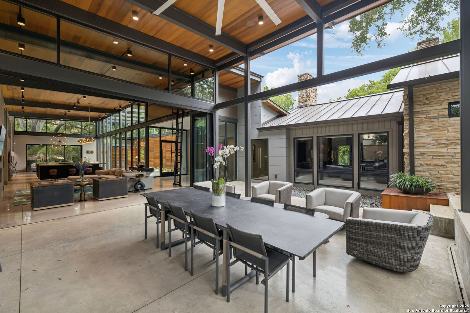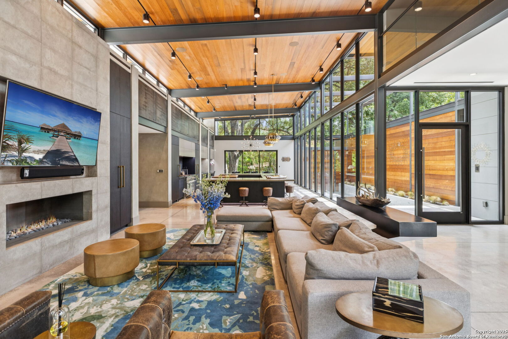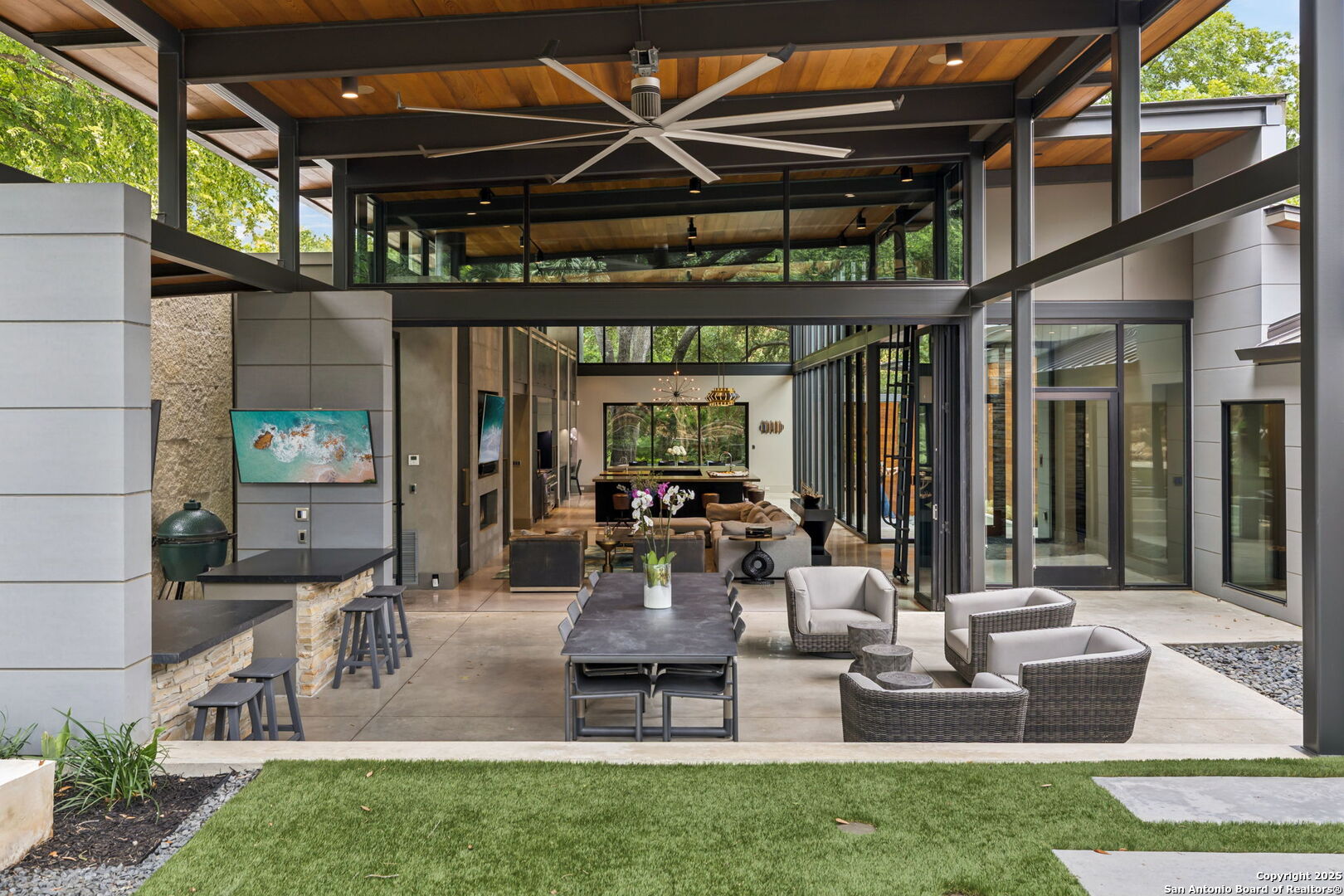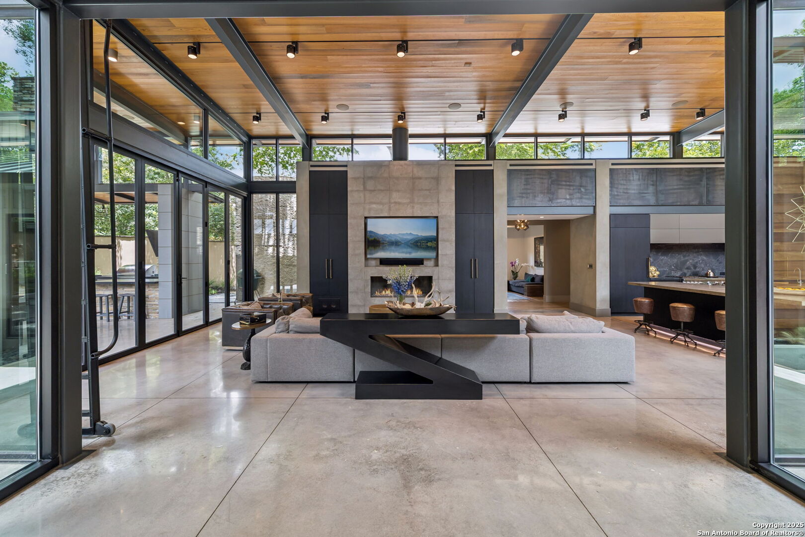 There's simply nothing like this transcendent warm modern home rooted in the Texas landscape, with a commitment to clean lines, natural materials, and seamless indoor-outdoor transitions. Its use of glass as both wall and threshold, and integration of heavy, elemental materials like stone, concrete, and wood set this apart from the usual modern design in San Antonio. The extended ceiling planes, steel framing, and sculptural use of light reflect the same refined restraint. The pivot between privacy and openness, and the way light is curated, feels particularly aligned. The backyard brings fun and privacy, oriented around a massive, heritage oak with curated landscaping and lush, green spaces, and a natural lagoon pool that curves through stone and dense greenery, is simply a work of art on its own. If you need more than a 2-car garage, the high ceilings offer the chance to add lifts for a total of 4, plus there is a huge circle drive. Olmos Park is a crown jewel of sophisticated in town San Antonio living. It's the first choice of many high end buyers in the Alamo City.