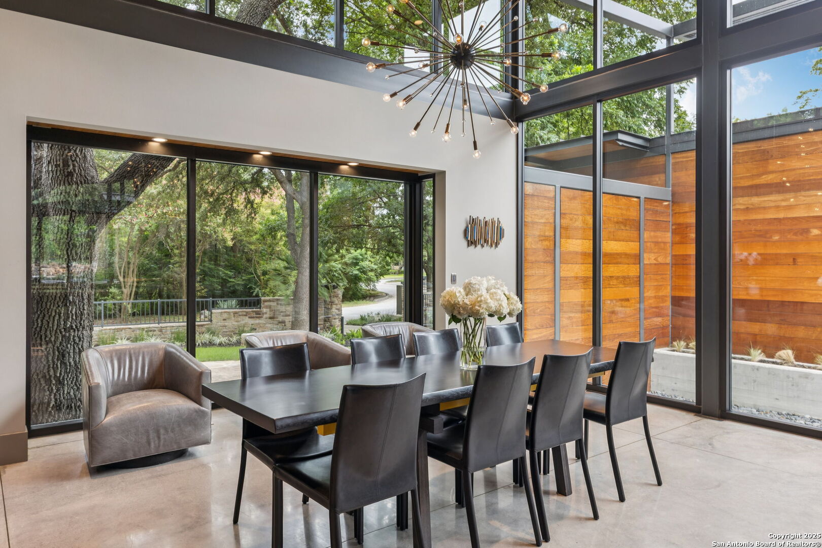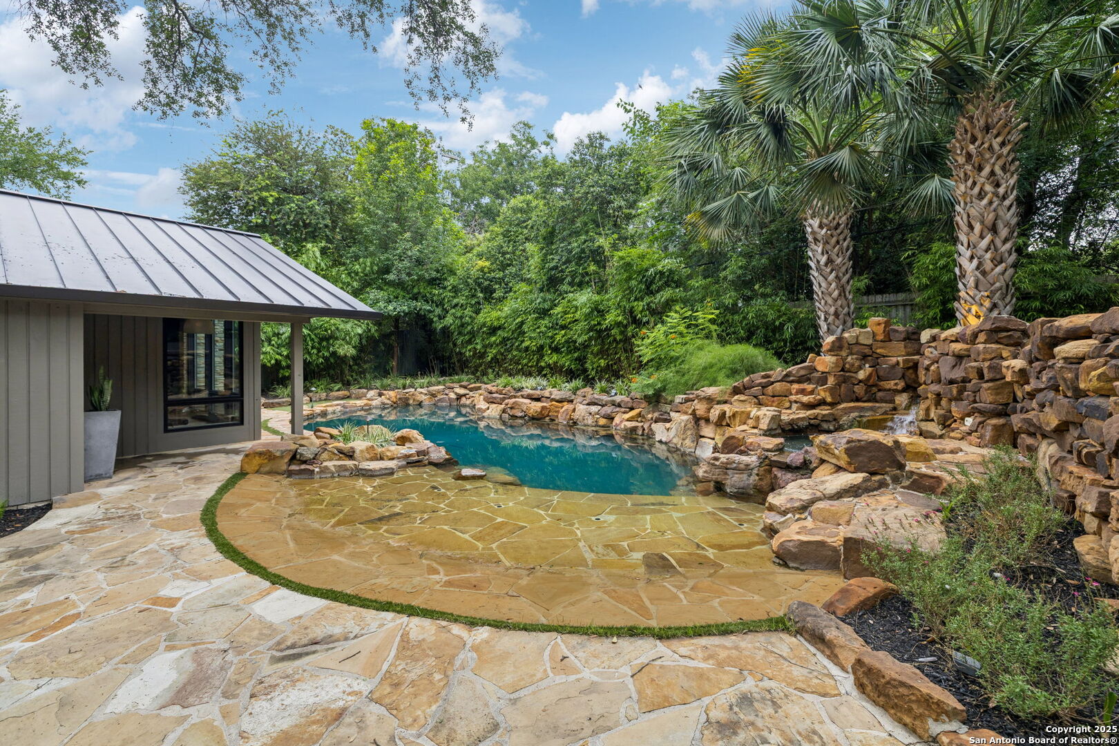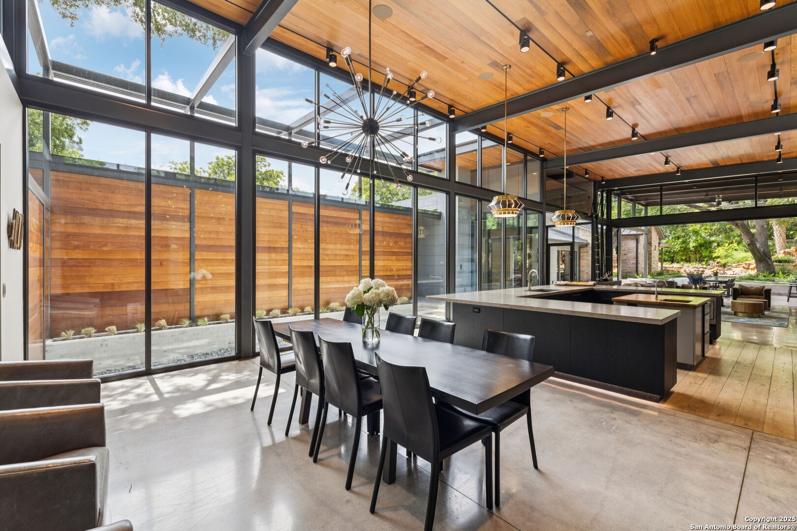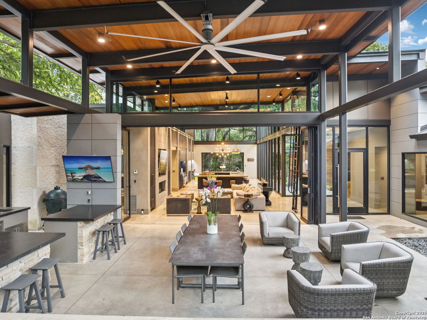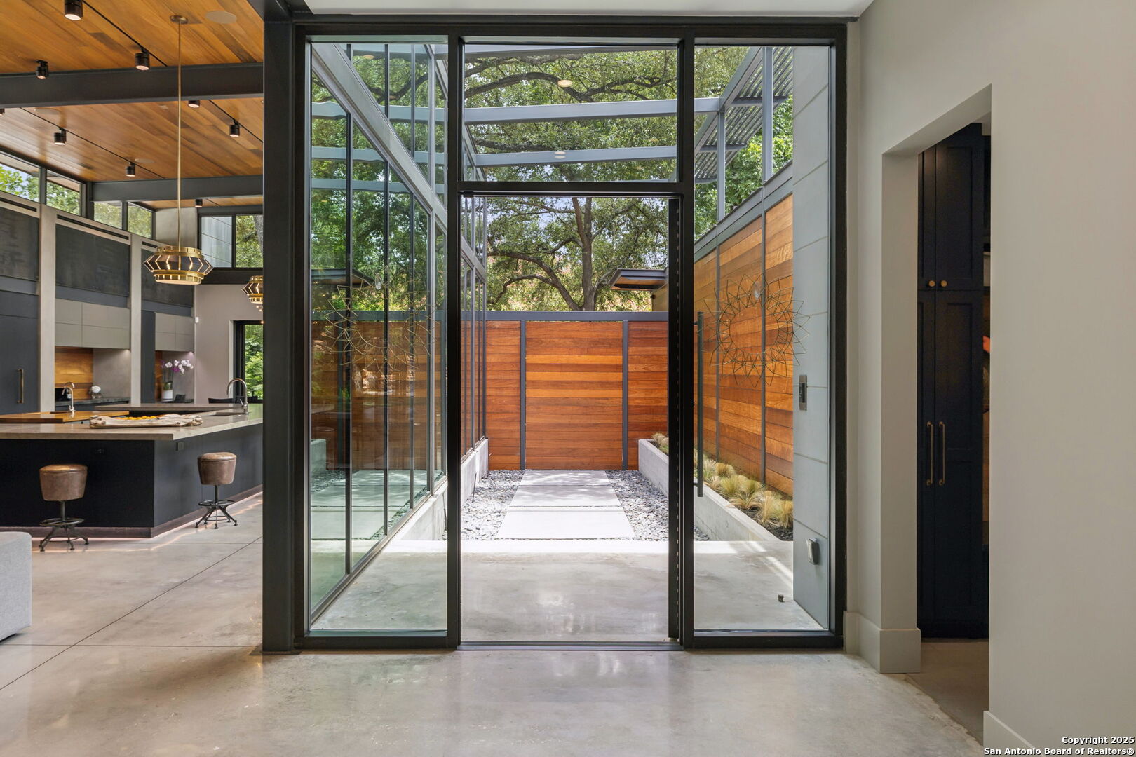There's simply nothing like this transcendent warm modern home rooted in the Texas landscape, with a commitment to clean lines, natural materials, and seamless indoor-outdoor transitions. Its use of glass as both wall and threshold, and integration of heavy, elemental materials like stone, concrete, and wood set this apart from the usual modern design in San Antonio. The extended ceiling planes, steel framing, and sculptural use of light reflect the same refined restraint. The pivot between privacy and openness, and the way light is curated, feels particularly aligned. The backyard brings fun and privacy, oriented around a massive, heritage oak with curated landscaping and lush, green spaces, and a natural lagoon pool that curves through stone and dense greenery, is simply a work of art on its own. If you need more than a 2-car garage, the high ceilings offer the chance to add lifts for a total of 4, plus there is a huge circle drive. Olmos Park is a crown jewel of sophisticated in town San Antonio living. It's the first choice of many high end buyers in the Alamo City.