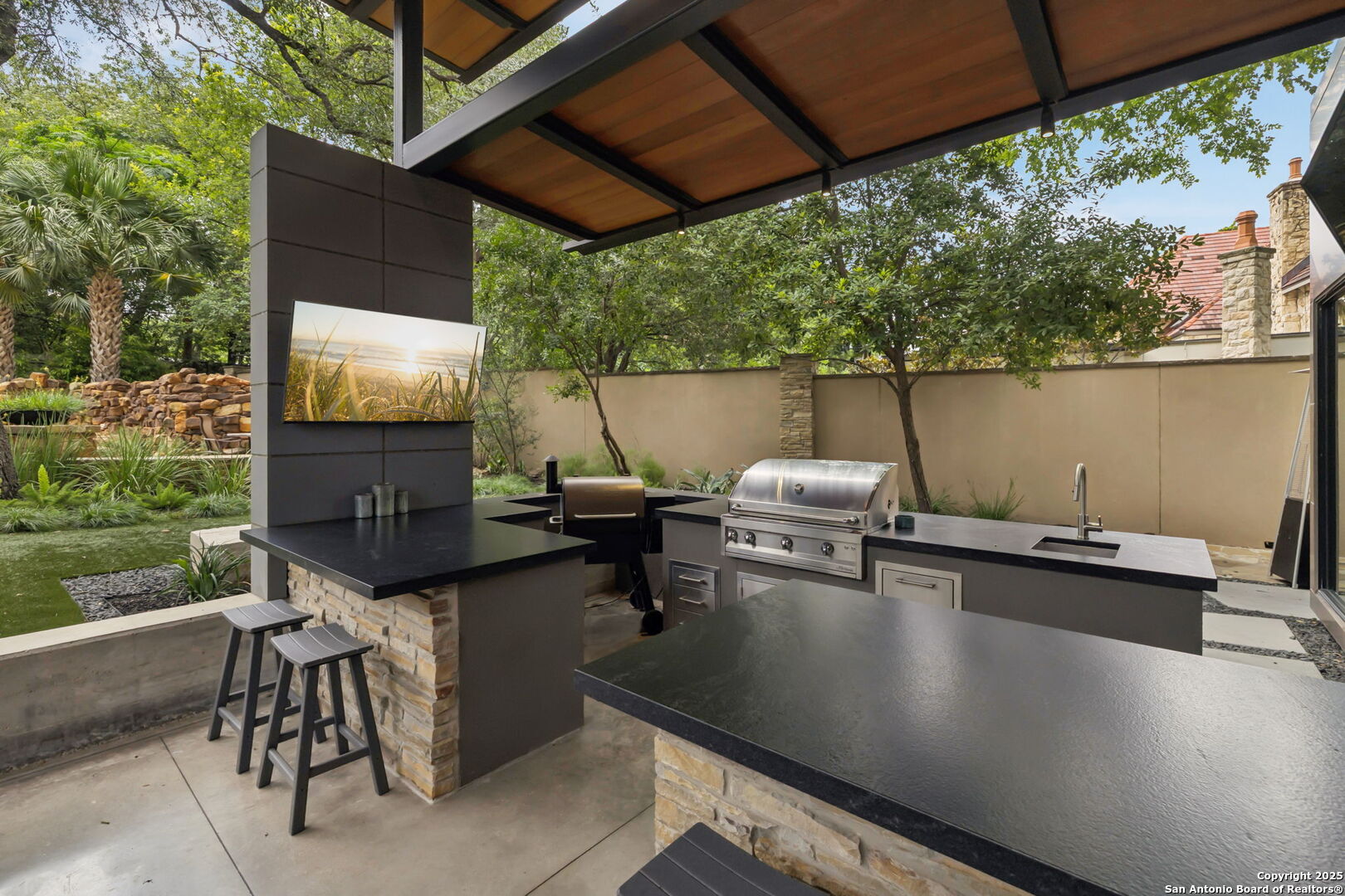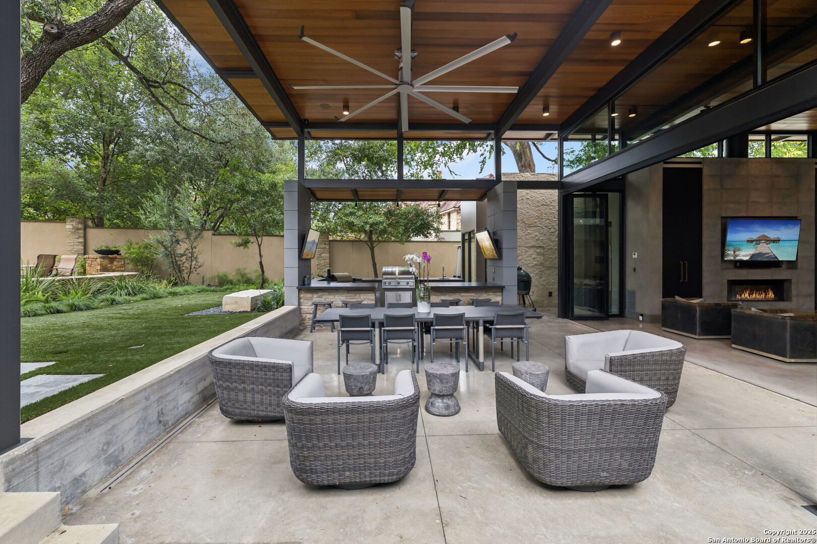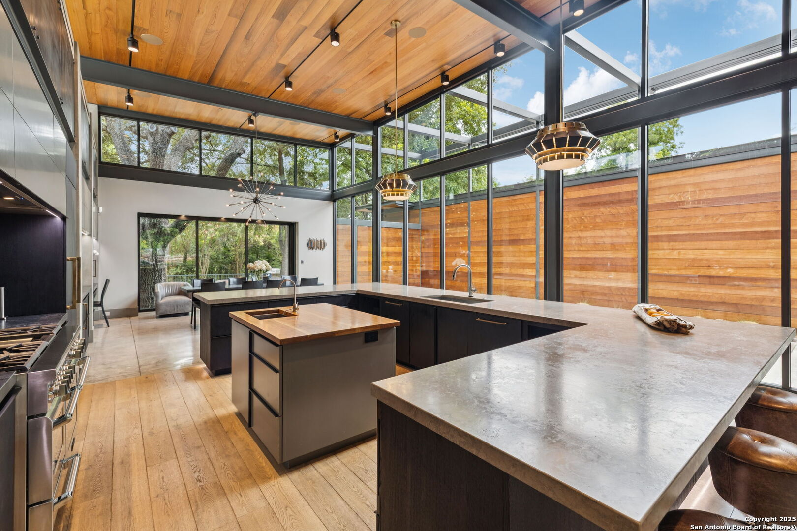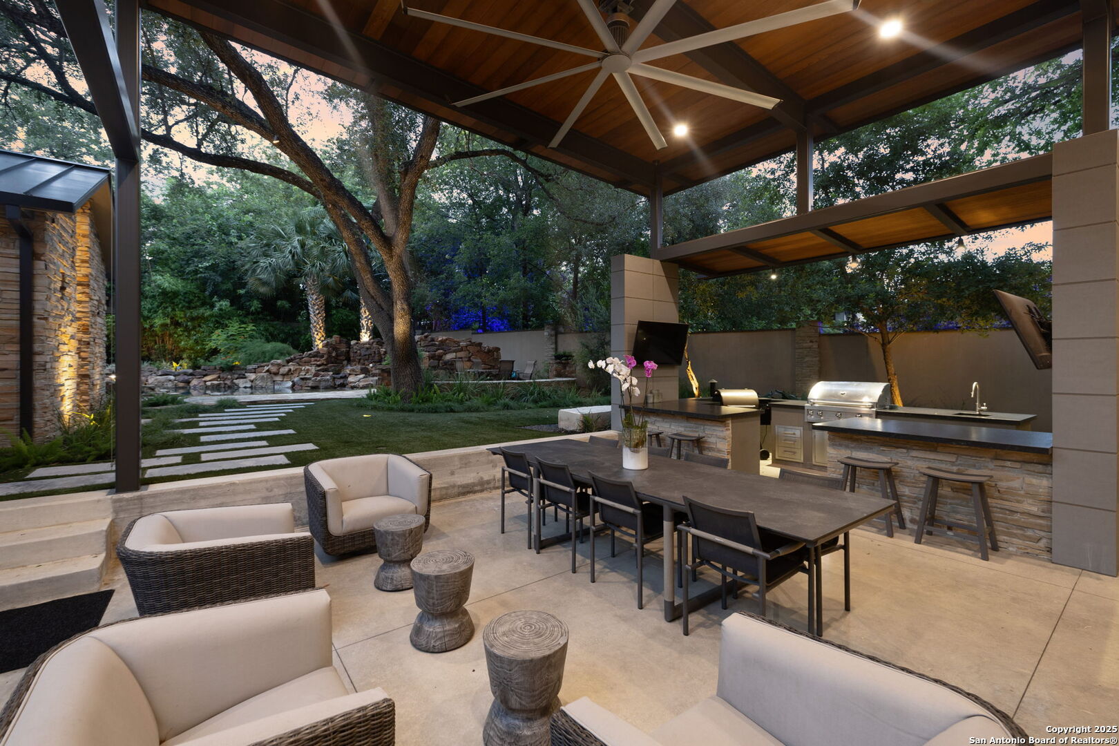 There's simply nothing like this transcendent warm modern home rooted in the Texas landscape, with a commitment to clean lines, natural materials, and seamless indoor-outdoor transitions. Its use of glass as both wall and threshold, and integration of heavy, elemental materials like stone, concrete, and wood set this apart from the usual modern design in San Antonio. The extended ceiling planes, steel framing, and sculptural use of light reflect the same refined restraint. The pivot between privacy and openness, and the way light is curated, feels particularly aligned. The backyard brings fun and privacy, oriented around a massive, heritage oak with curated landscaping and lush, green spaces, and a natural lagoon pool that curves through stone and dense greenery, is simply a work of art on its own. If you need more than a 2-car garage, the high ceilings offer the chance to add lifts for a total of 4, plus there is a huge circle drive. Olmos Park is a crown jewel of sophisticated in town San Antonio living. It's the first choice of many high end buyers in the Alamo City.