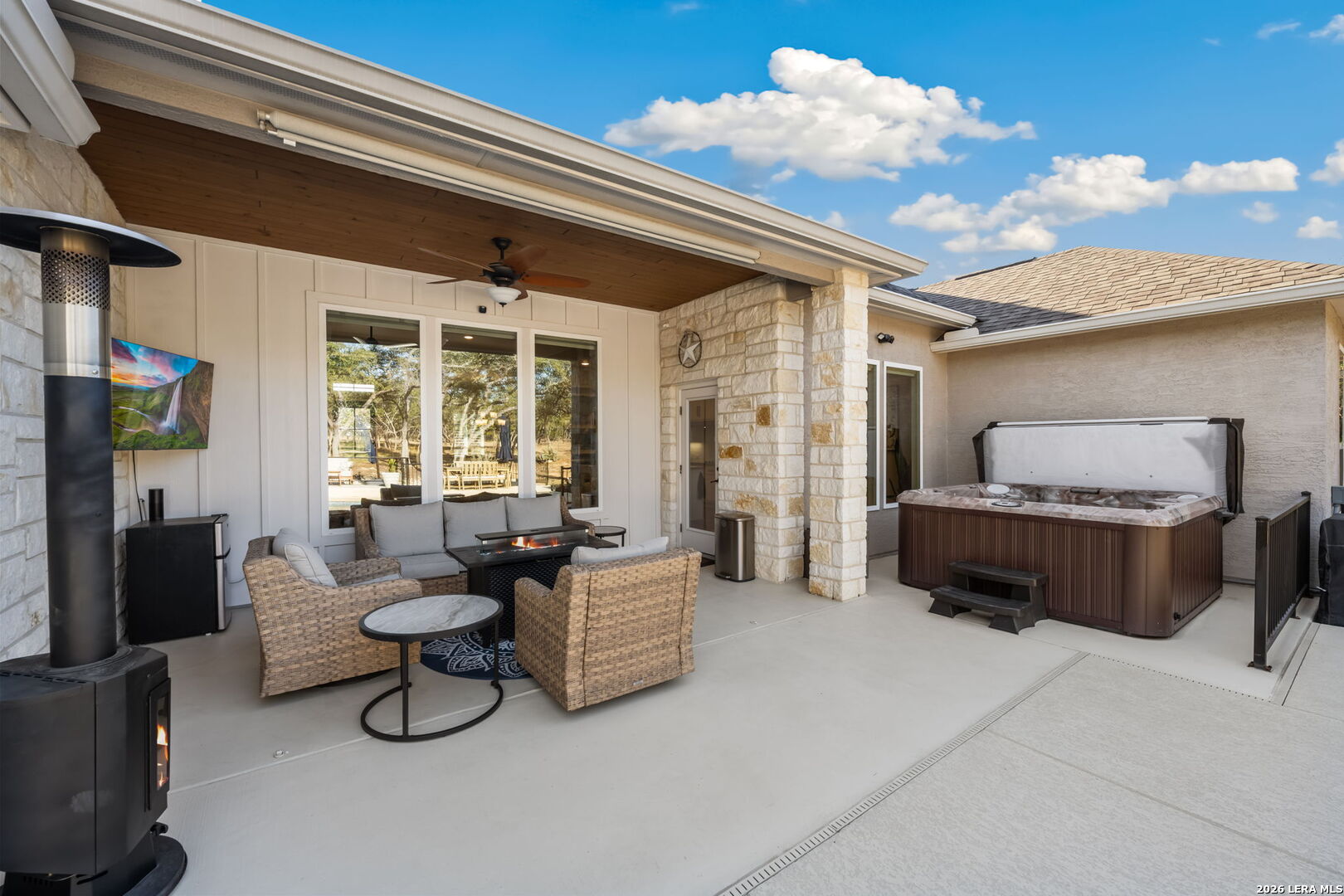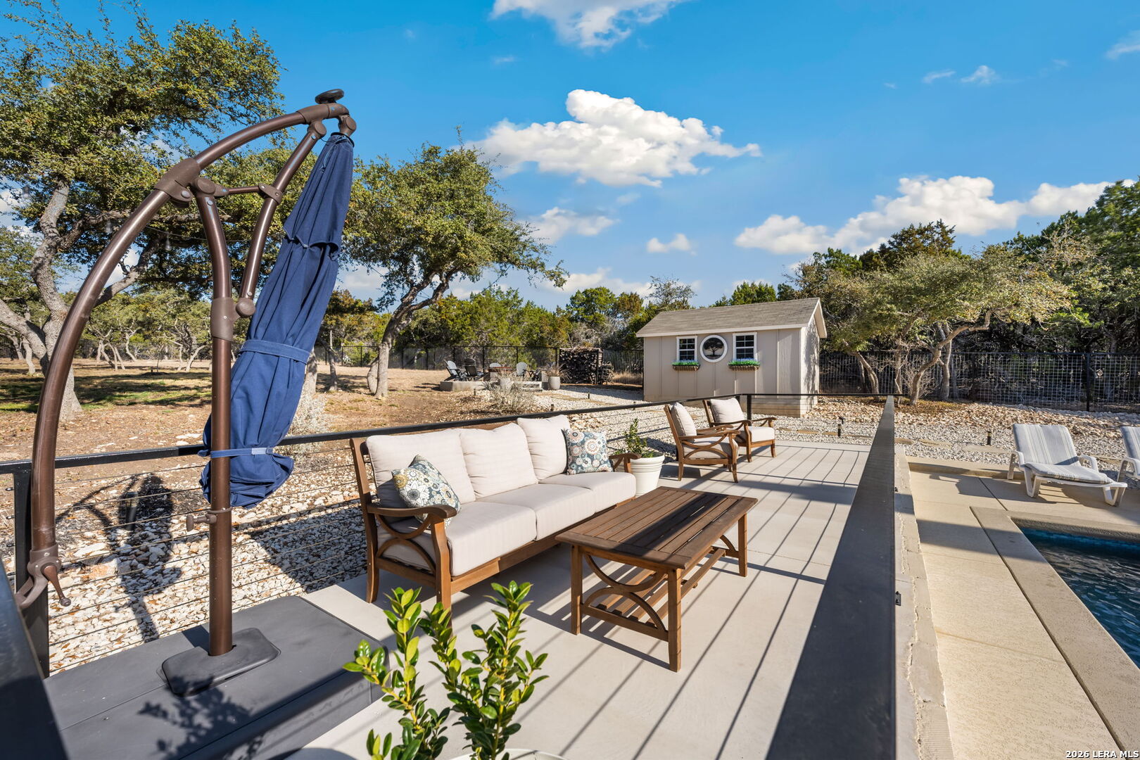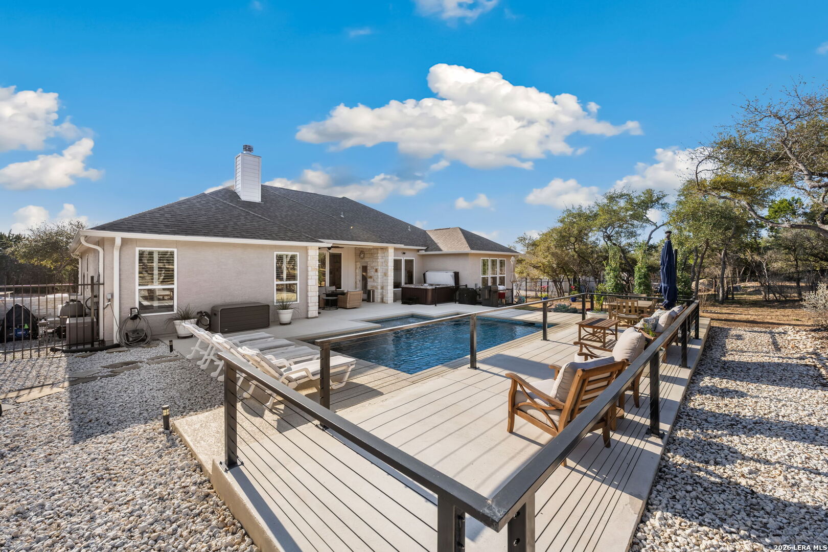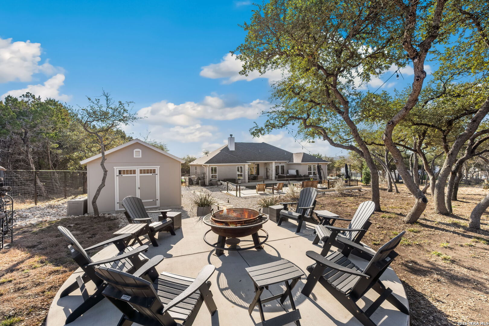 You found it... the perfect blend of comfort, craftsmanship, and Hill Country living! Welcome to 611 Cielo Vista, a thoughtfully upgraded retreat that blends comfort, craftsmanship, and exceptional outdoor living just off the southern shore of Canyon Lake. This 4-bedroom, 3-full bathroom home was completed in 2022 and has been enhanced with extensive improvements that elevate both everyday living and entertaining. The open floor plan boasts wood plank tile and real wood floors, complemented by custom plantation shutters and Wi-Fi/remote controlled Hunter Douglas blinds that offer style and effortless light control. The garage features a sleek poly-coated floor, adding durability and a clean finished look, perfect for your workout facility or man cave. The backyard is a true resortstyle oasis. A stunning pool with elegant rodiron accents, a cool deck surface, and an inviting hot tub, making it ideal for relaxation or hosting guests. Both the pool and hot tub were added 2 years ago! Expanded cement patio spaces, beautiful rock work and the irrigation system add to the incredible landscape. Clear of all cedar trees, the land has an abundance of live oak and fruit trees and is private looking out the front or back. A full metal perimeter fence, gutters, hard wired alarm system, and a whole-home water softener add functionality and peace of mind. The additional outbuilding, designed with stucco and board and batten to match the house, provides flexible space for storage, hobbies, or a workshop. Located in Ensenada Shores, you'll enjoy resort-style living with top-notch amenities, including a lakefront park and pavilion, walking and biking trails, playground, and neighborhood swimming pool. 611 Cielo Vista isn't just a home... it's a lifestyle!