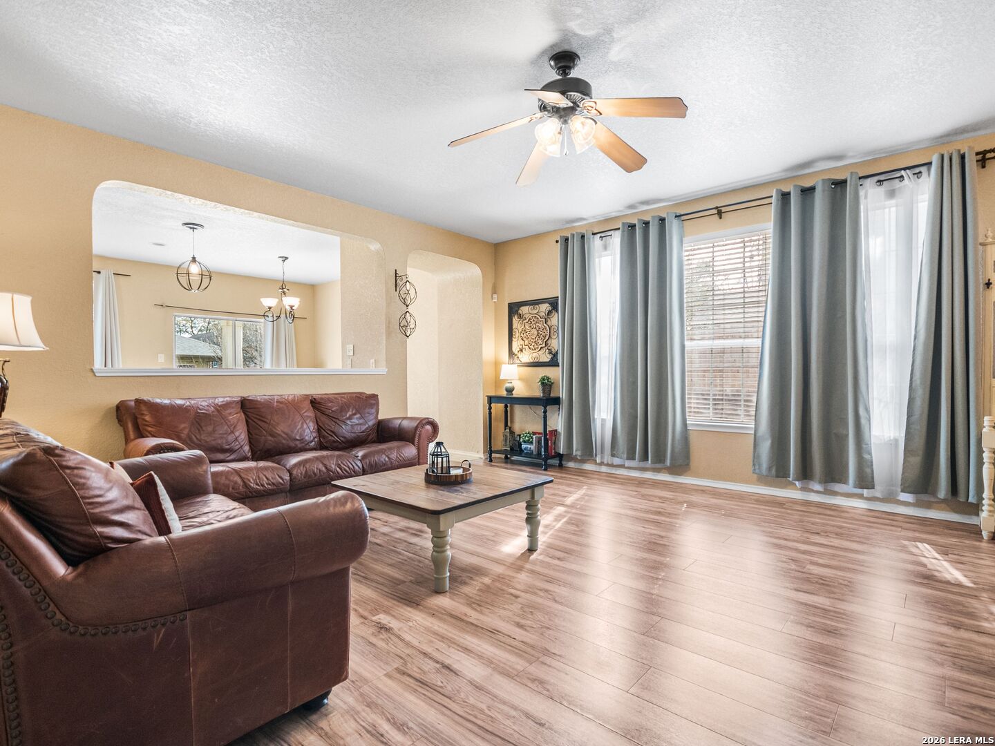 Wonderful four bedroom single-story home priced to sell in the highly sought-after NEISD! Conveniently located near everything you could need, including shopping, dining, and major highways, and zoned to James Madison High School. Clean, well maintained and gently lived in, this popular floor plan offers an open, light, and bright layout perfect for everyday living and entertaining. The spacious kitchen features a center island, abundant cabinetry, and a seamless flow into the living and dining areas. Flooring includes a tasteful blend of carpeting, laminate, and ceramic tile. The private primary suite boasts dual entry to the huge closet, and a relaxing garden tub with separate shower. Three additional bedrooms provide flexibility for family, guests, or a home office. Step outside to enjoy the covered patio and fully fenced backyard with recent privacy fence replacement-ideal for relaxing or entertaining. The multiple century oak trees provide abundant shade and curb appeal. Additional features include a full sprinkler system, water softener, and gutters. Close to top amenities and move-in ready-this one truly shows pride of ownership. Make your appointment today!