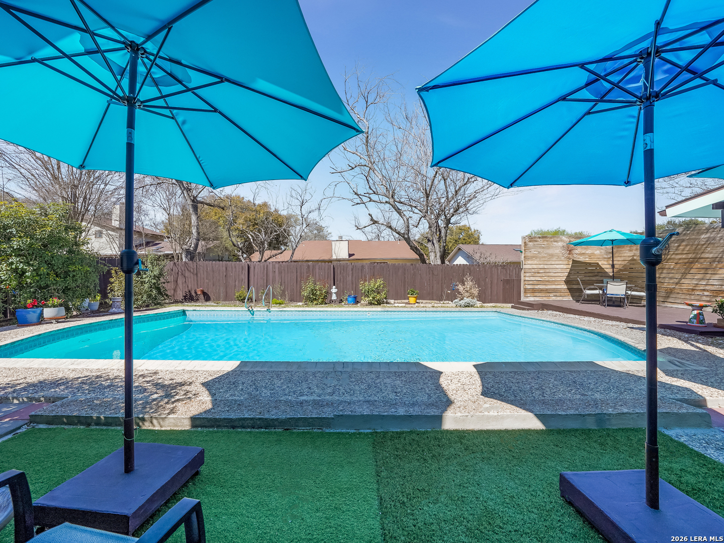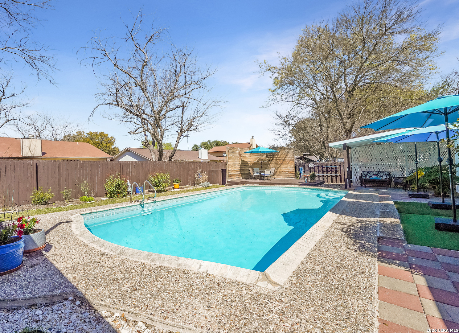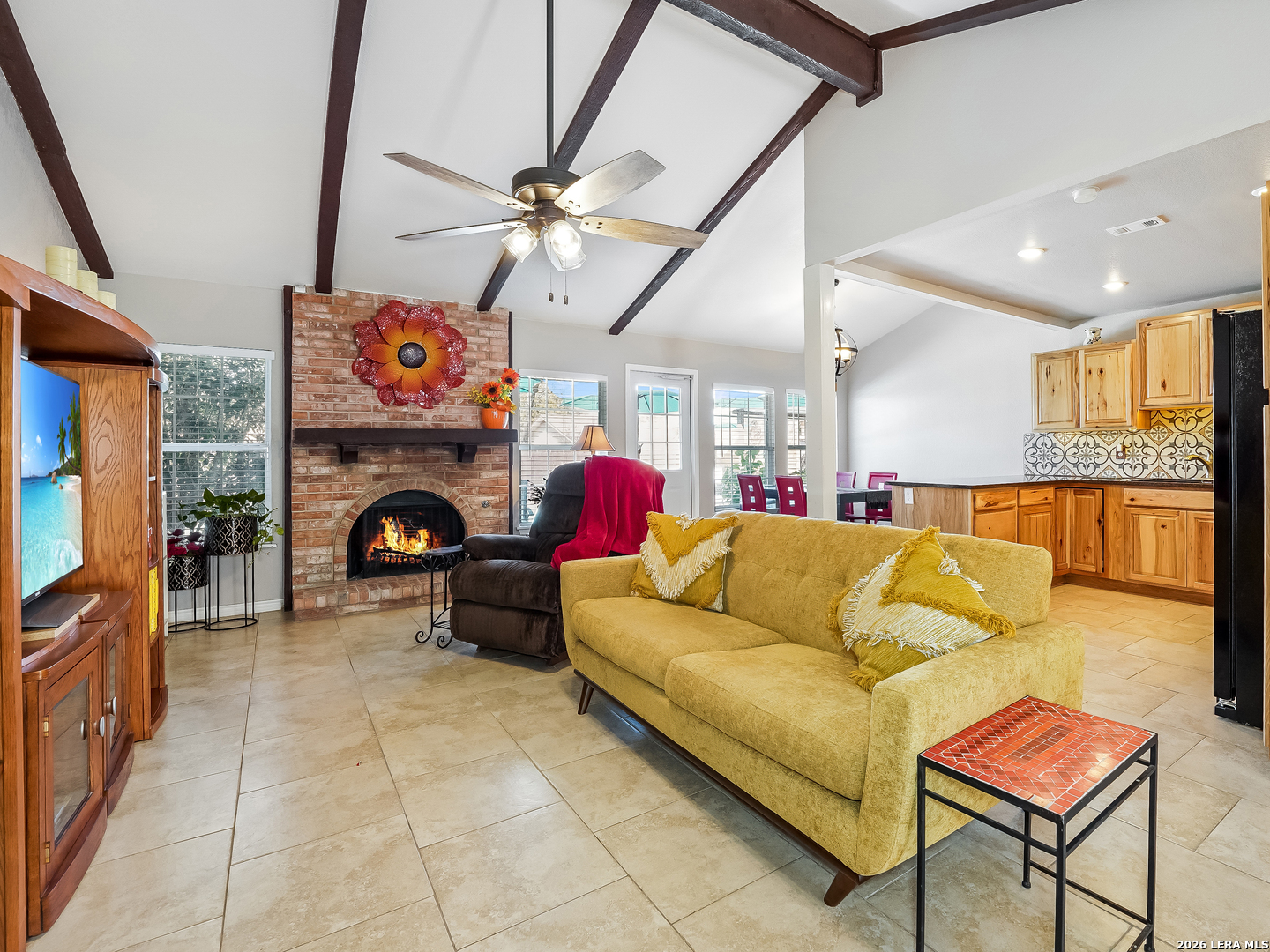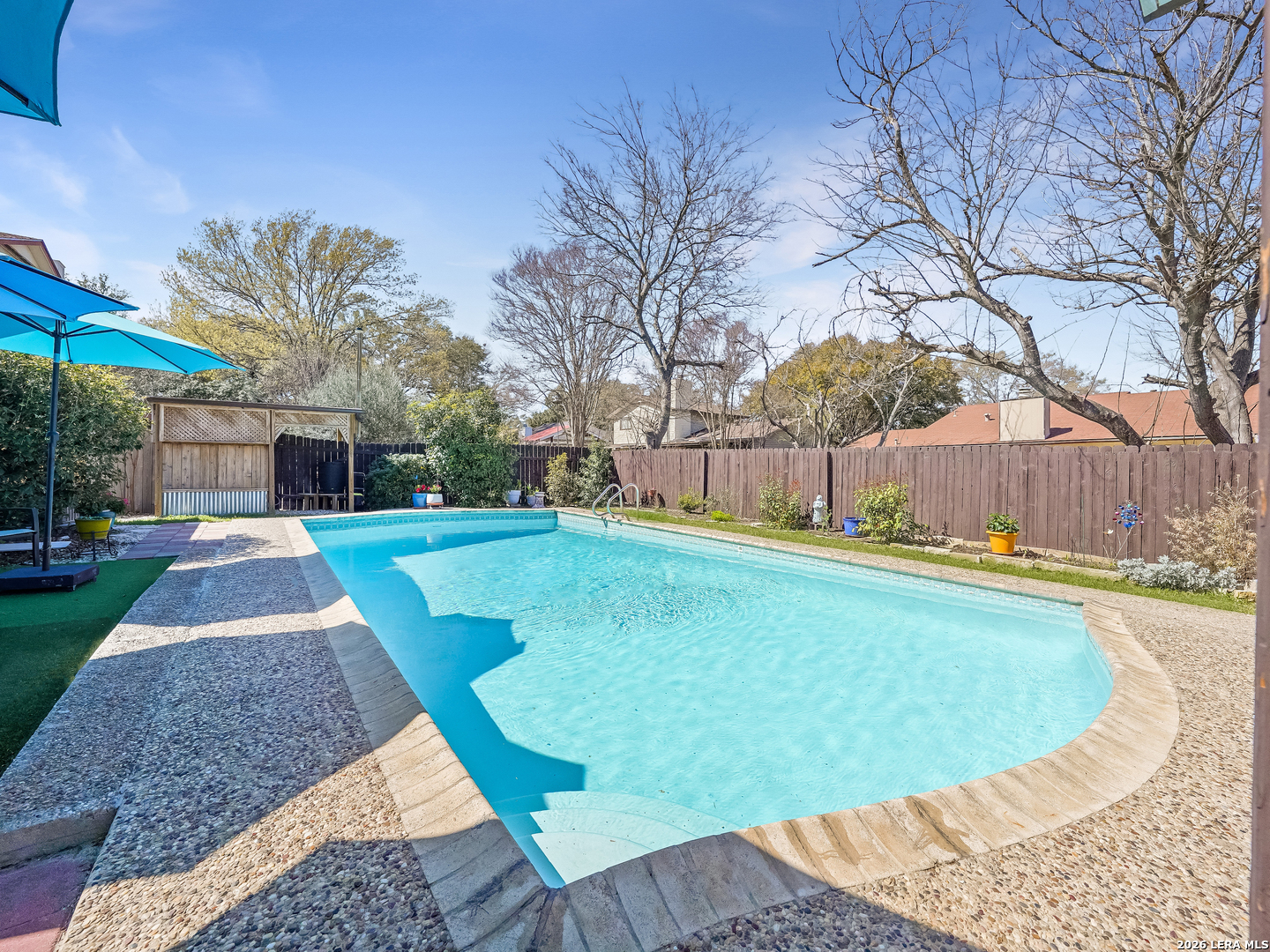 Just in time for spring, your own backyard pool retreat awaits. Sparkling water views from the living room, kitchen, and primary suite make this one-story home unforgettable! Soaring ceilings, fireplace, and quartz counters enhance the open design, while the primary suite offers direct patio access. Established Tanglewood location near the Medical Center, La Cantera, The Rim, and UTSA. Architectural character and indoor-outdoor flow define this beautiful one-story home. Cathedral ceilings with exposed beams, tile flooring and natural light create an open, airy feel, anchored by a brick fireplace and expansive sightlines to the refreshing backyard pool. The kitchen sits at the heart of the home with quartz countertops, stainless and black appliances, generous cabinetry including lazy Susan storage, and a breakfast area overlooking the pool. The side-by-side refrigerator is less that a year old and will convey. The split floor plan offers privacy, with a spacious primary suite featuring cathedral ceilings, vinyl plank flooring, walk-in closet, dual sink granite vanity, walk-in shower, and a sliding glass door that opens out to the covered patio and pool area. Two secondary bedrooms with laminate flooring share a beautifully finished bath with tiled surround, while an extra bath with jetted tub provides a spa-like retreat. Outside, enjoy a covered patio, sun deck, and sparkling in-ground pool - the highlight of the backyard. Located in the established Tanglewood neighborhood with voluntary HOA and convenient access to premier shopping, dining, UTSA, and the South Texas Medical Center.