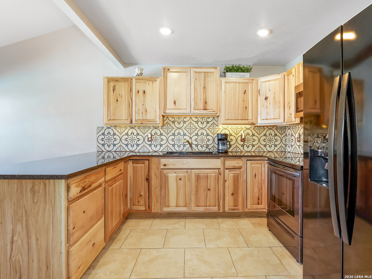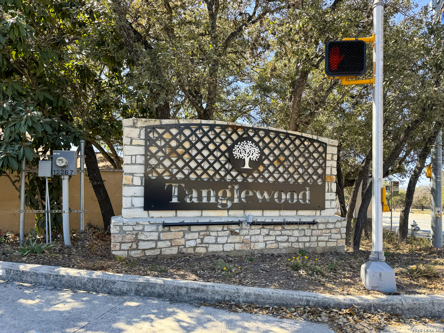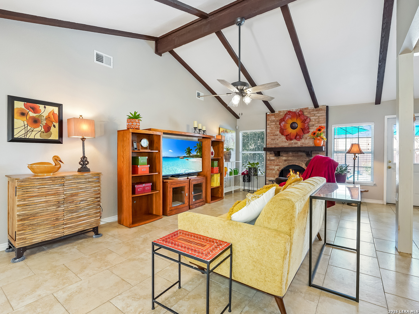 Just in time for spring, your own backyard pool retreat awaits. Sparkling water views from the living room, kitchen, and primary suite make this one-story home unforgettable! Soaring ceilings, fireplace, and quartz counters enhance the open design, while the primary suite offers direct patio access. Established Tanglewood location near the Medical Center, La Cantera, The Rim, and UTSA. Architectural character and indoor-outdoor flow define this beautiful one-story home. Cathedral ceilings with exposed beams, tile flooring and natural light create an open, airy feel, anchored by a brick fireplace and expansive sightlines to the refreshing backyard pool. The kitchen sits at the heart of the home with quartz countertops, stainless and black appliances, generous cabinetry including lazy Susan storage, and a breakfast area overlooking the pool. The side-by-side refrigerator is less that a year old and will convey. The split floor plan offers privacy, with a spacious primary suite featuring cathedral ceilings, vinyl plank flooring, walk-in closet, dual sink granite vanity, walk-in shower, and a sliding glass door that opens out to the covered patio and pool area. Two secondary bedrooms with laminate flooring share a beautifully finished bath with tiled surround, while an extra bath with jetted tub provides a spa-like retreat. Outside, enjoy a covered patio, sun deck, and sparkling in-ground pool - the highlight of the backyard. Located in the established Tanglewood neighborhood with voluntary HOA and convenient access to premier shopping, dining, UTSA, and the South Texas Medical Center.