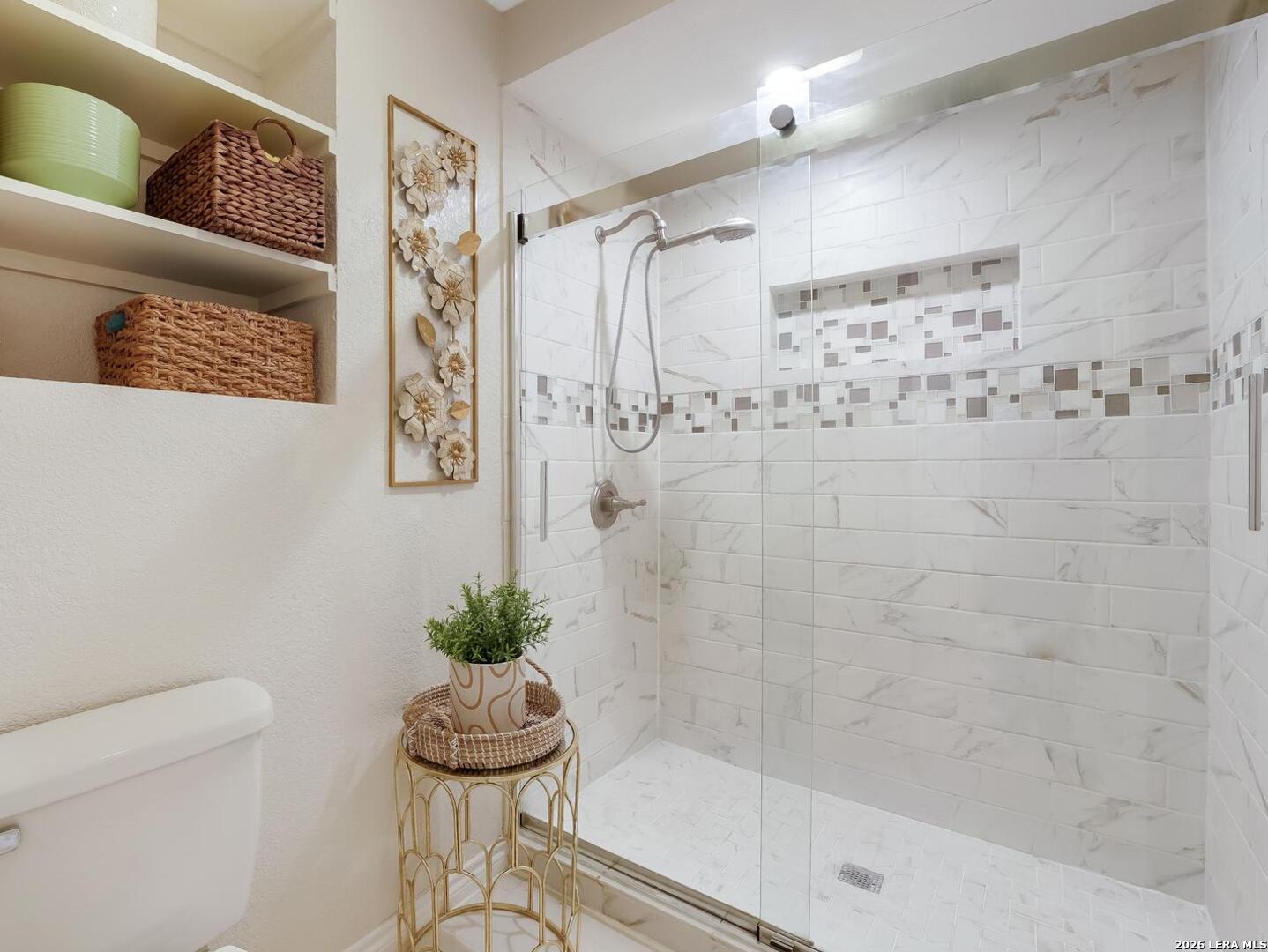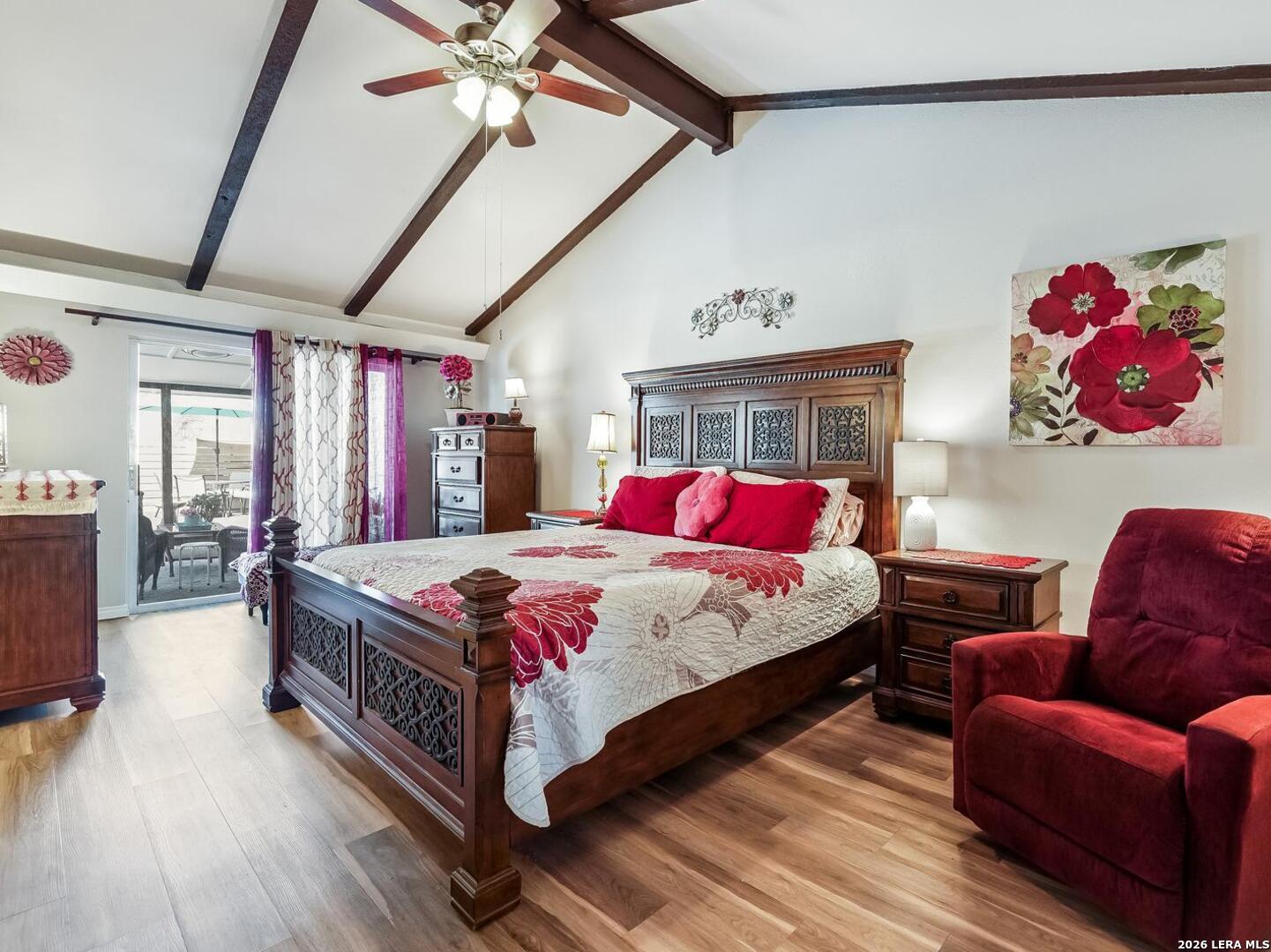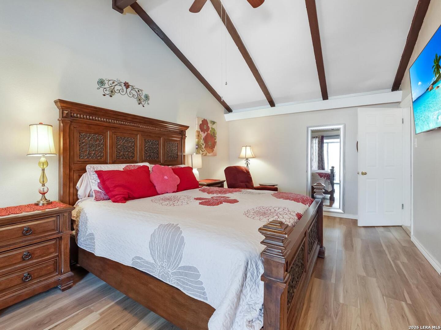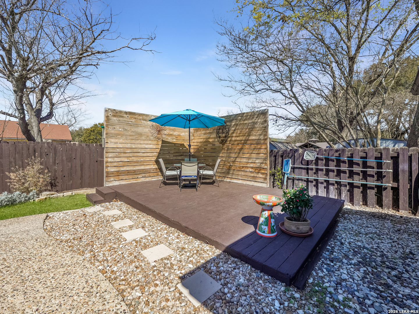 Just in time for spring, your own backyard pool retreat awaits. Sparkling water views from the living room, kitchen, and primary suite make this one-story home unforgettable! Soaring ceilings, fireplace, and quartz counters enhance the open design, while the primary suite offers direct patio access. Established Tanglewood location near the Medical Center, La Cantera, The Rim, and UTSA. Architectural character and indoor-outdoor flow define this beautiful one-story home. Cathedral ceilings with exposed beams, tile flooring and natural light create an open, airy feel, anchored by a brick fireplace and expansive sightlines to the refreshing backyard pool. The kitchen sits at the heart of the home with quartz countertops, stainless and black appliances, generous cabinetry including lazy Susan storage, and a breakfast area overlooking the pool. The side-by-side refrigerator is less that a year old and will convey. The split floor plan offers privacy, with a spacious primary suite featuring cathedral ceilings, vinyl plank flooring, walk-in closet, dual sink granite vanity, walk-in shower, and a sliding glass door that opens out to the covered patio and pool area. Two secondary bedrooms with laminate flooring share a beautifully finished bath with tiled surround, while an extra bath with jetted tub provides a spa-like retreat. Outside, enjoy a covered patio, sun deck, and sparkling in-ground pool - the highlight of the backyard. Located in the established Tanglewood neighborhood with voluntary HOA and convenient access to premier shopping, dining, UTSA, and the South Texas Medical Center.