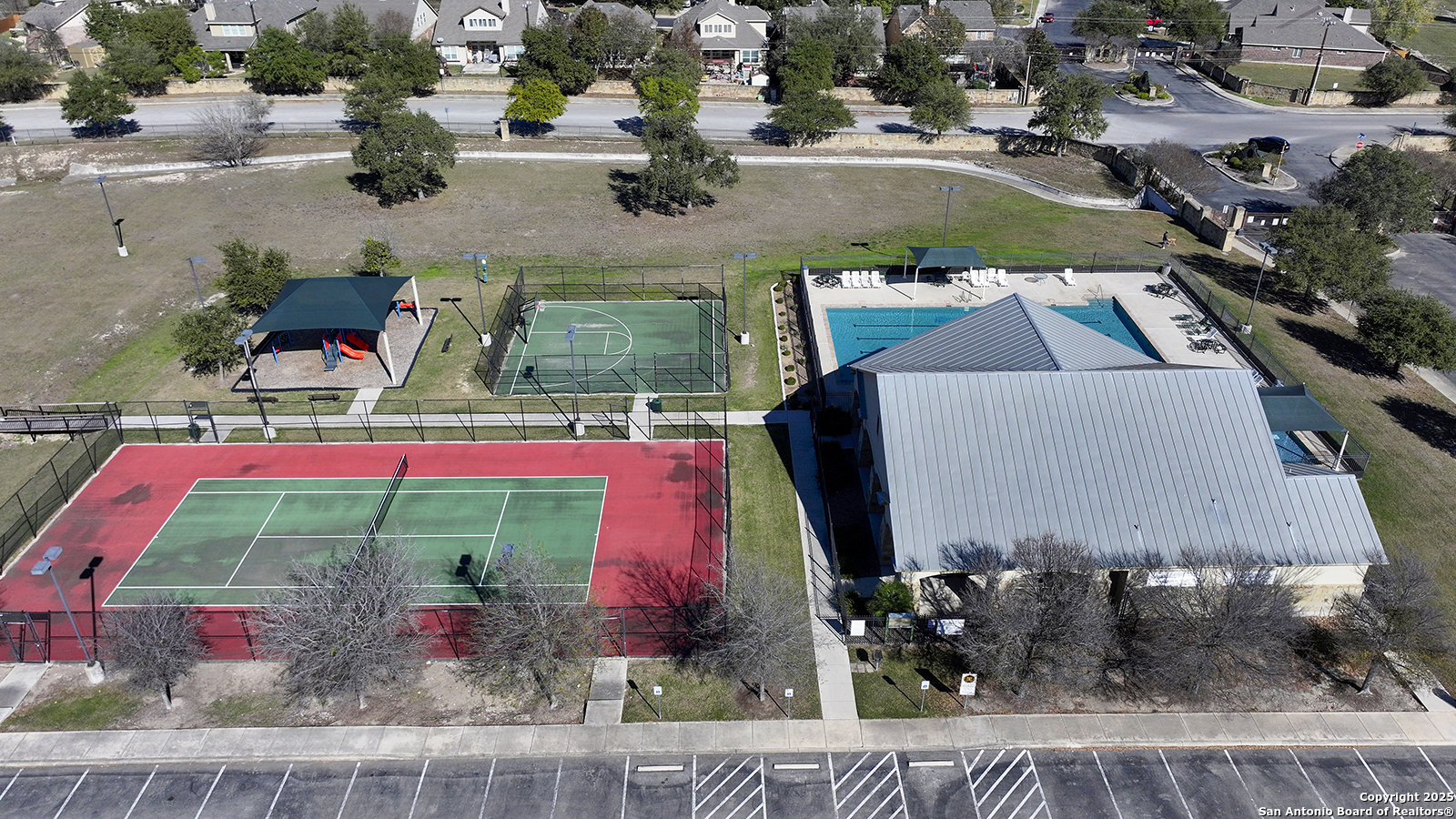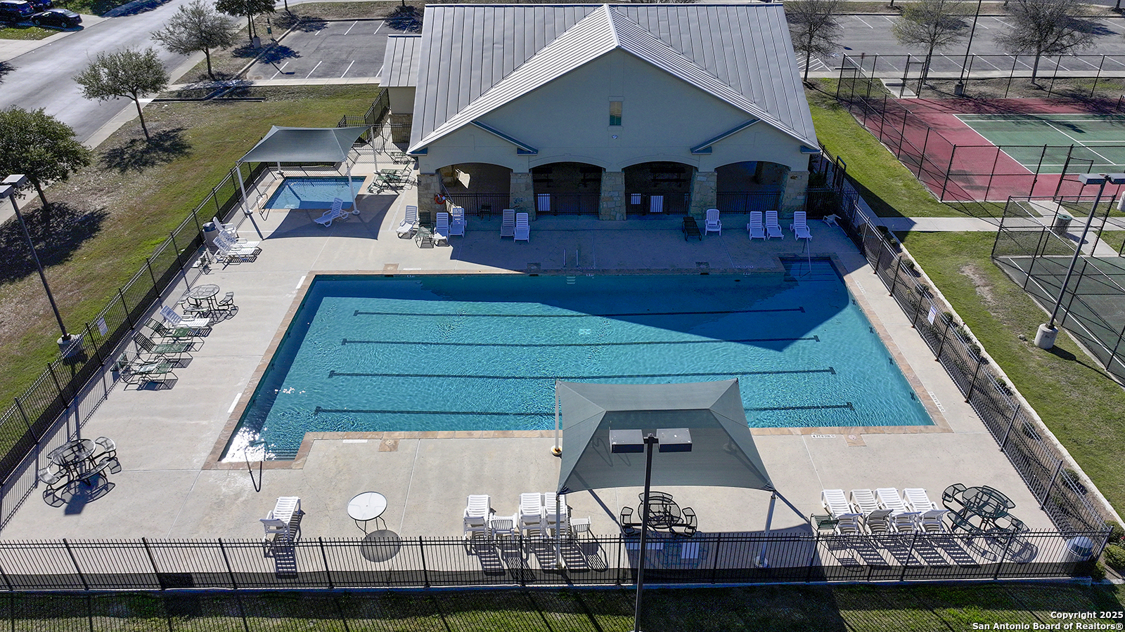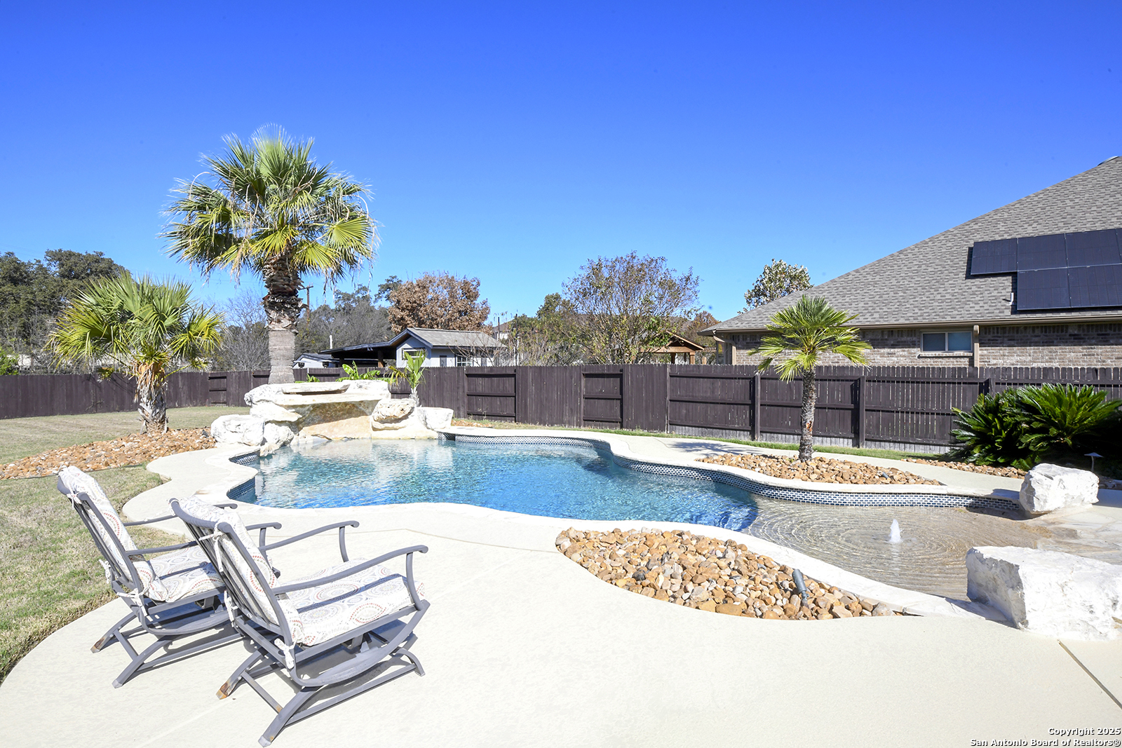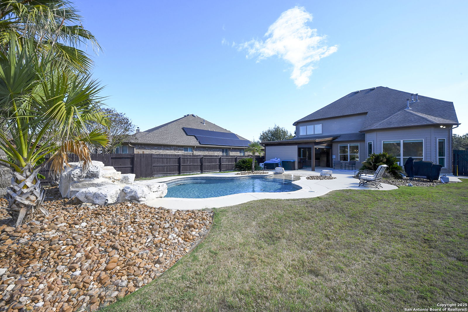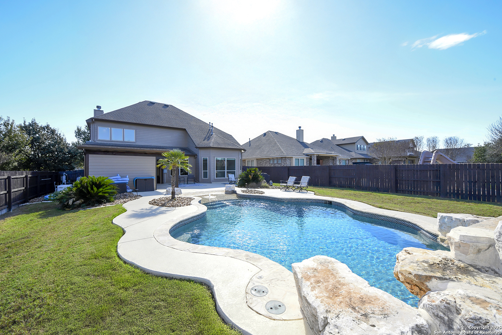 Welcome to this exceptional 5-bedroom, 4-bathroom residence offering 3,439 square feet of thoughtfully designed living space on a private cul-de-sac in a gated community with NO CITY TAX. Upon entry into the spacious foyer, potential buyers will find a fully-equipped functional kitchen, multiple eating areas, and a stone fireplace in a living area filled with natural light. The over-sized primary suite is conveniently located on the main level, providing a private retreat with room to unwind. Also downstairs is a dedicated study-ideal for working from home-as well as a secondary bedroom and bathroom. Spaces found upstairs include three generously sized secondary bedrooms, two full bathrooms, a game room and a separate media room, perfect for movie nights, entertaining, and everyday fun. Step outside to your private outdoor living area complete with a swimming pool with no backyard neighbors, creating a peaceful setting for relaxation and gatherings. Whether hosting friends or enjoying a quiet evening, this backyard oasis offers both privacy and enjoyment. Located just minutes from abundant dining and shopping options, H-E-B, and highly rated schools, this home combines comfort with convenience. Enjoy easy access to Government Canyon State Natural Area, Lackland Air Force Base, UTSA, and more-making this an ideal home for both lifestyle and location. 6123 Gypsy Bell offers many extras- from the impressive stamped concrete sidewalk and tiled front porch to the whole house generator to the FULLY EQUIPPED media room- yes, you read that right! All media room furniture and equipment convey. This is a rare opportunity to own a spacious, well-appointed home with resort-style amenities in an unbeatable area.