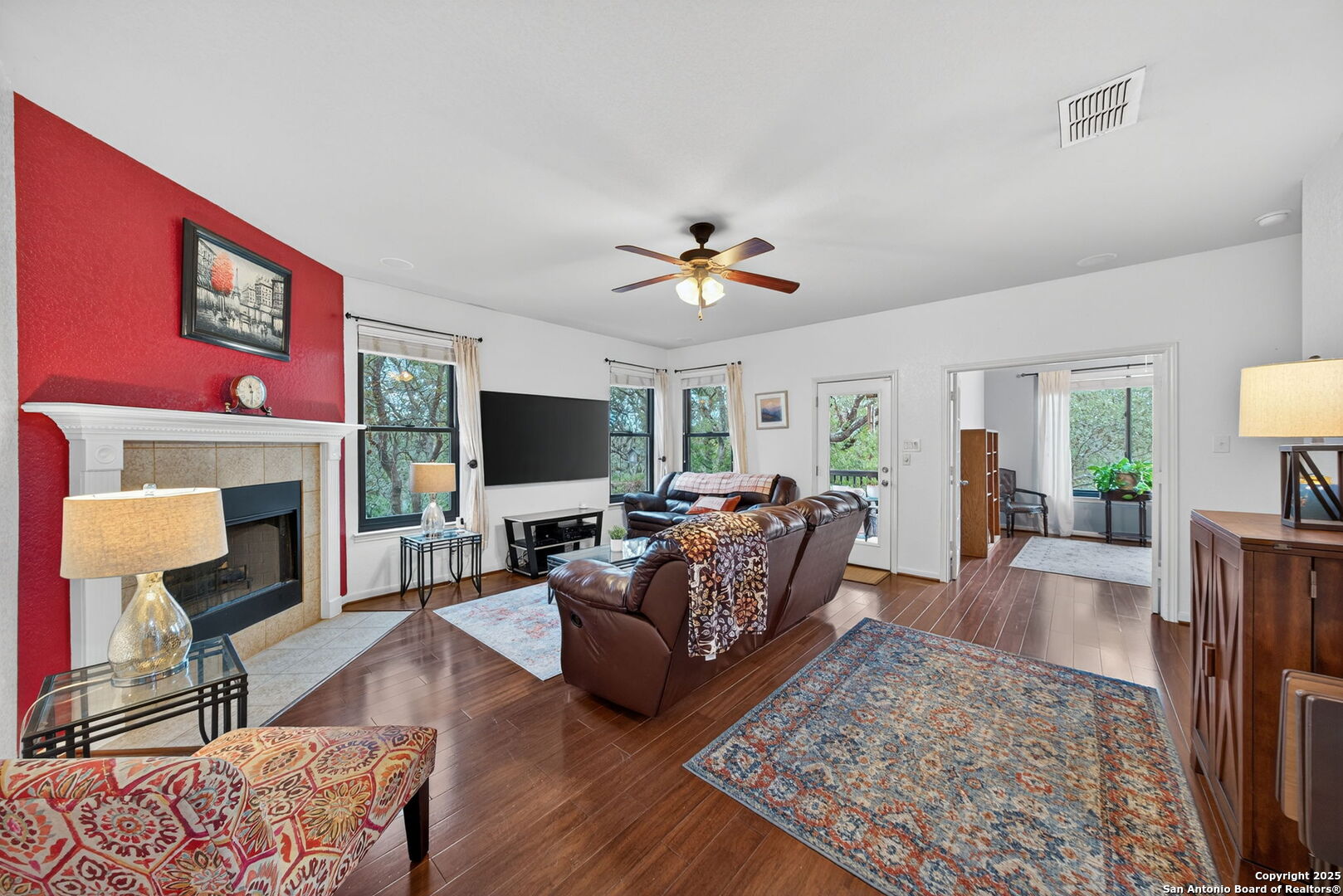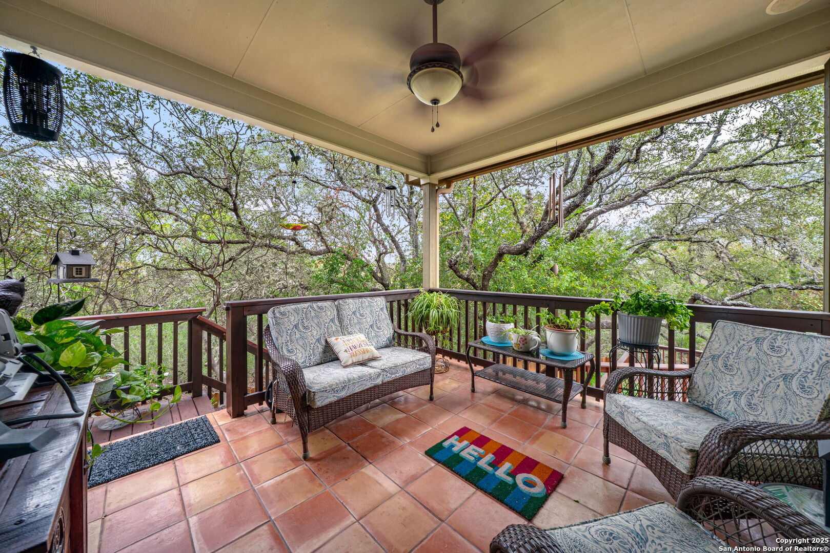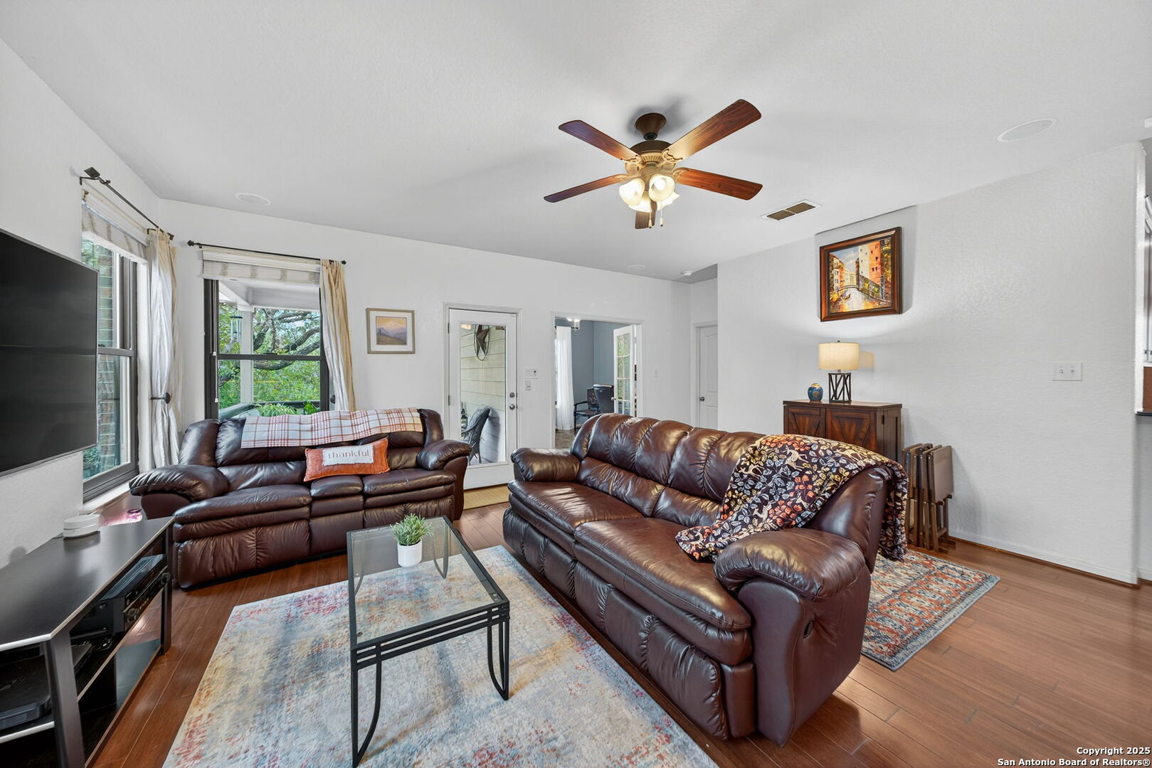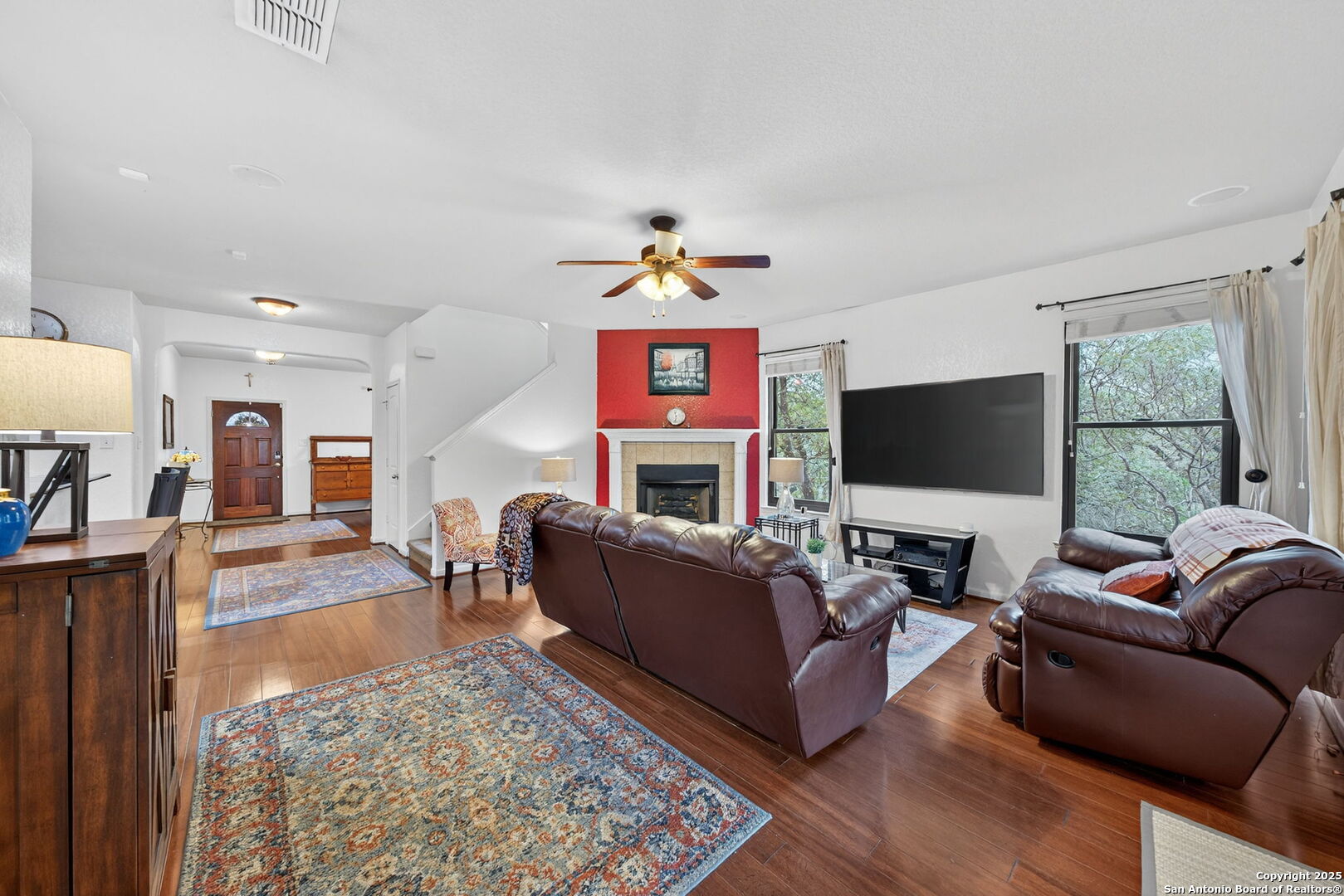 Welcome to 614 Colossus Way, a stunning 4-bedroom 2.5-bath home tucked away on a private cul-de-sac lot that backs to a serene greenbelt. From the moment you arrive, you'll feel the peaceful atmosphere as you step onto the inviting covered front porch. Inside, the bright open floor plan is filled with natural light and features rich wood flooring throughout. A formal dining room sits to your left, creating the perfect space for gatherings and holiday meals. The spacious living area offers a cozy fireplace and large windows that frame sweeping views of mature trees and the tranquil outdoors. The chef's kitchen blends style and function with gas cooking, granite counters, stainless steel appliances, a center island, breakfast bar, and abundant cabinet and counter space. A private study or flex room at the back of the home provides additional space to work or unwind while enjoying picturesque Hill Country views. The downstairs primary suite showcases peaceful greenbelt views and includes a private ensuite with dual vanities and a separate tub and shower. Upstairs, you'll find three generously sized secondary bedrooms and a large game room ideal for movie nights, hobbies, or indoor fun. Step outside and enjoy one of the home's true highlights. The covered patio opens to a tiered deck that offers plenty of space for entertaining or relaxing. With no neighbors behind you and a lush backdrop of trees, the setting feels like your own private retreat. Neighborhood amenities include a pool, park/playground, and basketball court, giving you even more to love. This home offers comfort, privacy, and a beautiful natural setting all in one. Come see why 614 Colossus Way is the perfect place to settle in and enjoy the San Antonio lifestyle. Schedule your showing today!