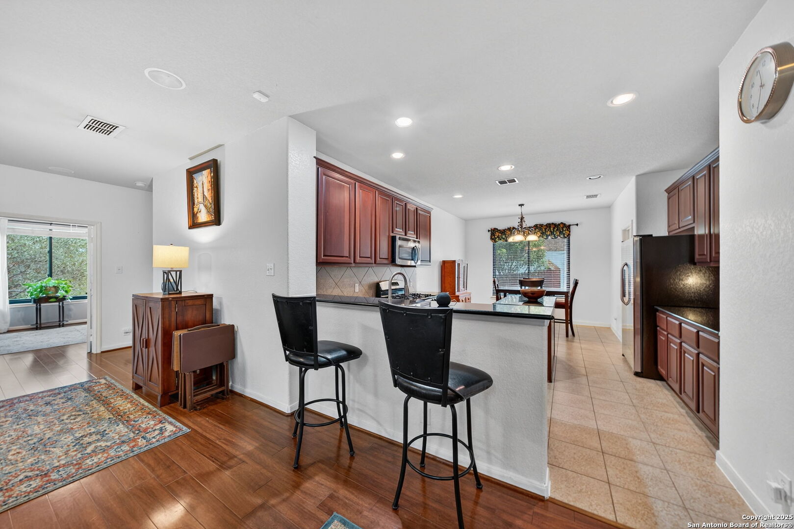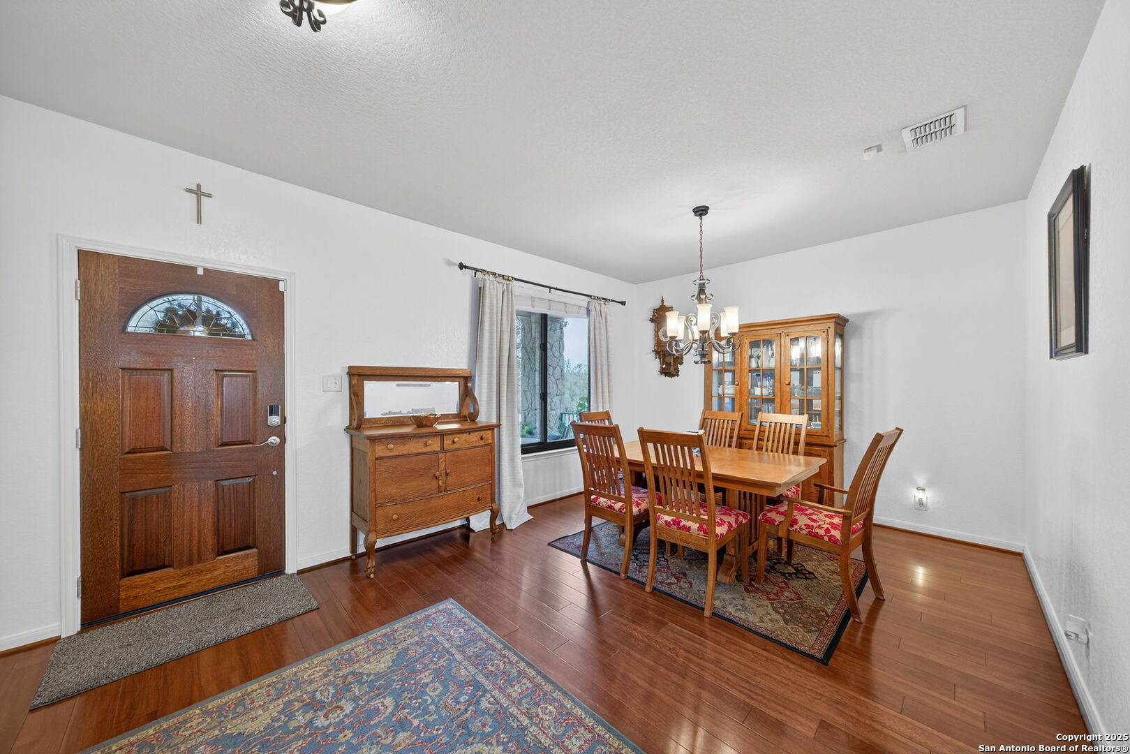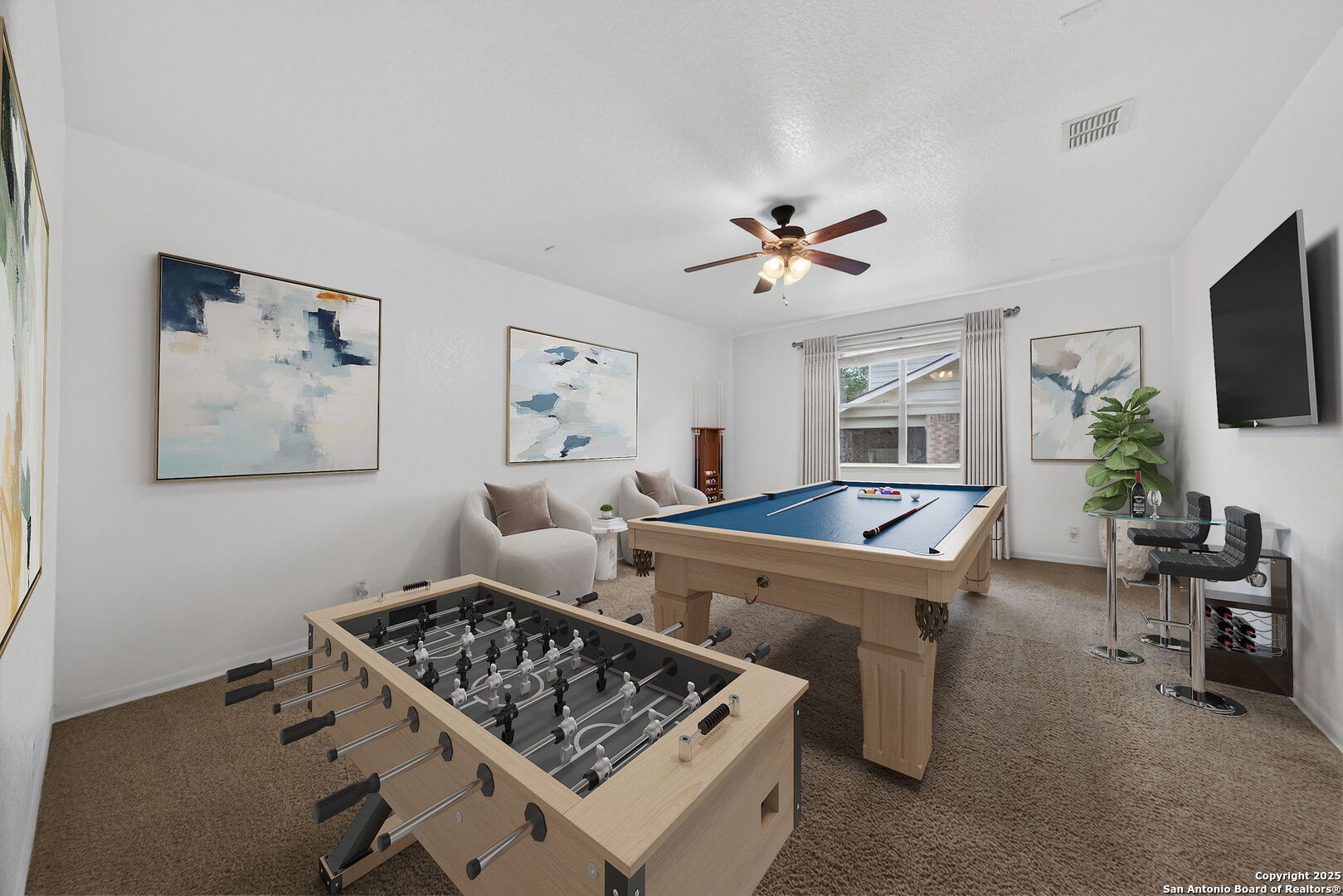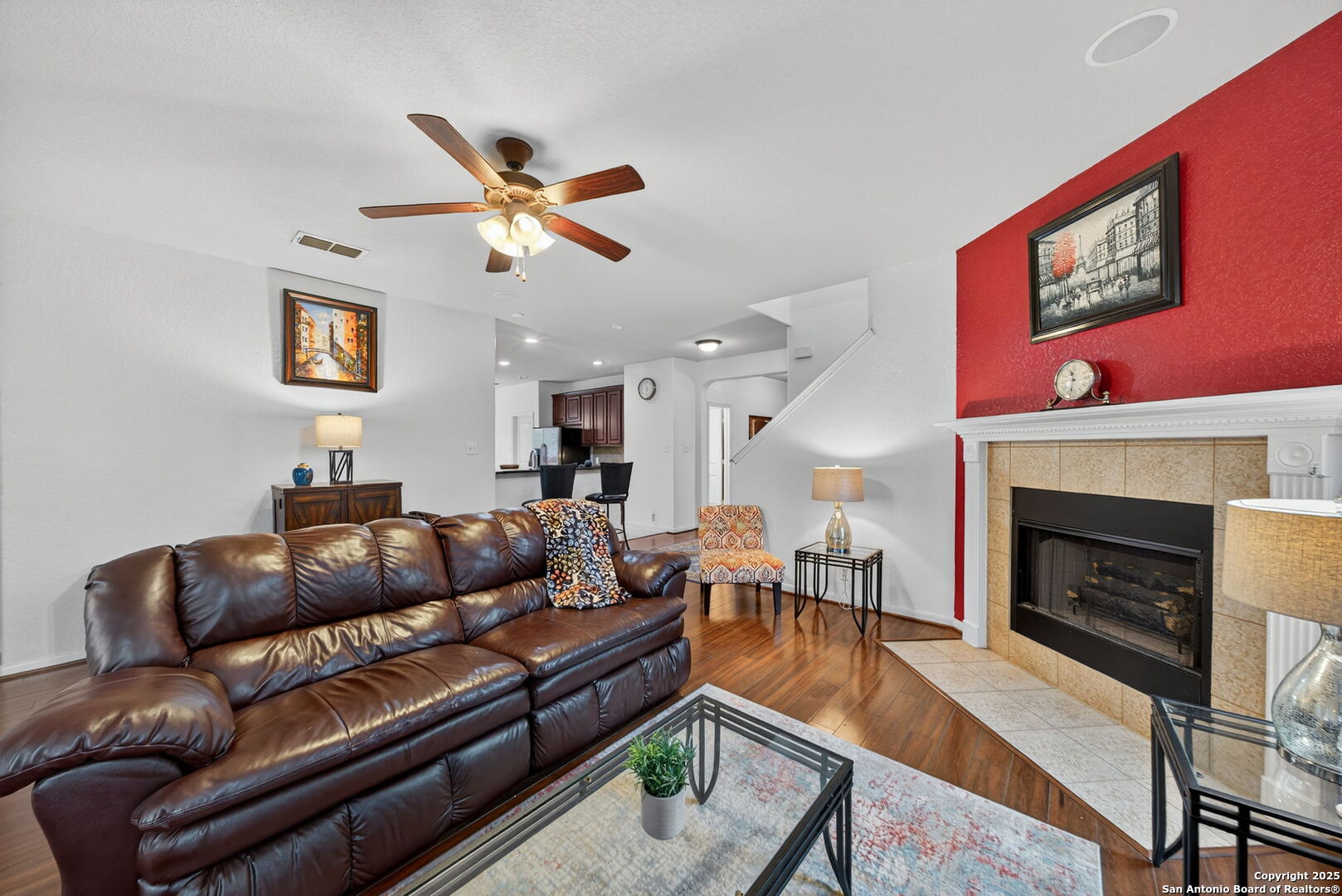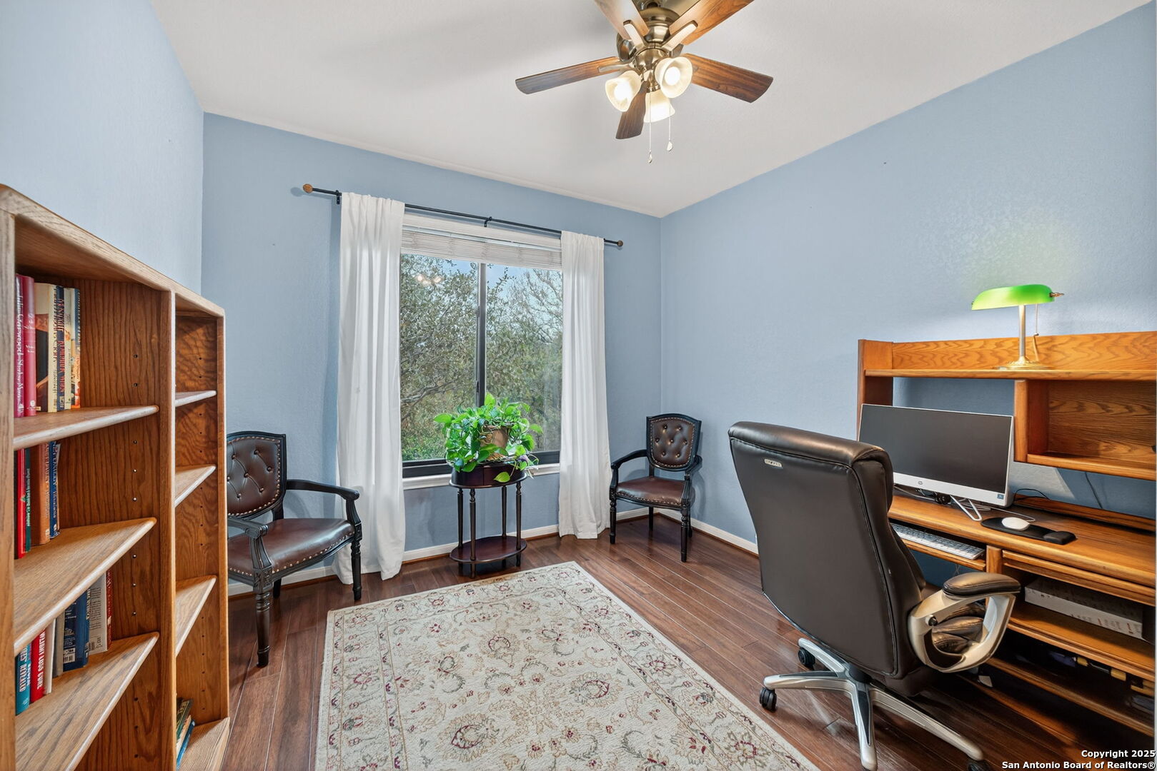 Welcome to 614 Colossus Way, a stunning 4-bedroom 2.5-bath home tucked away on a private cul-de-sac lot that backs to a serene greenbelt. From the moment you arrive, you'll feel the peaceful atmosphere as you step onto the inviting covered front porch. Inside, the bright open floor plan is filled with natural light and features rich wood flooring throughout. A formal dining room sits to your left, creating the perfect space for gatherings and holiday meals. The spacious living area offers a cozy fireplace and large windows that frame sweeping views of mature trees and the tranquil outdoors. The chef's kitchen blends style and function with gas cooking, granite counters, stainless steel appliances, a center island, breakfast bar, and abundant cabinet and counter space. A private study or flex room at the back of the home provides additional space to work or unwind while enjoying picturesque Hill Country views. The downstairs primary suite showcases peaceful greenbelt views and includes a private ensuite with dual vanities and a separate tub and shower. Upstairs, you'll find three generously sized secondary bedrooms and a large game room ideal for movie nights, hobbies, or indoor fun. Step outside and enjoy one of the home's true highlights. The covered patio opens to a tiered deck that offers plenty of space for entertaining or relaxing. With no neighbors behind you and a lush backdrop of trees, the setting feels like your own private retreat. Neighborhood amenities include a pool, park/playground, and basketball court, giving you even more to love. This home offers comfort, privacy, and a beautiful natural setting all in one. Come see why 614 Colossus Way is the perfect place to settle in and enjoy the San Antonio lifestyle. Schedule your showing today!