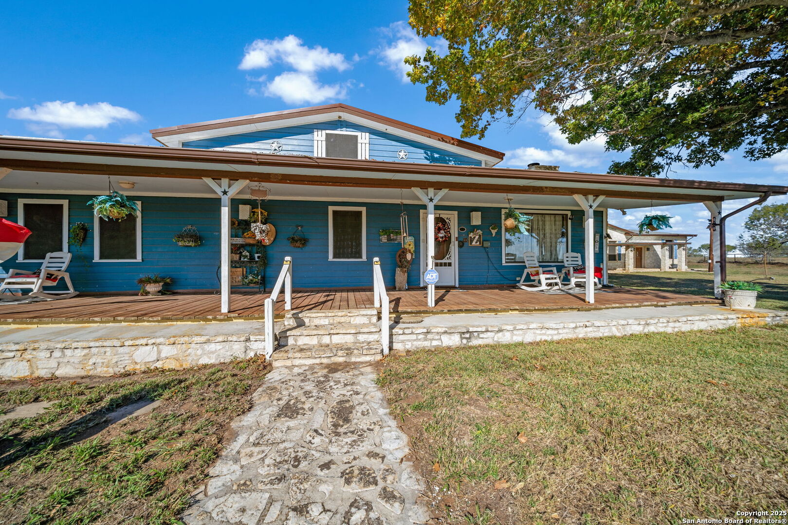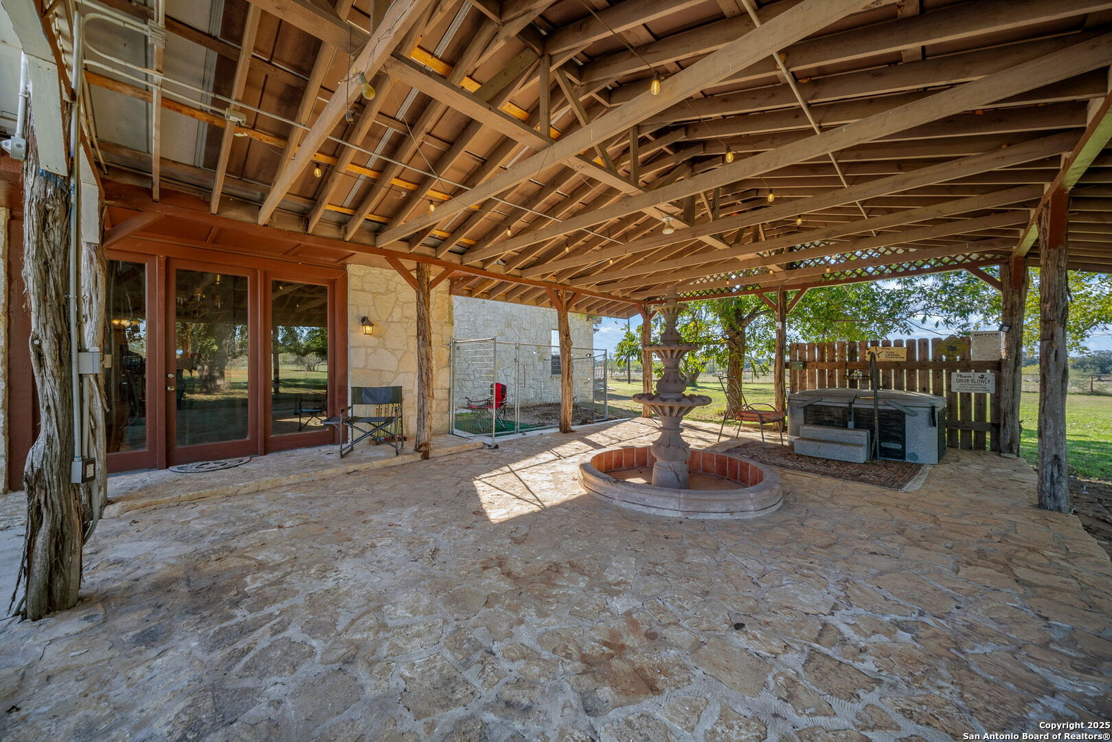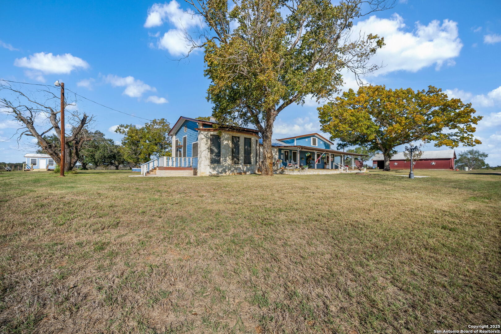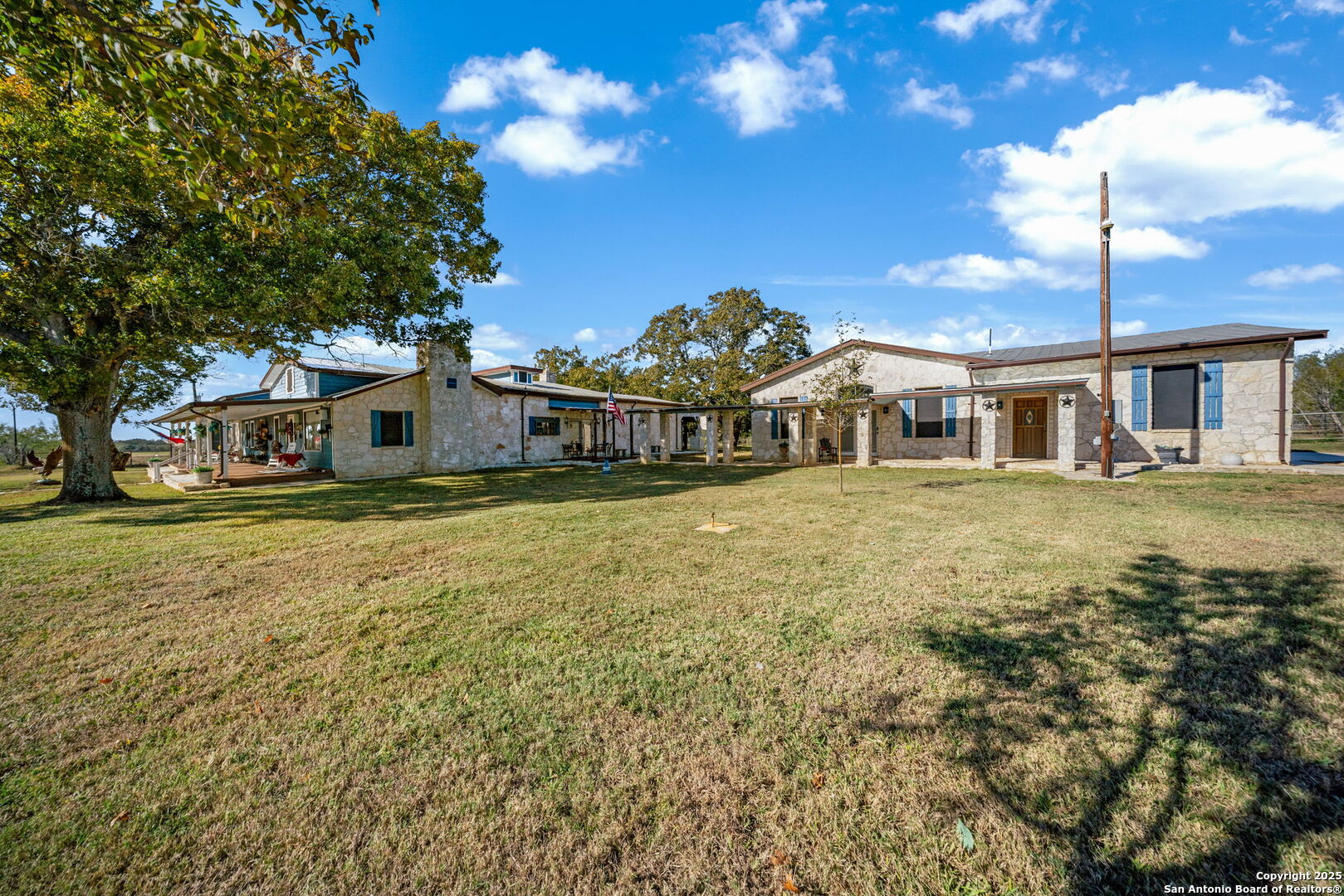 This lovely property features a 4-bedroom, 3-bath home with rustic pecan custom cabinets throughout, including both dual primary suites. The main primary suite includes a fireplace, a comfortable sitting area, and a large walk-in cedar closet.The kitchen offers rustic pecan custom cabinetry, a walk-in butler's pantry, a breakfast bar, and an eating area. Additional living spaces include a separate dining room and two living areas-each with its own fireplace. Step out back onto the large covered patio, perfect for relaxing or entertaining. The property also includes a well-appointed guest house featuring 1 bedroom, a full kitchen, laundry room, large living room with a fireplace, and a spacious walk-in safe-ideal for guests, rental income, or Airbnb. A large barn and beautiful mature Pecan trees complete the setting. You can enjoy this property inside and out. Come take a look for yourself; there is plenty more to see.