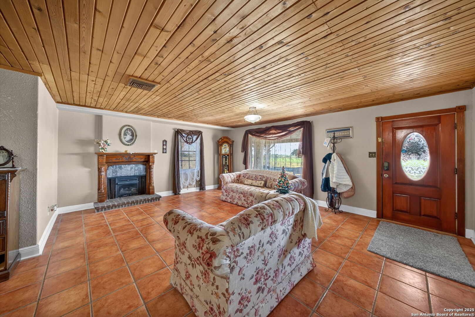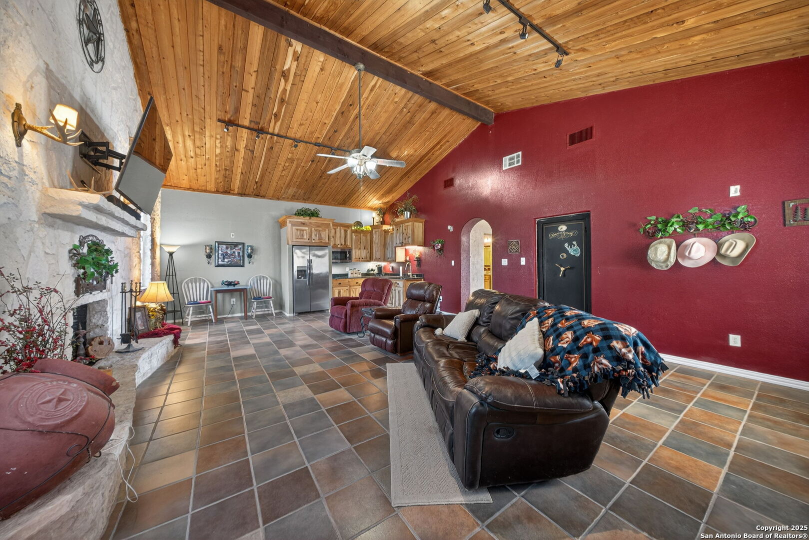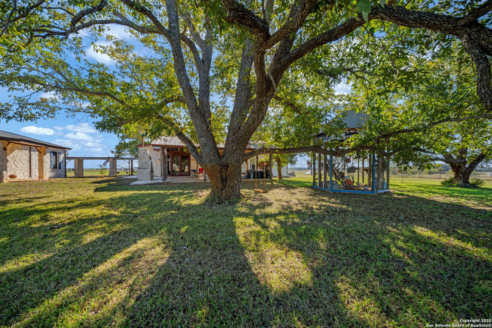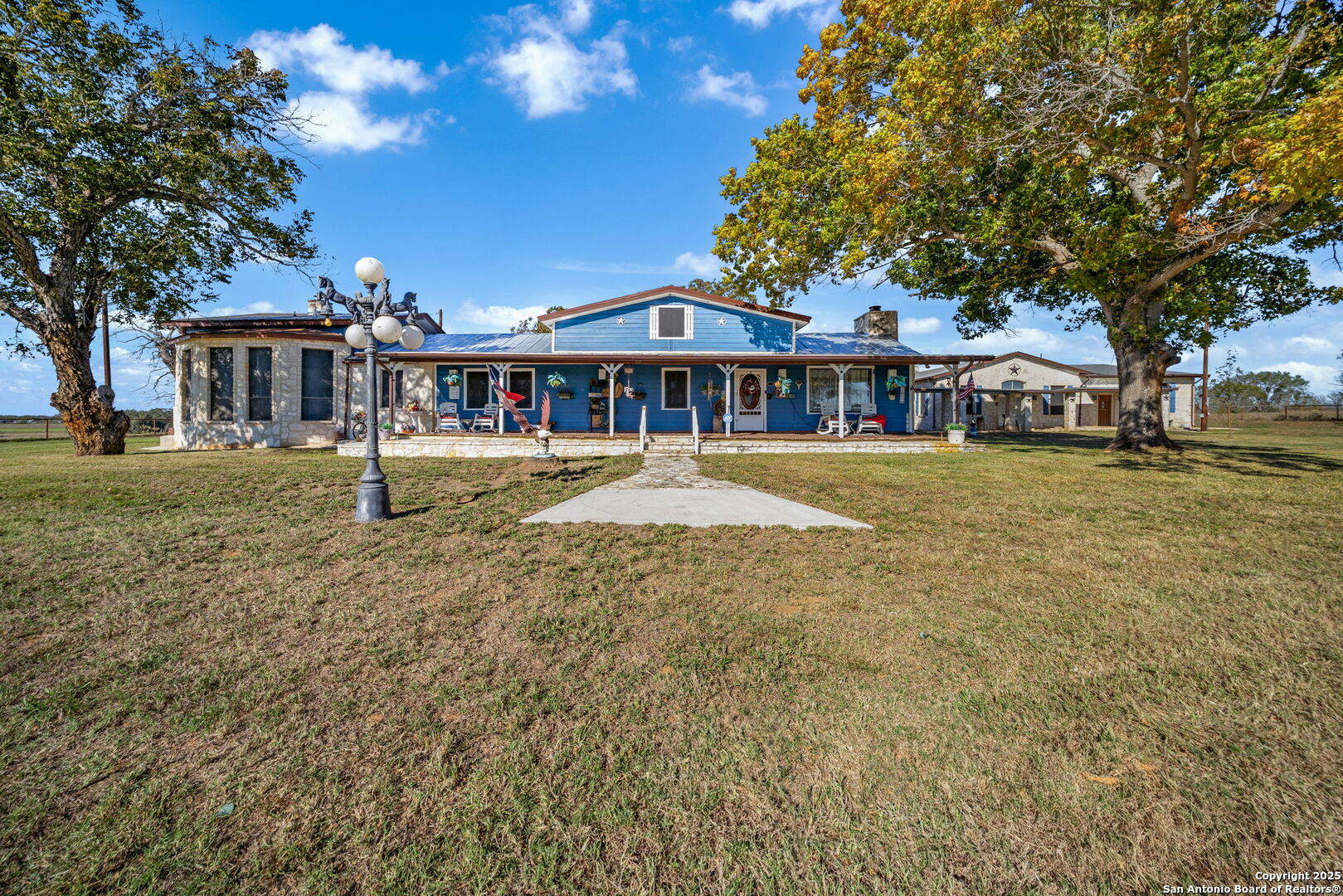 This lovely property features a 4-bedroom, 3-bath home with rustic pecan custom cabinets throughout, including both dual primary suites. The main primary suite includes a fireplace, a comfortable sitting area, and a large walk-in cedar closet.The kitchen offers rustic pecan custom cabinetry, a walk-in butler's pantry, a breakfast bar, and an eating area. Additional living spaces include a separate dining room and two living areas-each with its own fireplace. Step out back onto the large covered patio, perfect for relaxing or entertaining. The property also includes a well-appointed guest house featuring 1 bedroom, a full kitchen, laundry room, large living room with a fireplace, and a spacious walk-in safe-ideal for guests, rental income, or Airbnb. A large barn and beautiful mature Pecan trees complete the setting. You can enjoy this property inside and out. Come take a look for yourself; there is plenty more to see.