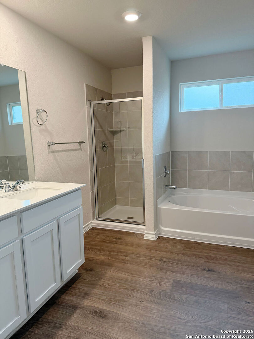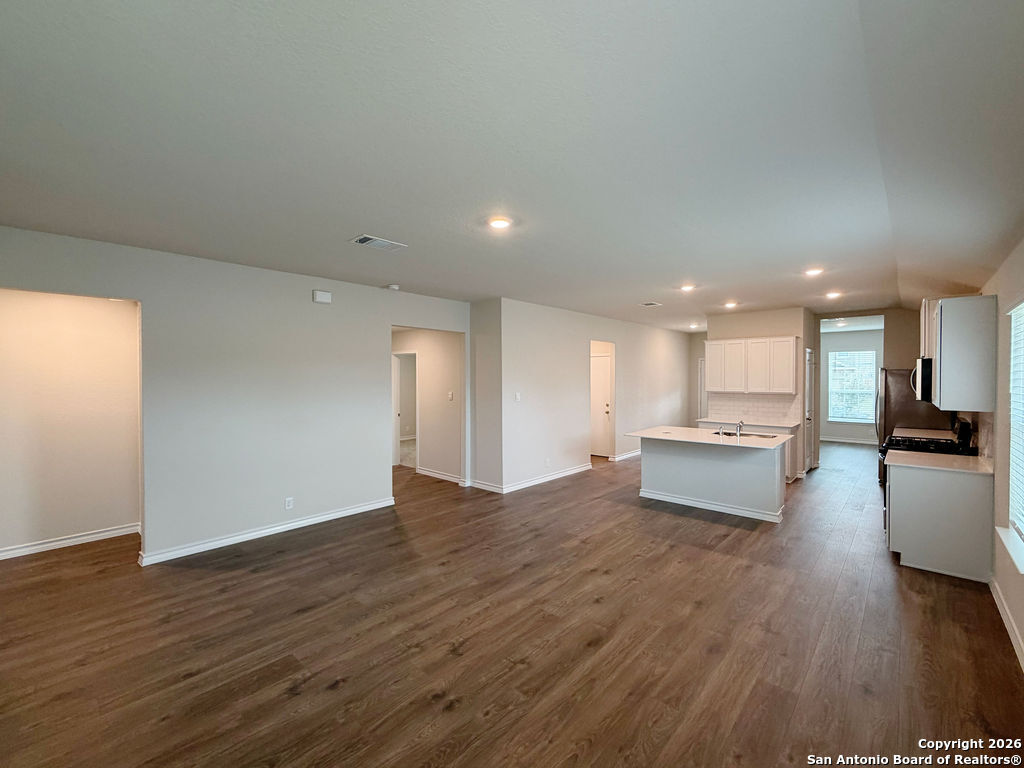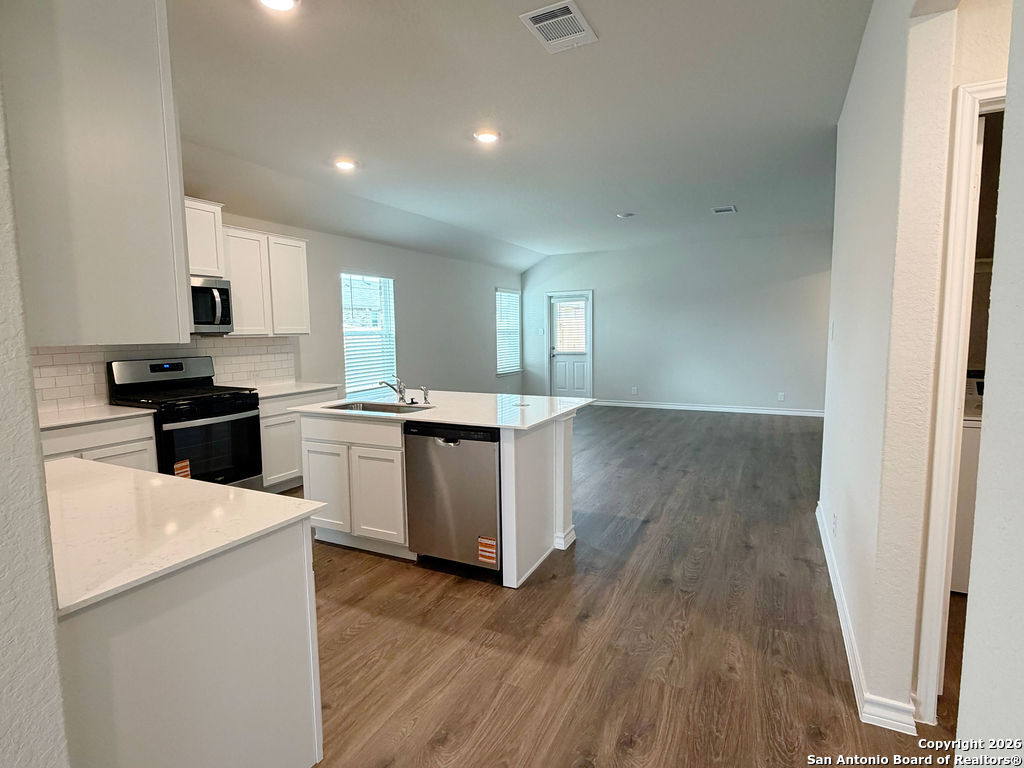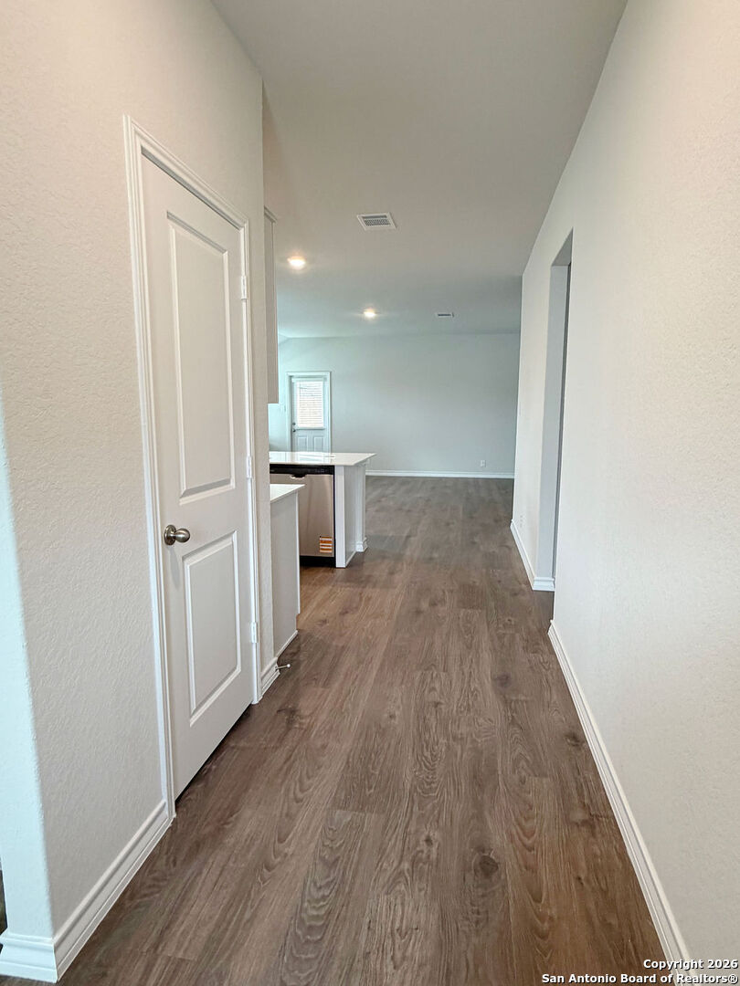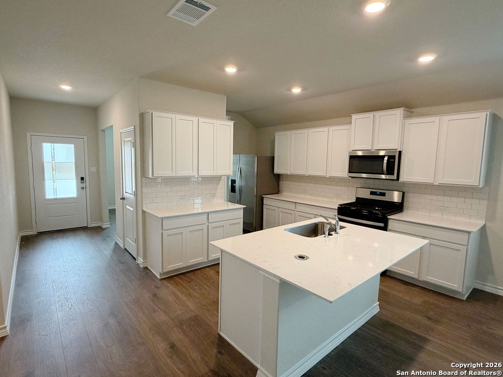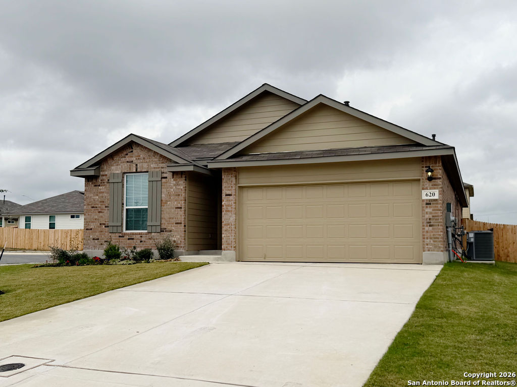 Welcome to 620 Sumpter Banks, a beautiful single-story home offering 1,650 square feet of thoughtfully designed living space, featuring 3 bedrooms, 2 bathrooms, and a 2-car garage. This well-appointed layout includes a separate dining area that flows seamlessly into an open-concept kitchen. The kitchen boasts ample cabinet storage, quartz countertops, a subway tile backsplash, stainless steel appliances, an electric cooking range, and a deep kitchen island overlooking the living room-perfect for both everyday living and entertaining. The spacious primary bedroom suite is located just off the family room and features a double vanity, separate soaking tub and walk-in shower, a private water closet, and a generous walk-in closet. The secondary bedrooms are well-sized with large closets and are conveniently located near the second full bathroom, which offers plenty of natural light. A dedicated utility room is also located off the family room for added convenience. Additional highlights include 9-foot ceilings, 2-inch faux wood blinds throughout, luxury vinyl plank flooring in the entry, family room, kitchen, and dining area, and ceramic tile flooring in the bathrooms and utility room. The home is pre-plumbed for a water softener loop and already includes a water softener system. The garage floors feature durable epoxy coating for a clean, finished look. For added comfort and convenience, all appliances are provided, including a washer, dryer, and refrigerator. Enjoy modern living with the home's Home Is Connected smart technology, allowing you to control lighting, thermostat, and door locks from your mobile device through one central hub. Step outside to relax on the large covered patio located off the family room and take advantage of full yard landscaping and full yard irrigation. This home offers comfort, functionality, and modern features-all in one exceptional package.
