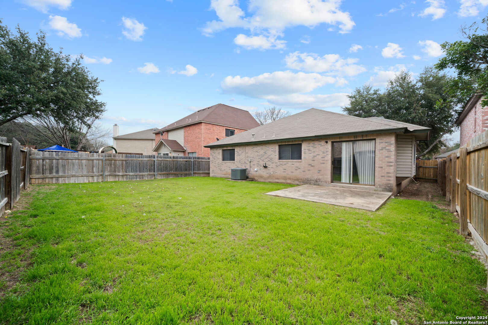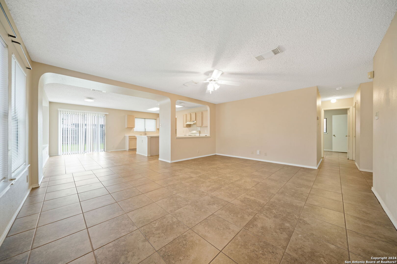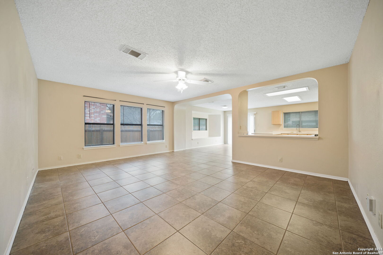 Settle into this spacious one-story home in Regency Meadow, ready for immediate move-in. Designed with an open floor plan and ceramic tile throughout, the home offers easy living and low maintenance. The living room welcomes you with arched entryways, abundant natural light, and a ceiling fan for added comfort. The eat-in kitchen is ideal for gathering, featuring a center island, ample cabinet and counter space, and a large walk-in pantry combined with the laundry room for convenience. The oversized primary bedroom provides a relaxing retreat with a generous walk-in closet and ceiling fan, while the ensuite bath includes a double vanity and tub/shower combo. Step outside to a private backyard with a patio slab and privacy fence-perfect for weekend barbecues or quiet evenings. Conveniently located near major highways, USAA, UTSA, Fiesta Texas, The Rim, La Cantera, and a variety of dining and entertainment options, this home offers both comfort and accessibility.