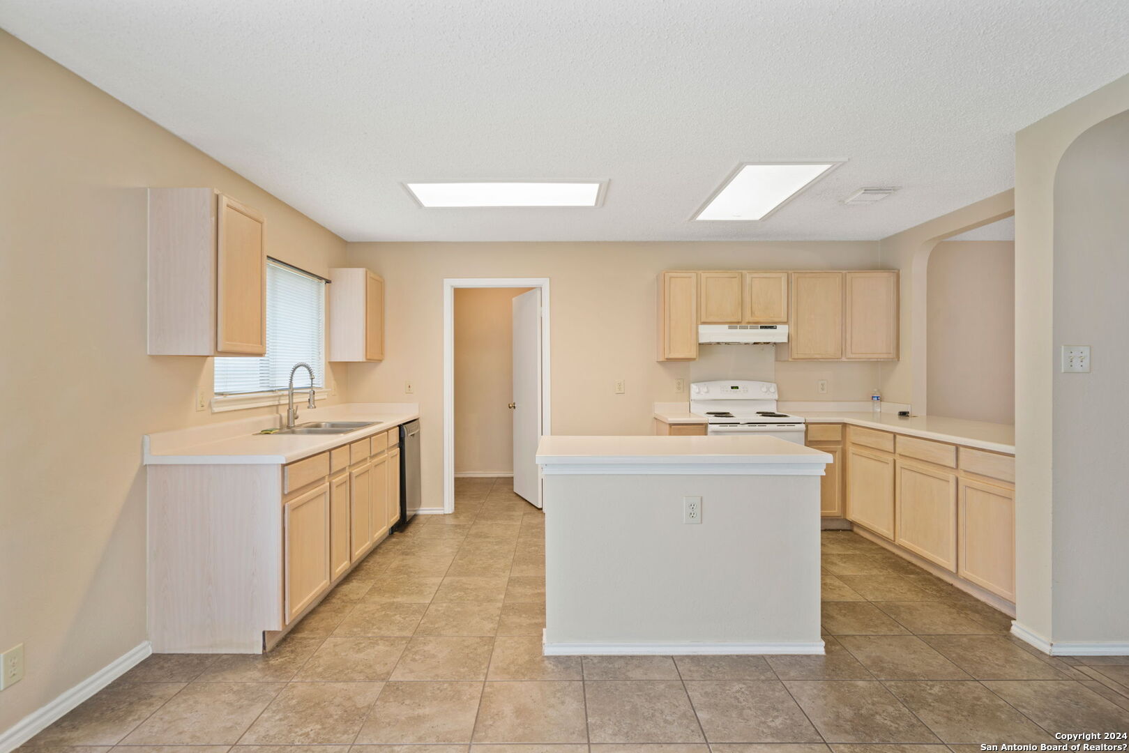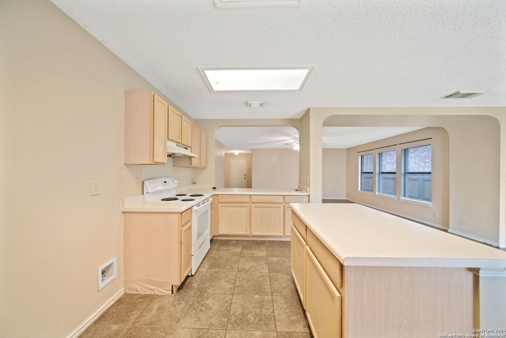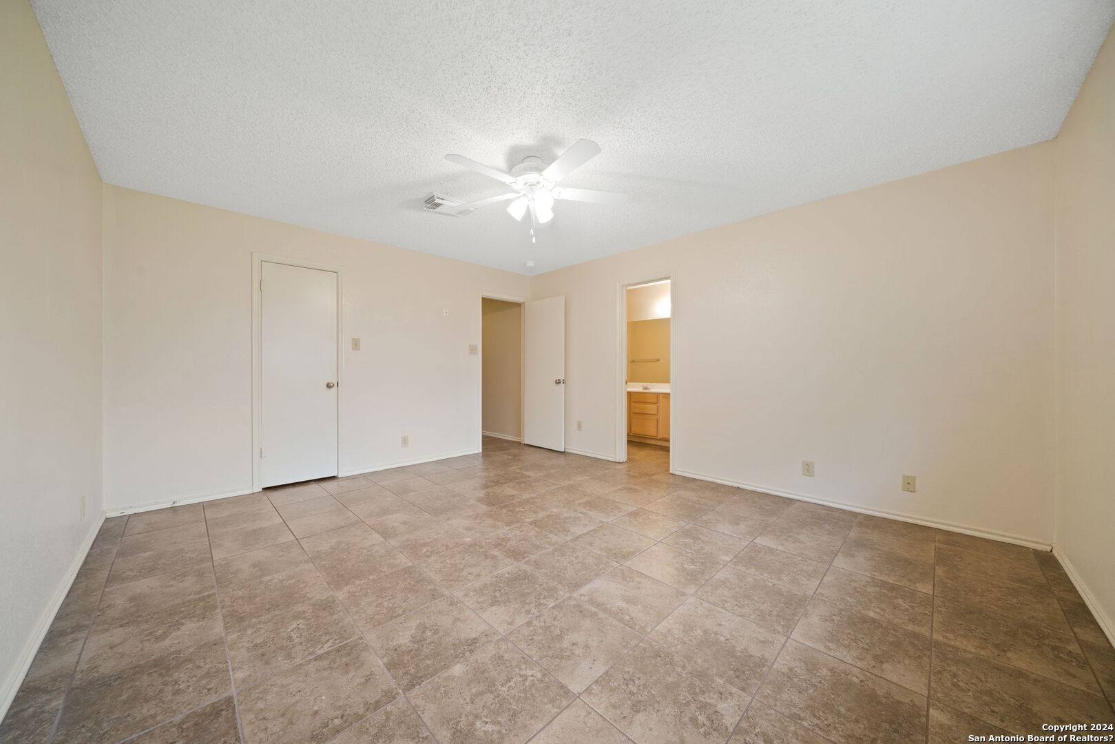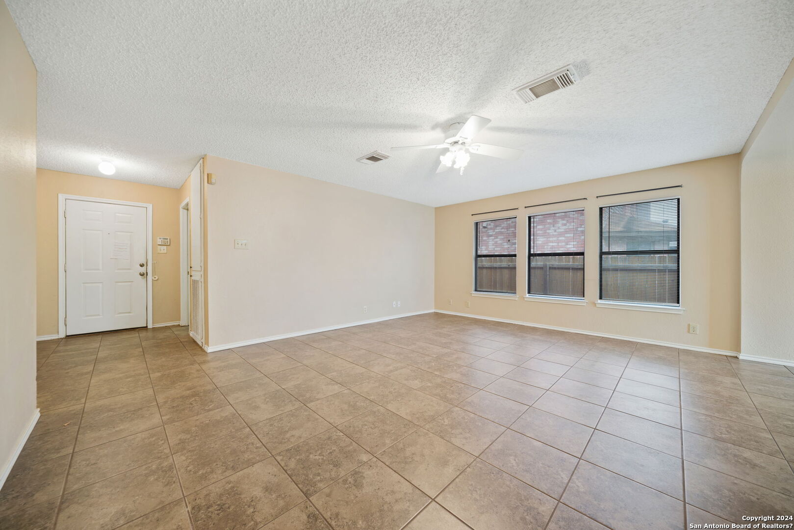 Settle into this spacious one-story home in Regency Meadow, ready for immediate move-in. Designed with an open floor plan and ceramic tile throughout, the home offers easy living and low maintenance. The living room welcomes you with arched entryways, abundant natural light, and a ceiling fan for added comfort. The eat-in kitchen is ideal for gathering, featuring a center island, ample cabinet and counter space, and a large walk-in pantry combined with the laundry room for convenience. The oversized primary bedroom provides a relaxing retreat with a generous walk-in closet and ceiling fan, while the ensuite bath includes a double vanity and tub/shower combo. Step outside to a private backyard with a patio slab and privacy fence-perfect for weekend barbecues or quiet evenings. Conveniently located near major highways, USAA, UTSA, Fiesta Texas, The Rim, La Cantera, and a variety of dining and entertainment options, this home offers both comfort and accessibility.