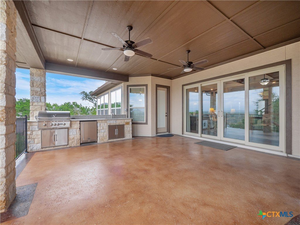 Experience the pinnacle of Hill Country living in this breathtaking estate, perfectly positioned on a private 1.1-acre cul-de-sac lot at the very top of the hill. This home masterfully combines timeless elegance with panoramic views and a backyard resort oasis. Preparing for dinner parties is a breeze in the gourmet chef's kitchen, which features Diamond Bianco granite countertops, double-stacked custom cabinetry with glass-front accents, a 36" Cafe gas cooktop, double ovens, and a signature Italian white apron sink. Retreat to the sanctuary of your primary suite to admire sweeping vistas before stepping into a spa-worthy bathroom equipped with a 71" cast iron soaking tub, a rain shower with body sprayers, and dual designer closets. The main level balances privacy and connection, showcasing rich hickory hardwood flooring, hand-selected accent tile, and soaring ceilings with rustic wood beams. The versatile floor plan includes four serene bedrooms, a light-filled sunroom, a dedicated study, and a flexible bonus room. Upstairs, the entertainment continues with a game room wired for surround sound, a dedicated media room, and a fifth bedroom or secondary office. The exterior is designed for ultimate relaxation and zero-stress maintenance. Step out to a fully equipped outdoor kitchen with stainless steel appliances and granite countertops. Take in the views while floating in the stunning Hill Savannah heated pool and spa, complete with a cascading waterfall grotto. The custom-designed landscaping features native rock and premium artificial turf, ensuring beauty without the yard work. This home is as smart as it is stunning, boasting a Whole-Home UV Water Filter System and fully paid-off energy-efficient solar panels, reducing your utility bills to an average of only $120 per month. Located in the exclusive, 24-hour guarded Copper Ridge community, you will enjoy world-class amenities including a resort-style pool, tennis courts, and a grand pavilion.