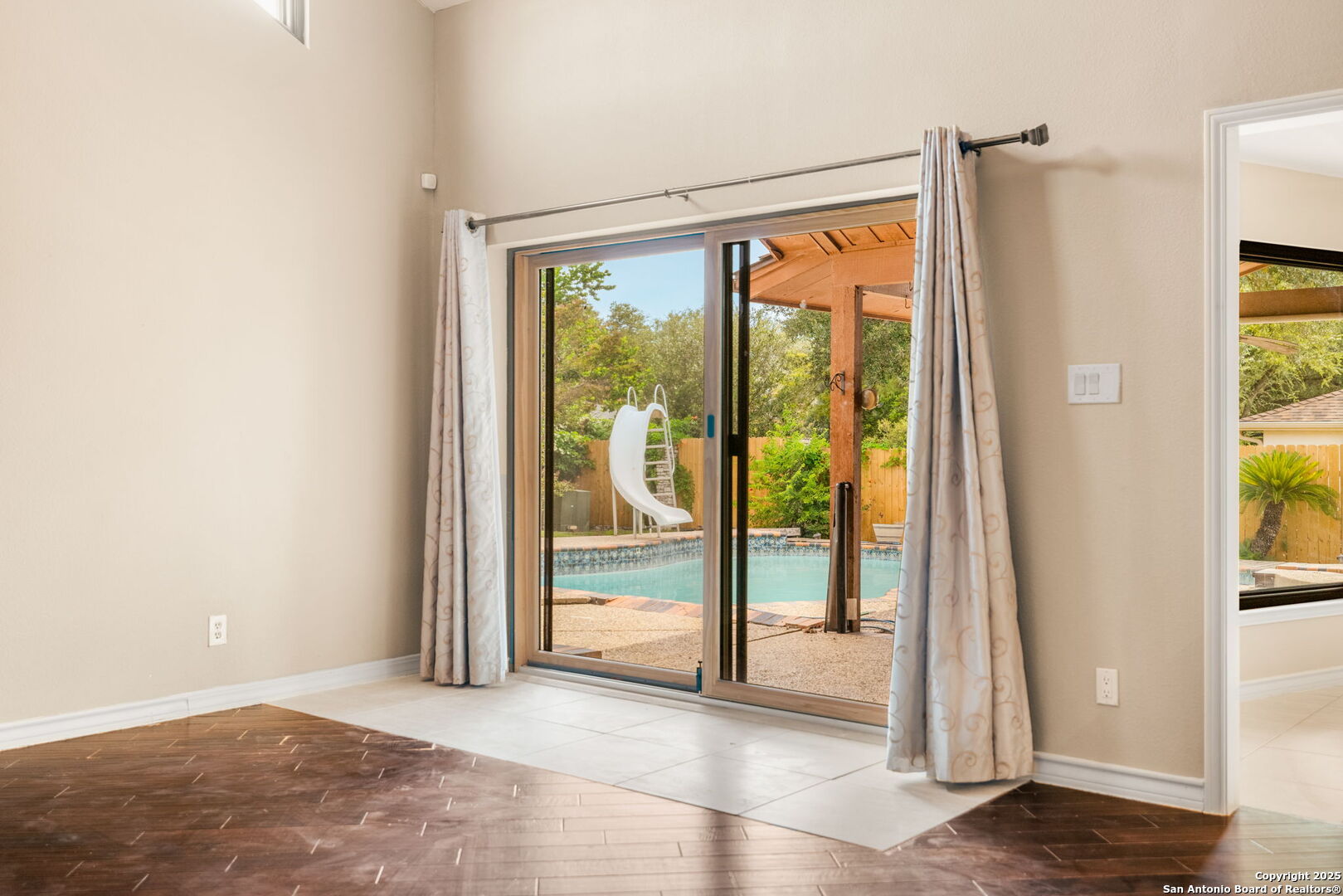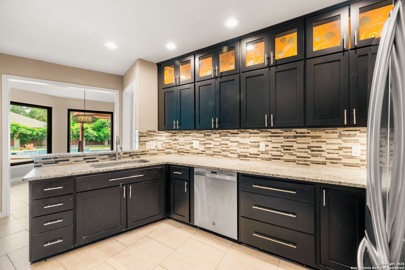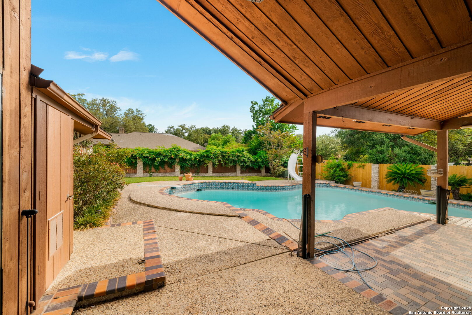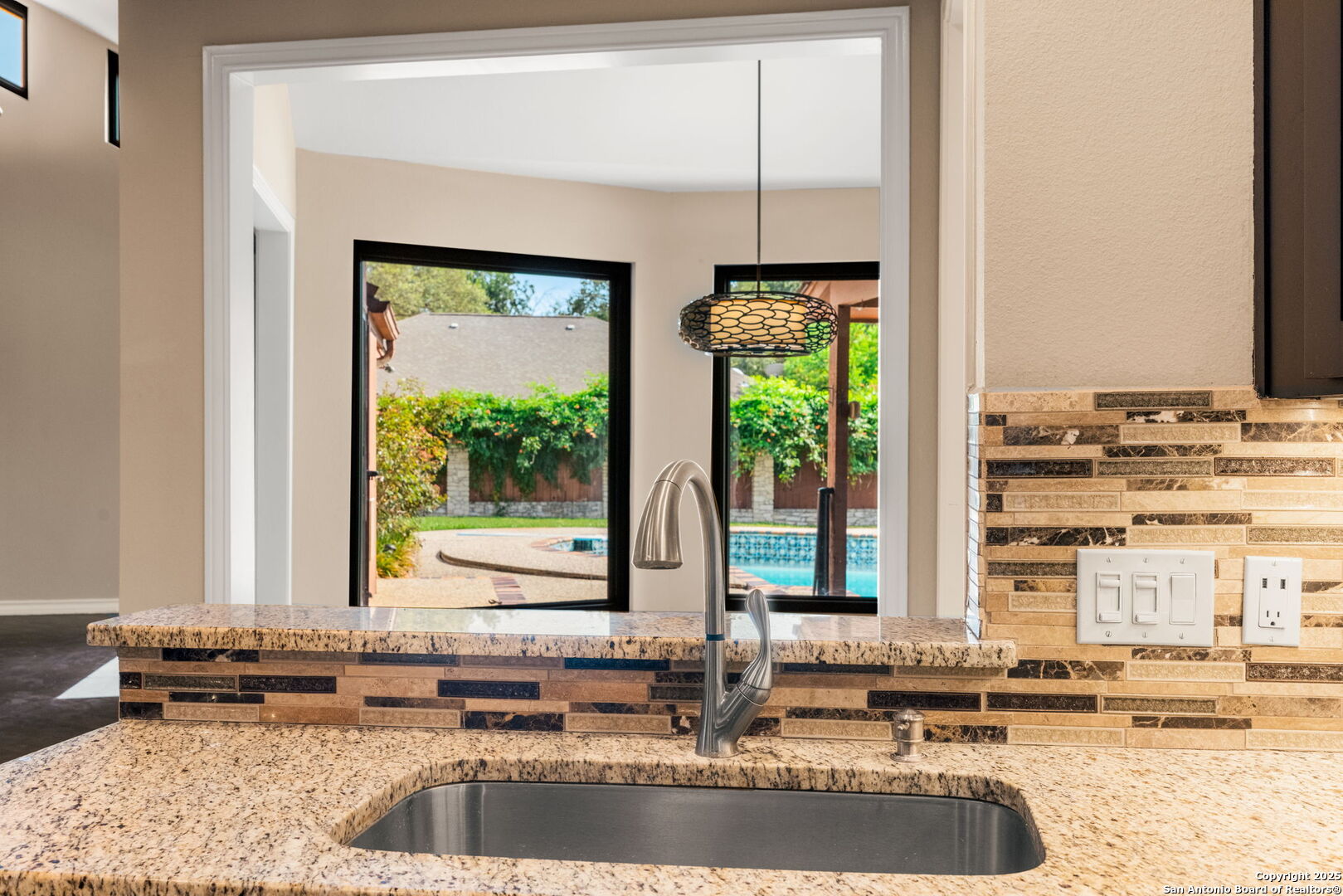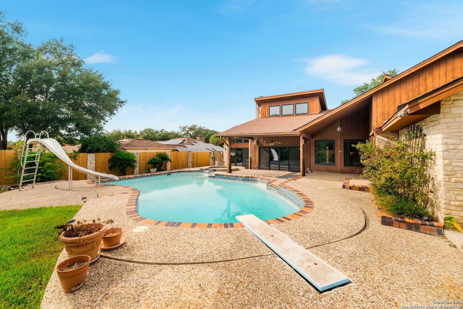 Corner lot * 3-car side-entry garage * Pool, spa & covered patio * New windows (2024) * 3,481 sq ft single-story with loft Situated on a spacious corner lot, this beautifully updated one-story home with loft combines generous living space, modern updates, and resort-style outdoor amenities. Offering 3,481 sq ft, the flexible layout includes 4 large bedrooms and 3 full baths-all freshly painted for a bright, inviting atmosphere. The open kitchen features granite countertops, stainless steel appliances, and abundant cabinetry, flowing seamlessly into two living areas with vaulted ceilings, a stone fireplace, and plenty of natural light. The private primary suite showcases high ceilings, dual vanities, a jetted Jacuzzi tub, walk-in shower, and oversized closet. Recent improvements include new energy-efficient windows (2024) and foundation repairs with a transferable lifetime warranty for peace of mind. Enjoy year-round entertaining in your private backyard retreat featuring a sparkling in-ground pool with slide, diving board, and attached Jacuzzi hot tub, surrounded by a covered patio ideal for outdoor dining and relaxation. A rare 3-car side-entry garage adds exceptional storage and curb appeal. Conveniently located near shopping, dining, and commuter access to Loop 1604, Hwy 151, and nearby parks, this San Antonio home offers the perfect blend of space, style, and comfort-all in a sought-after established neighborhood.