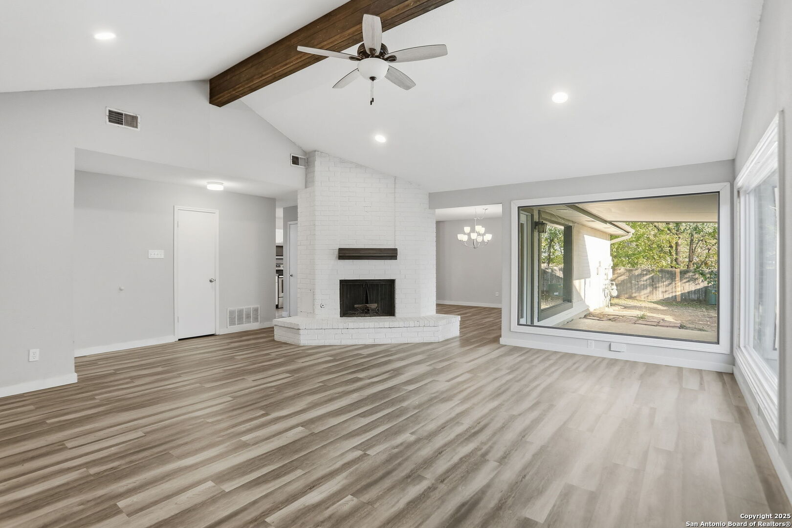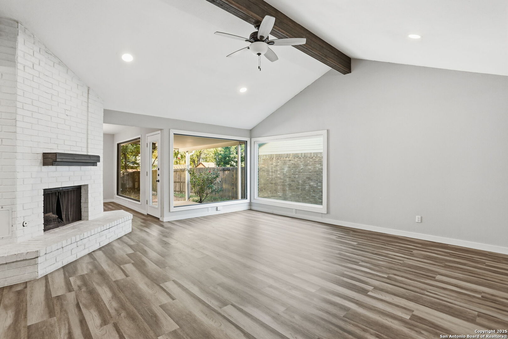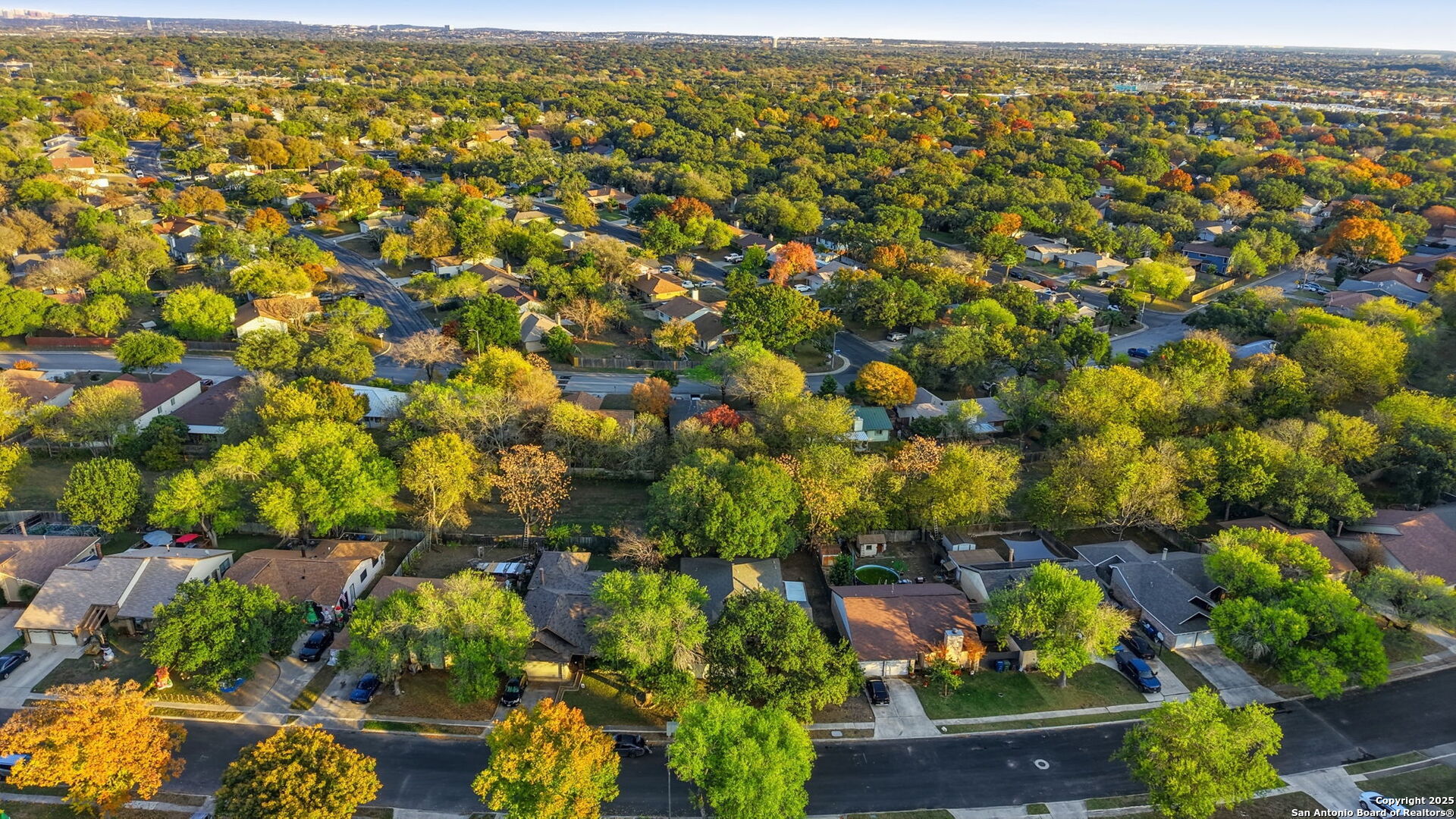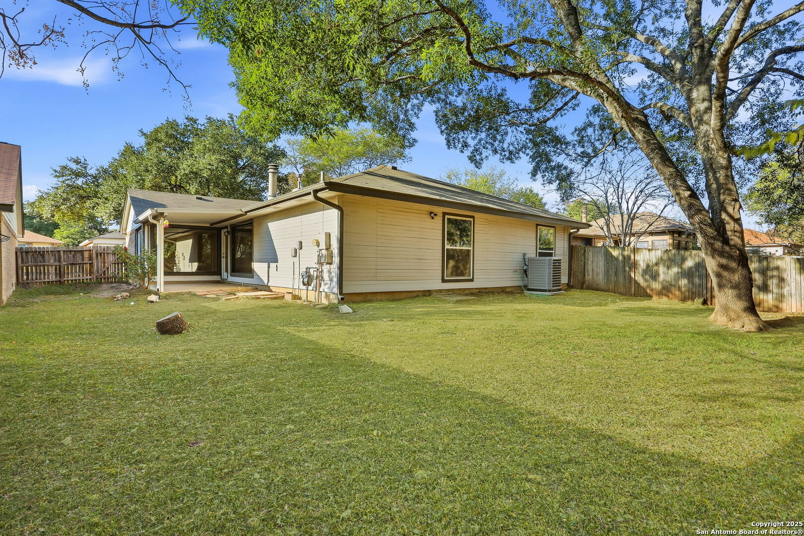 Single-story living * Greenbelt lot * Courtyard + covered patio * Near Culebra Rd and Loop 1604. This 3-bedroom, 2-bath home offers 1,798 square feet of single-story living on a fully fenced lot backing to a greenbelt. Built in 1983, the interior was remodeled in 2020 and features luxury vinyl plank flooring in the main living areas and kitchen, carpeted bedrooms, and neutral finishes throughout. Mature trees frame both the front and backyard, providing established outdoor space and privacy. The main living area includes a vaulted ceiling with exposed beam detail and a brick, wood-burning fireplace with gas starter. A separate dining area connects to the living space, while sliding glass doors provide access to the covered patio and backyard. The kitchen features white shaker-style cabinets, granite countertops, a tile backsplash, stainless steel appliances, an electric range, a built-in microwave, a dishwasher, and a deep basin sink with gooseneck faucet. The breakfast area opens to a private courtyard, creating an additional outdoor seating or dining space. The primary bathroom includes a dual vanity with stone countertop and a walk-in shower with glass enclosure. Secondary bedrooms include ceiling fans and standard closets. Additional features include a two-car garage, level lot, and a roof replaced approximately seven years ago. Located near Culebra Road and Loop 1604 with convenient access to Alamo Ranch shopping and dining. Situated in the highly regarded Northside ISD and close to parks, shopping, and dining, this home combines location, functionality, and access to community amenities. The HOA includes a pool, park and playground, sports court, BBQ grill, jogging trails, bike trails, clubhouse, tennis court, and basketball court. Includes a 3D tour or floor plan viewer. Don't miss the opportunity to make this single-story home your next move in Northwest San Antonio!
