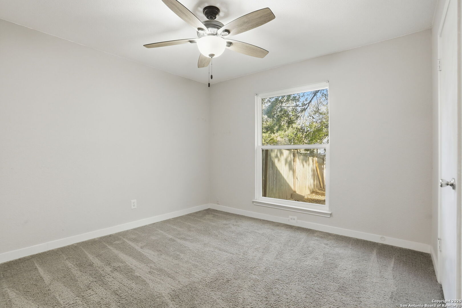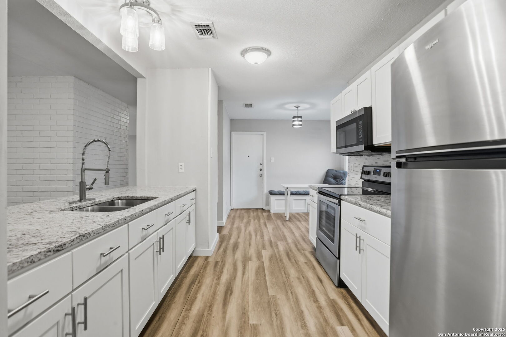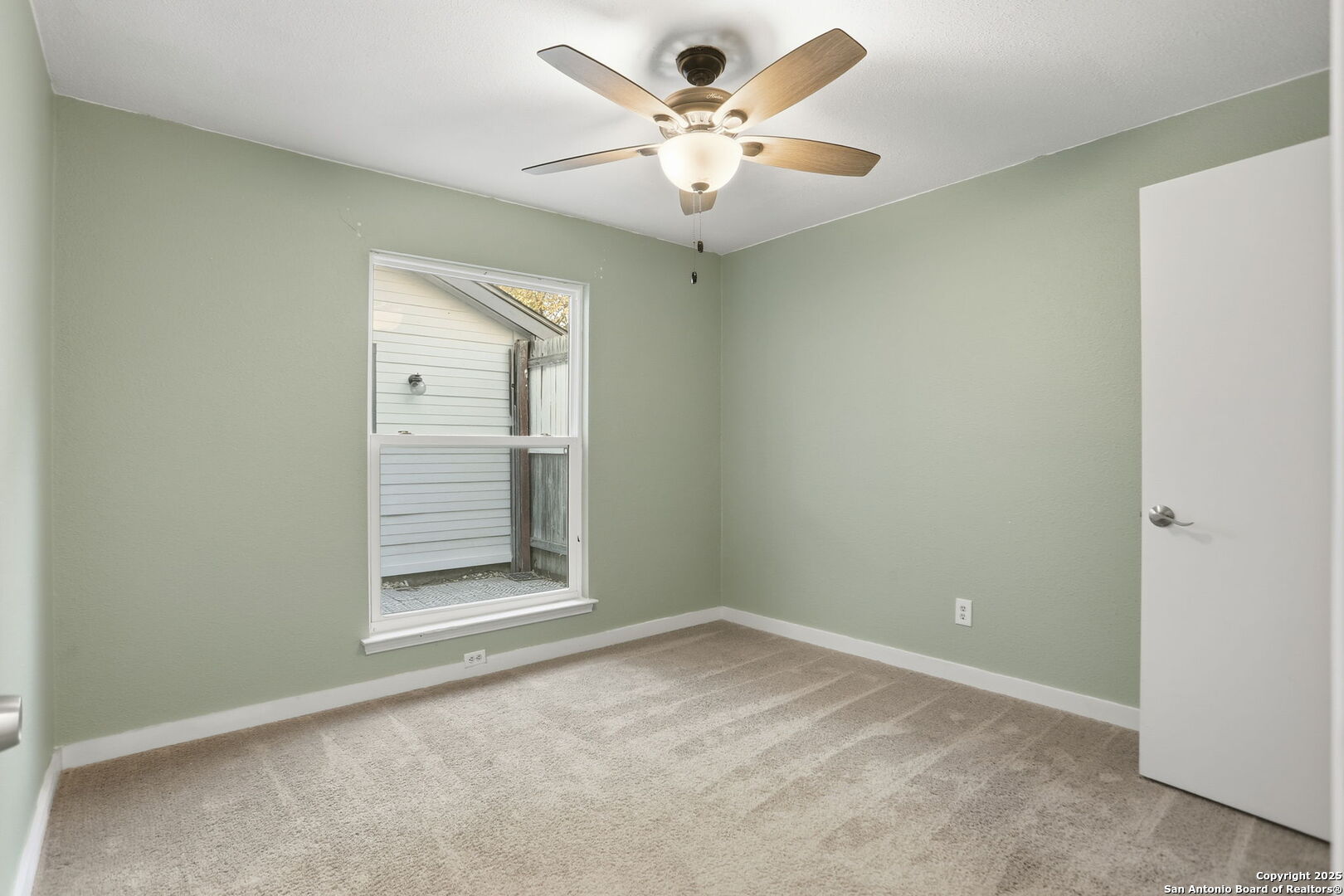 Single-story living * Greenbelt lot * Courtyard + covered patio * Near Culebra Rd and Loop 1604. This 3-bedroom, 2-bath home offers 1,798 square feet of single-story living on a fully fenced lot backing to a greenbelt. Built in 1983, the interior was remodeled in 2020 and features luxury vinyl plank flooring in the main living areas and kitchen, carpeted bedrooms, and neutral finishes throughout. Mature trees frame both the front and backyard, providing established outdoor space and privacy. The main living area includes a vaulted ceiling with exposed beam detail and a brick, wood-burning fireplace with gas starter. A separate dining area connects to the living space, while sliding glass doors provide access to the covered patio and backyard. The kitchen features white shaker-style cabinets, granite countertops, a tile backsplash, stainless steel appliances, an electric range, a built-in microwave, a dishwasher, and a deep basin sink with gooseneck faucet. The breakfast area opens to a private courtyard, creating an additional outdoor seating or dining space. The primary bathroom includes a dual vanity with stone countertop and a walk-in shower with glass enclosure. Secondary bedrooms include ceiling fans and standard closets. Additional features include a two-car garage, level lot, and a roof replaced approximately seven years ago. Located near Culebra Road and Loop 1604 with convenient access to Alamo Ranch shopping and dining. Situated in the highly regarded Northside ISD and close to parks, shopping, and dining, this home combines location, functionality, and access to community amenities. The HOA includes a pool, park and playground, sports court, BBQ grill, jogging trails, bike trails, clubhouse, tennis court, and basketball court. Includes a 3D tour or floor plan viewer. Don't miss the opportunity to make this single-story home your next move in Northwest San Antonio!